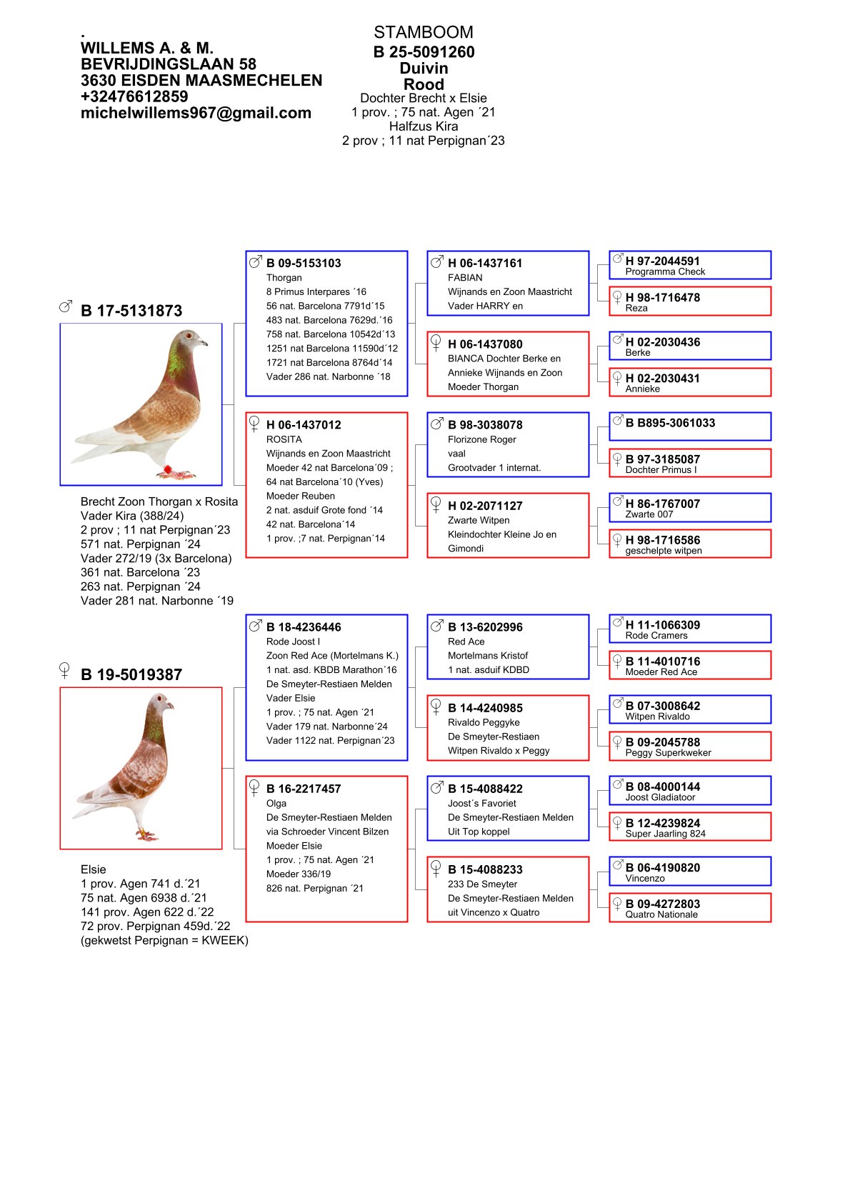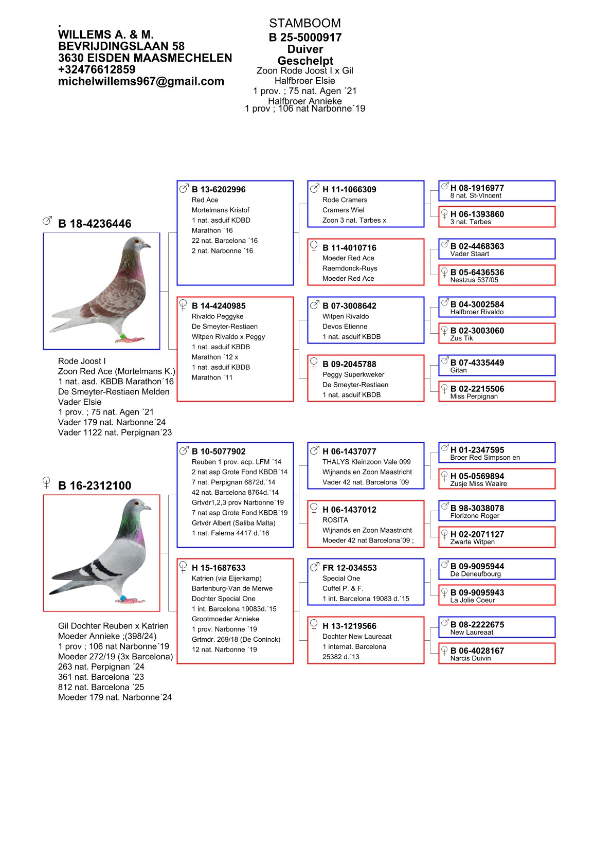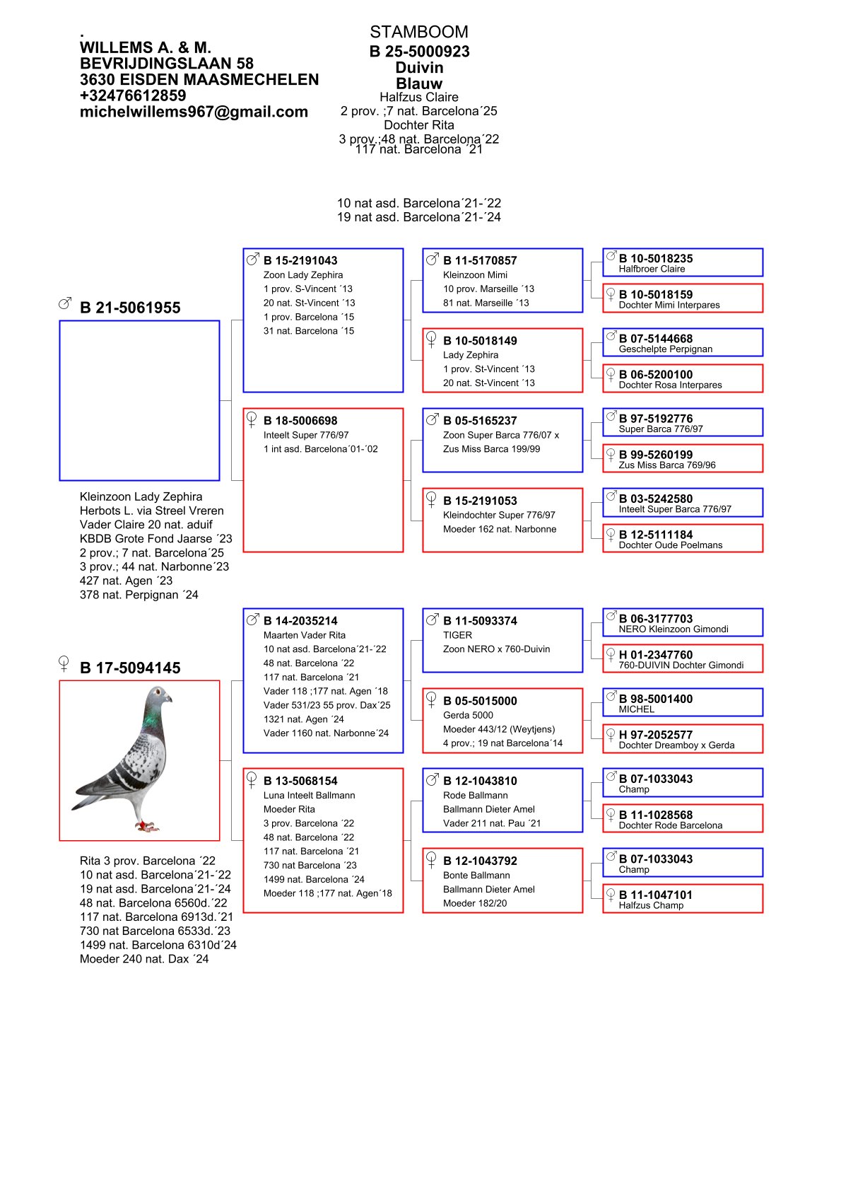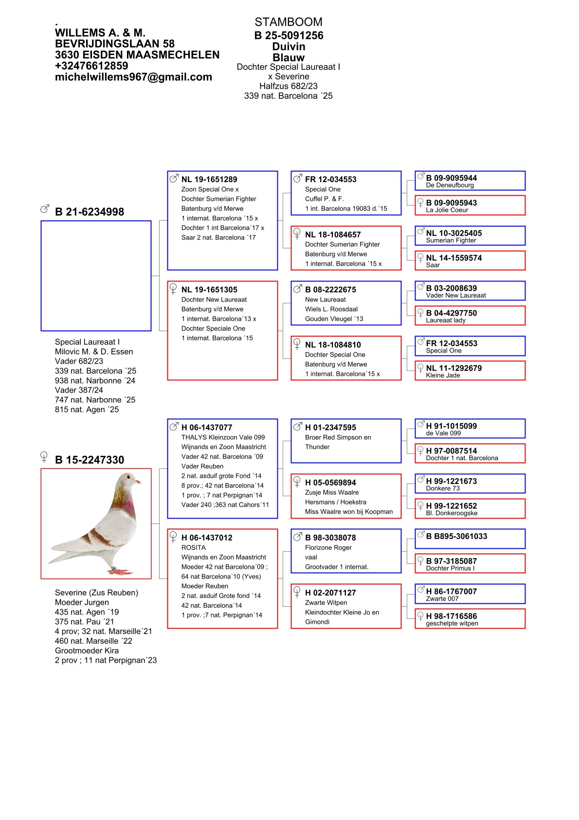 In 30 jaar (zware-)fondspel ongeveer evenveel overwinningen op provinciaal, nationaal of internationaal niveau! Dit met een simpel systeem én met een weinig gunstige ligging helemaal op de uitkant van Belgisch grondgebied. We kunnen niet anders dan erover eens zijn dat de kwaliteit van de duiven hier bovenal primeert. Een stam die nog elk jaar verder uitgeselecteerd wordt op prestaties, prachtige duiven in de hand én van zeer goede komaf. Als Willems het niet heeft, dan is het niet goed genoeg!