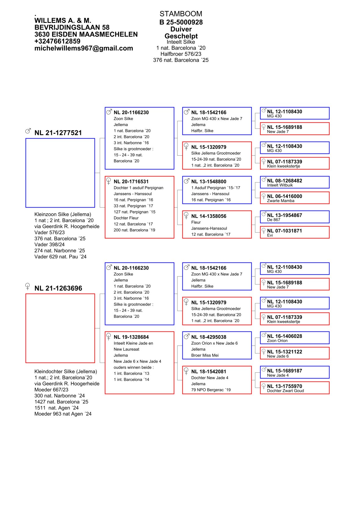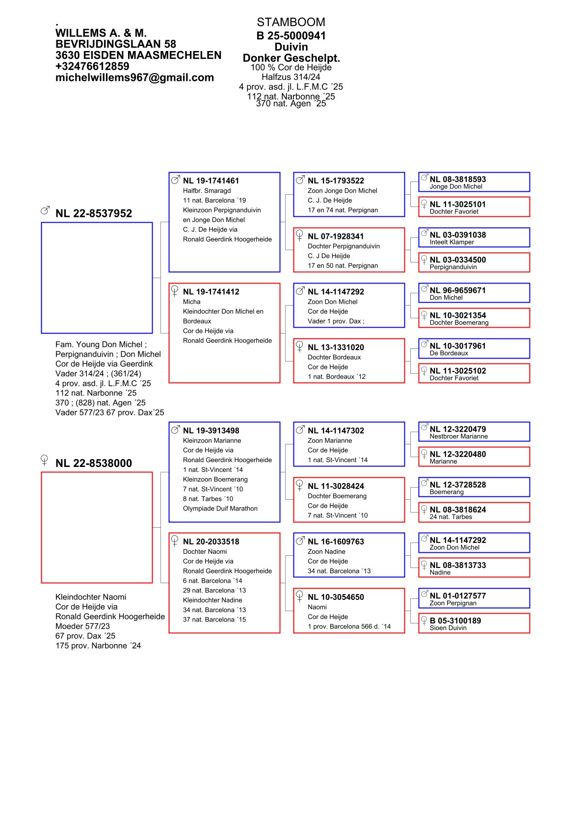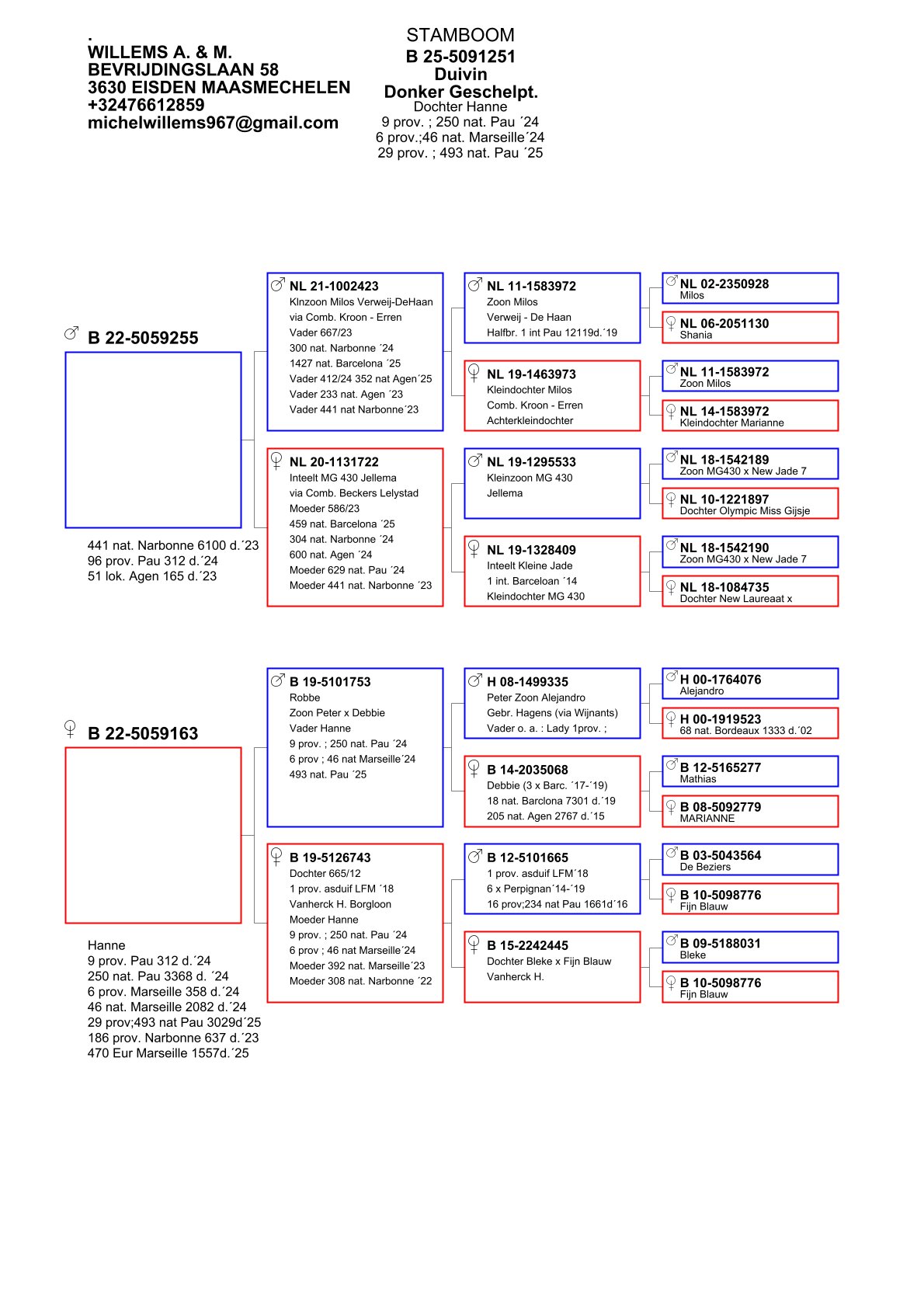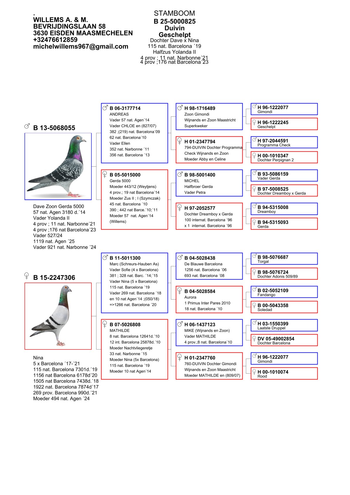 In 30 jaar (zware-)fondspel ongeveer evenveel overwinningen op provinciaal, nationaal of internationaal niveau! Dit met een simpel systeem én met een weinig gunstige ligging helemaal op de uitkant van Belgisch grondgebied. We kunnen niet anders dan erover eens zijn dat de kwaliteit van de duiven hier bovenal primeert. Een stam die nog elk jaar verder uitgeselecteerd wordt op prestaties, prachtige duiven in de hand én van zeer goede komaf. Als Willems het niet heeft, dan is het niet goed genoeg!
