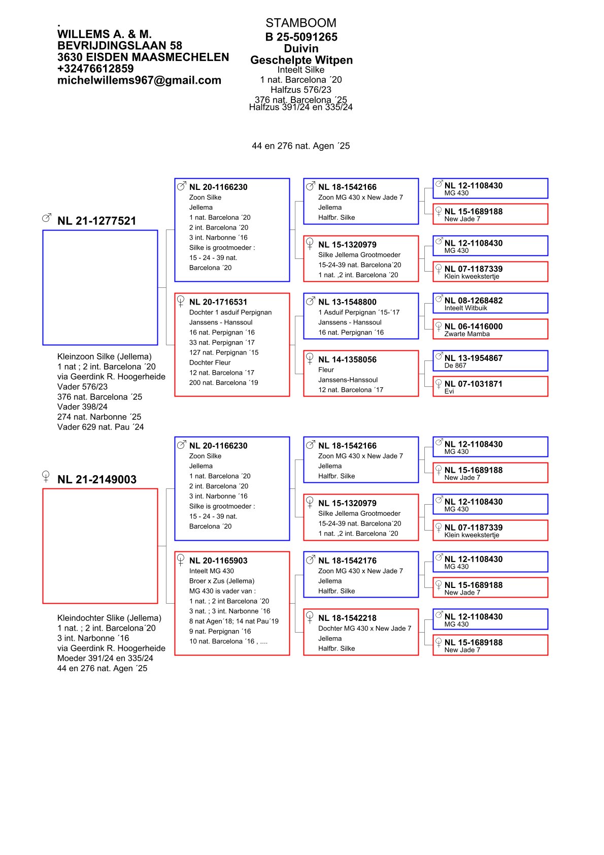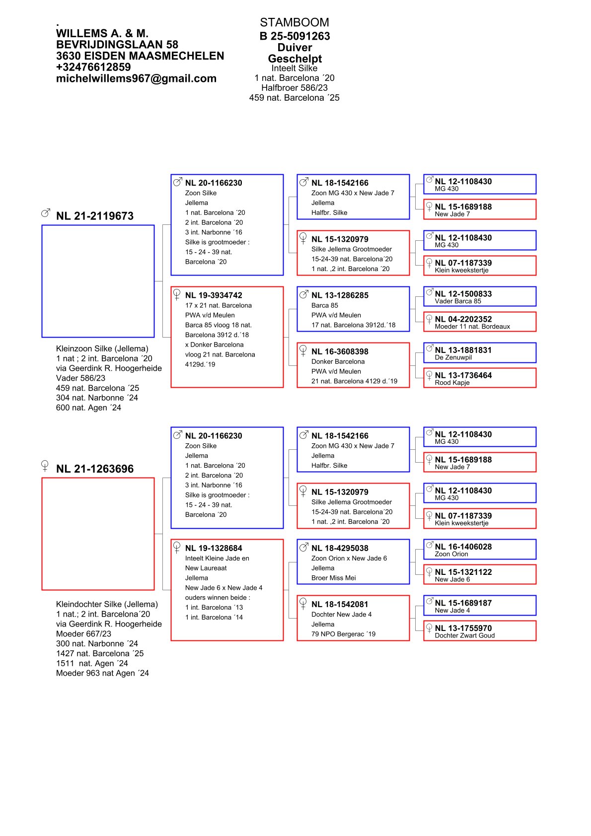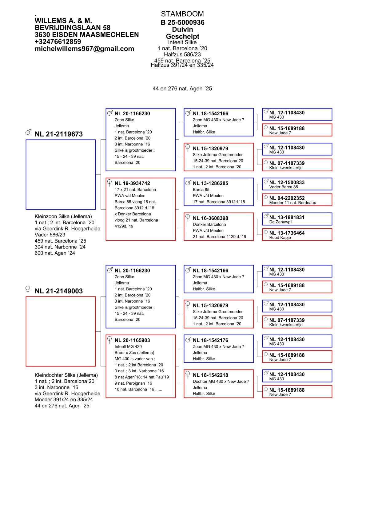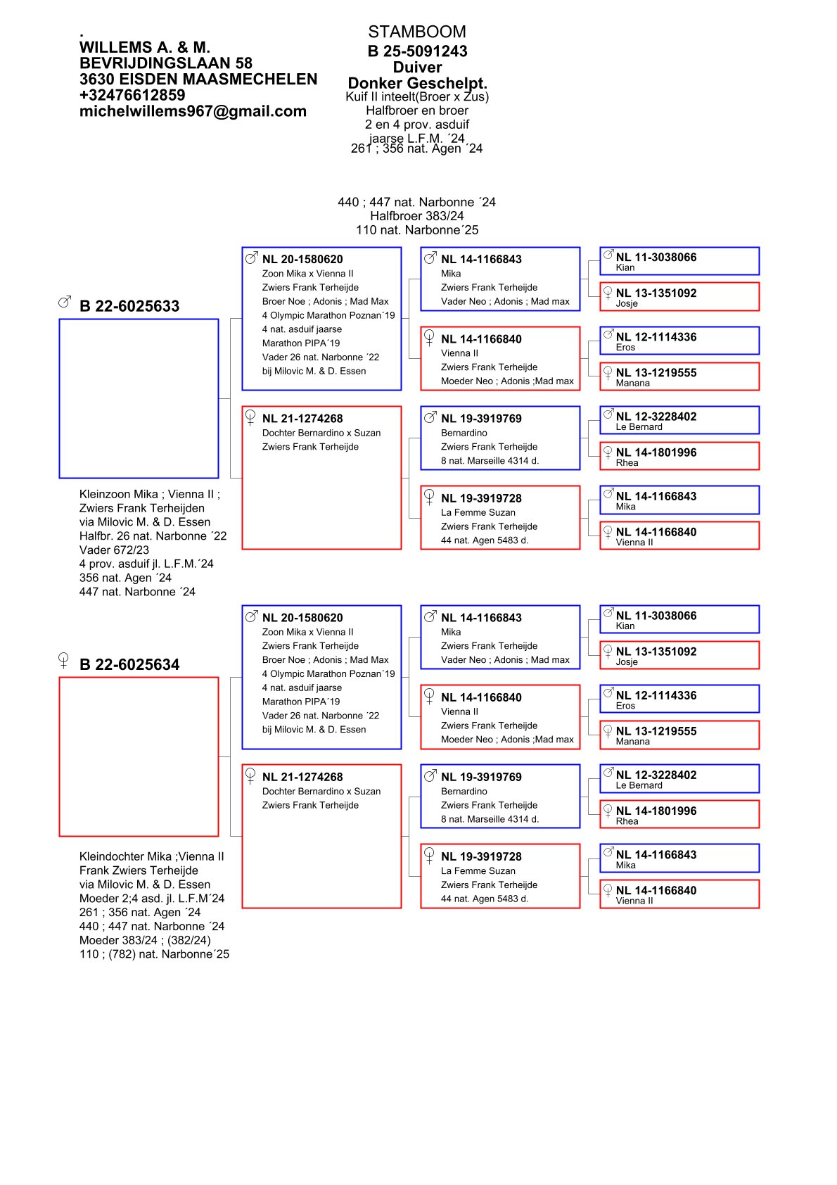 In 30 jaar (zware-)fondspel ongeveer evenveel overwinningen op provinciaal, nationaal of internationaal niveau! Dit met een simpel systeem én met een weinig gunstige ligging helemaal op de uitkant van Belgisch grondgebied. We kunnen niet anders dan erover eens zijn dat de kwaliteit van de duiven hier bovenal primeert. Een stam die nog elk jaar verder uitgeselecteerd wordt op prestaties, prachtige duiven in de hand én van zeer goede komaf. Als Willems het niet heeft, dan is het niet goed genoeg!