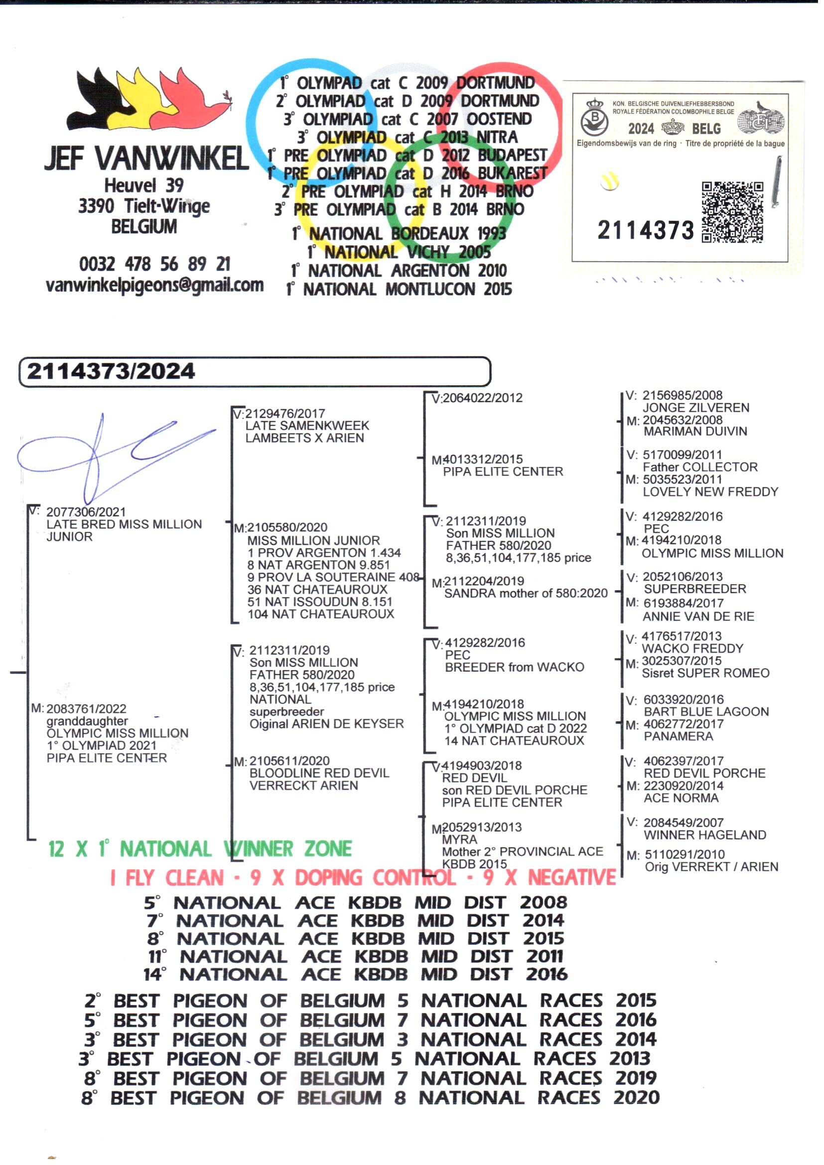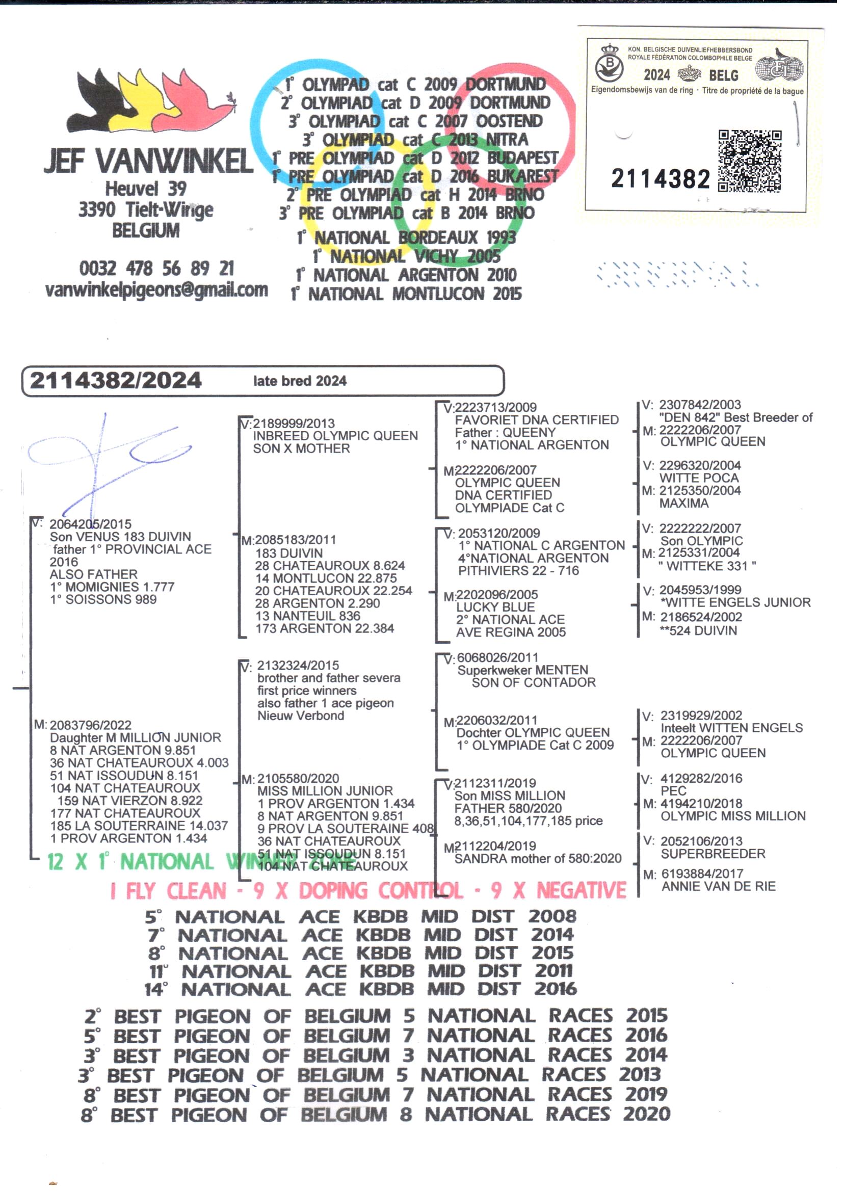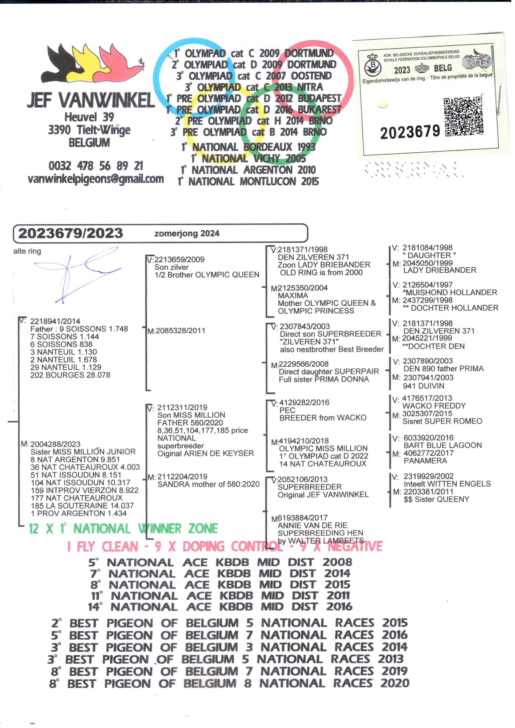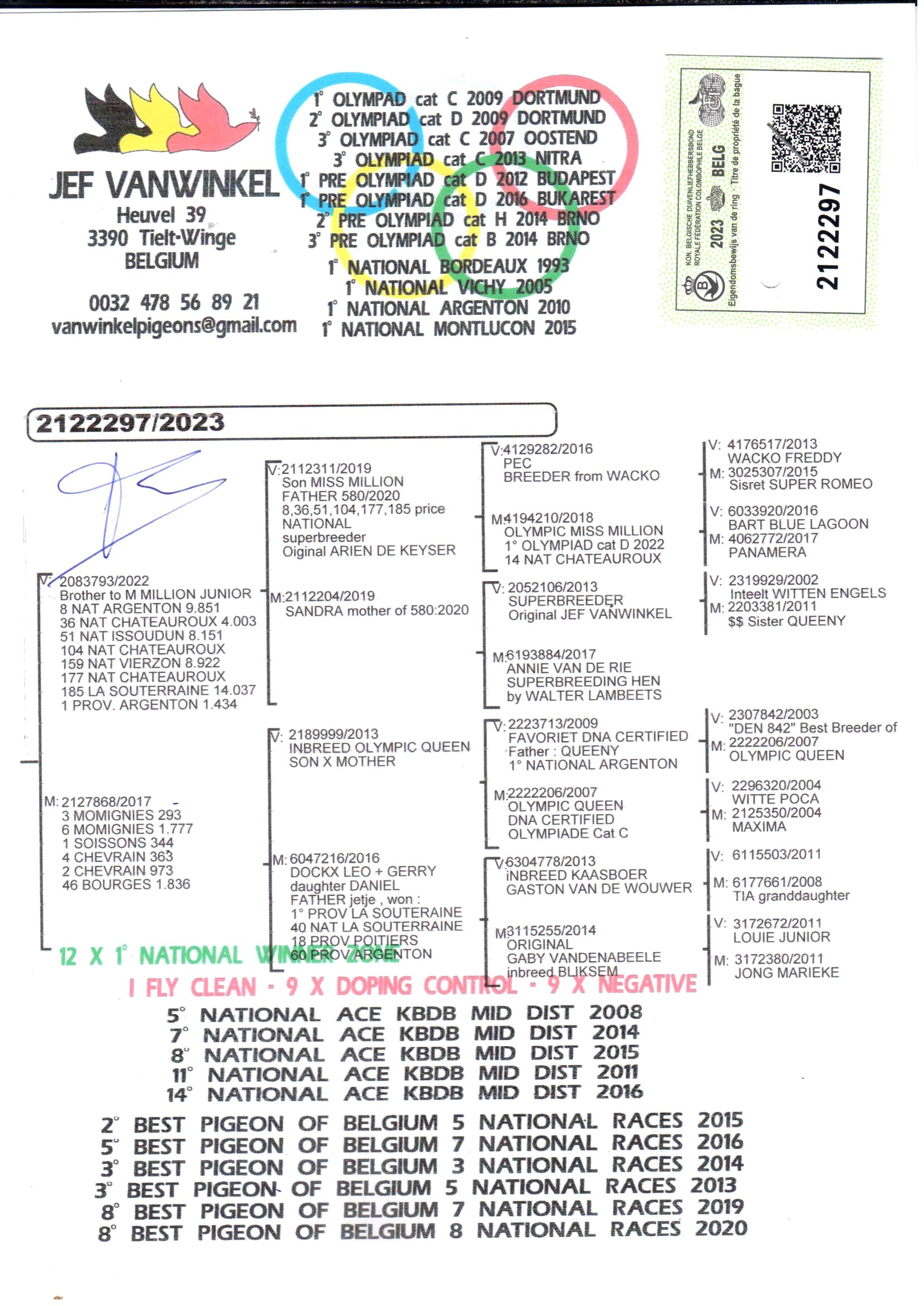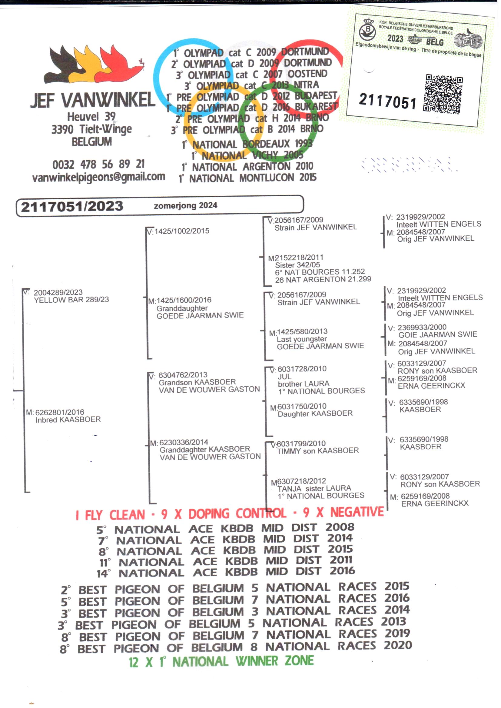 · 2° Best Pigeon of Belgium – 5 Nat races