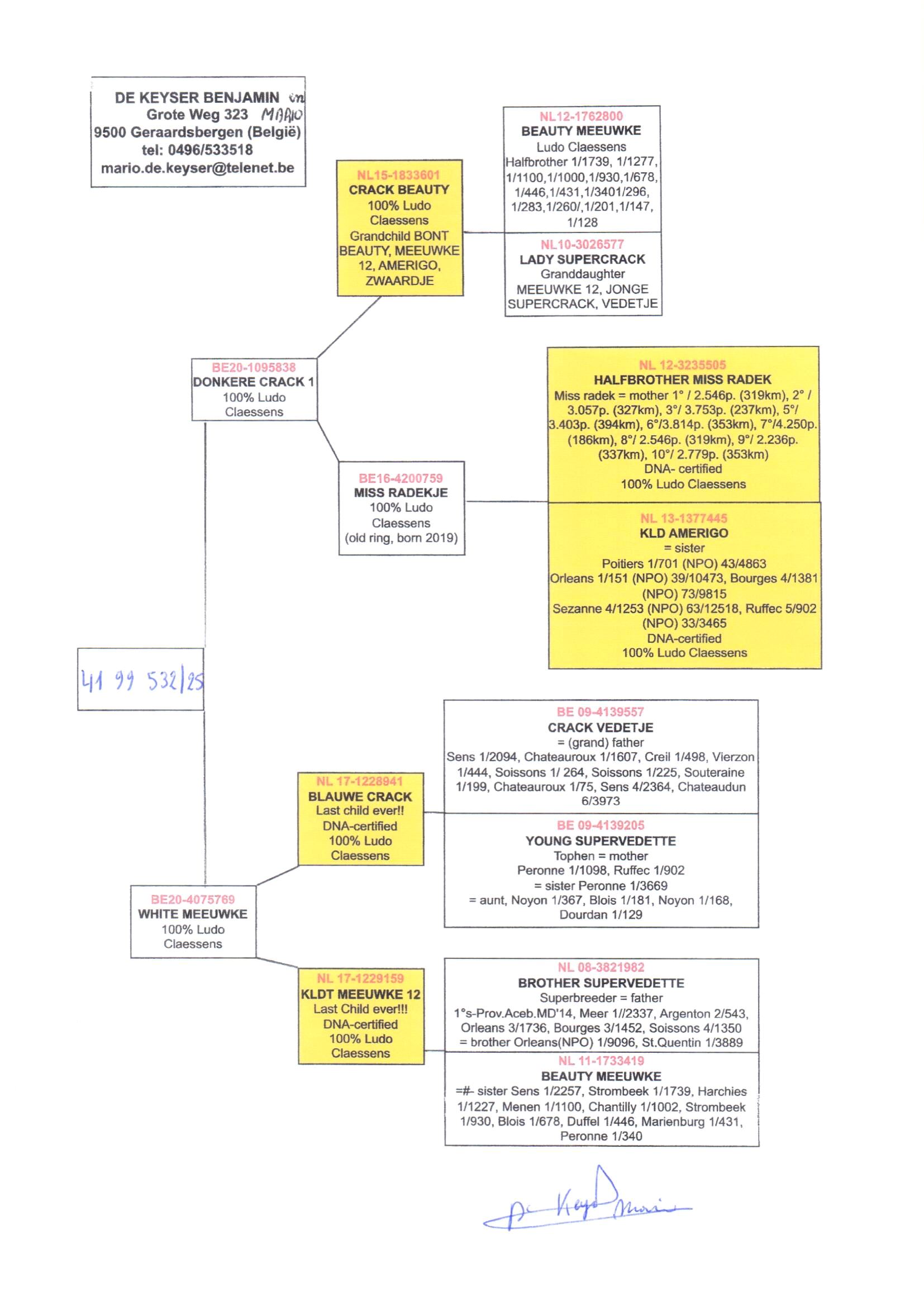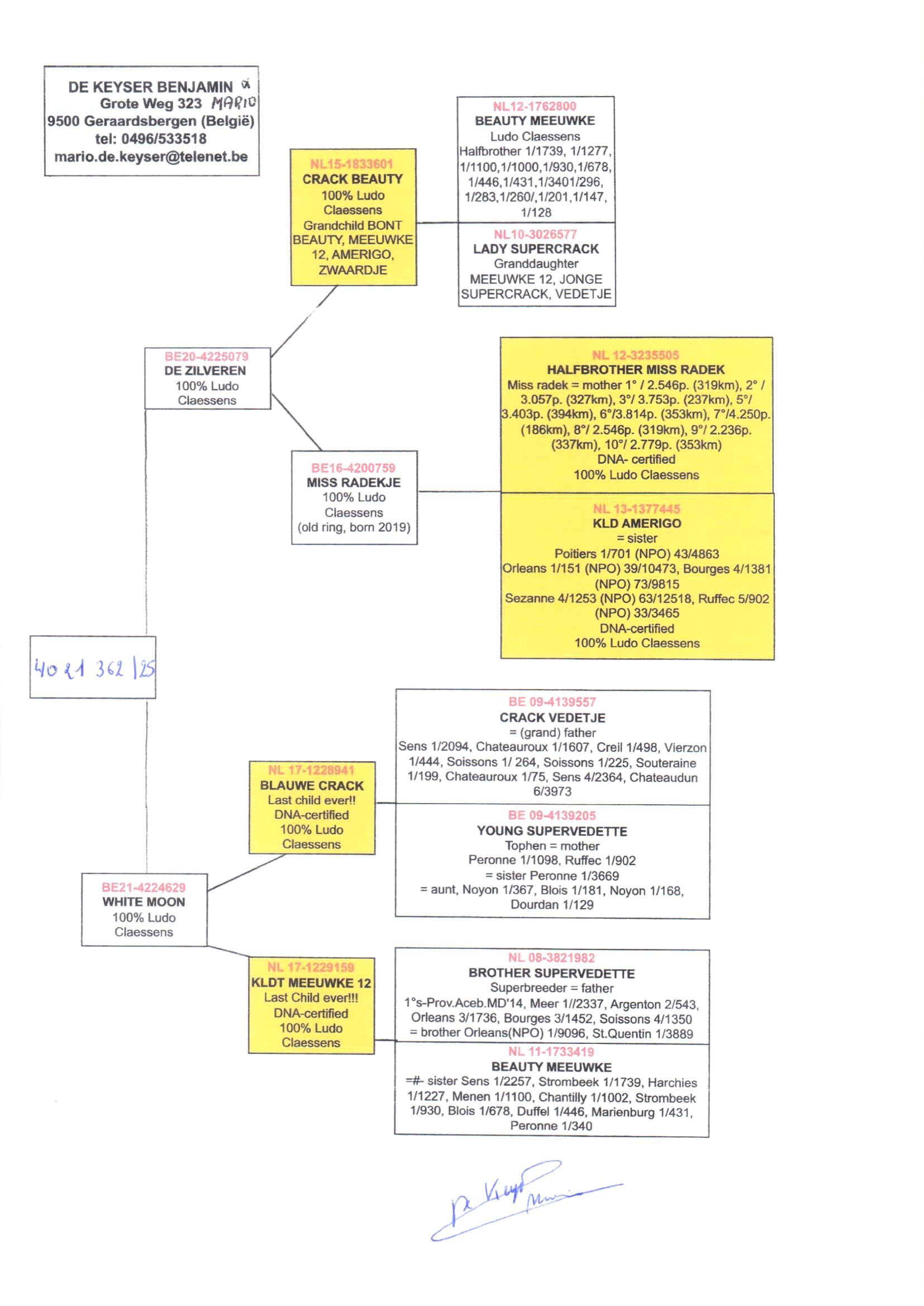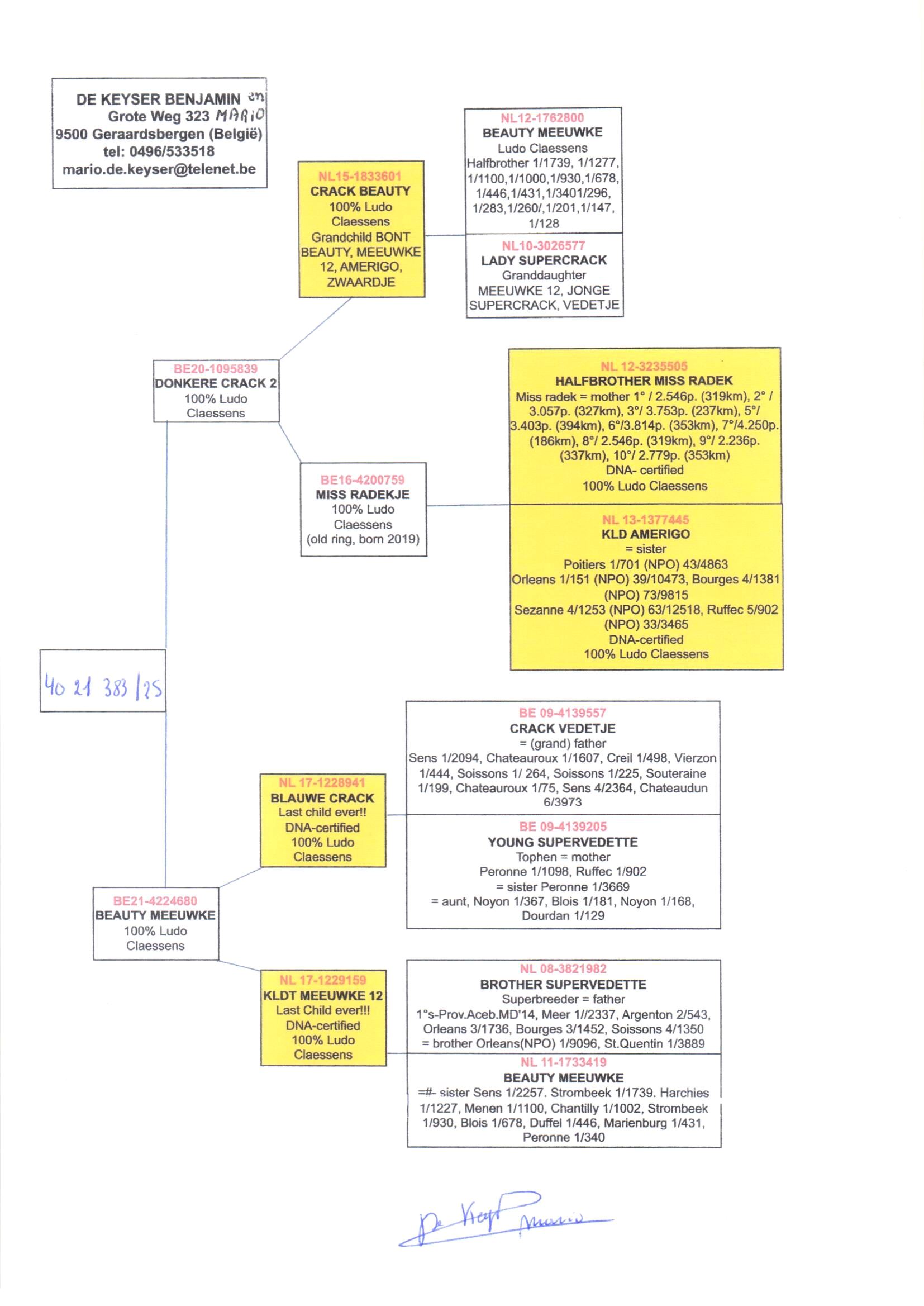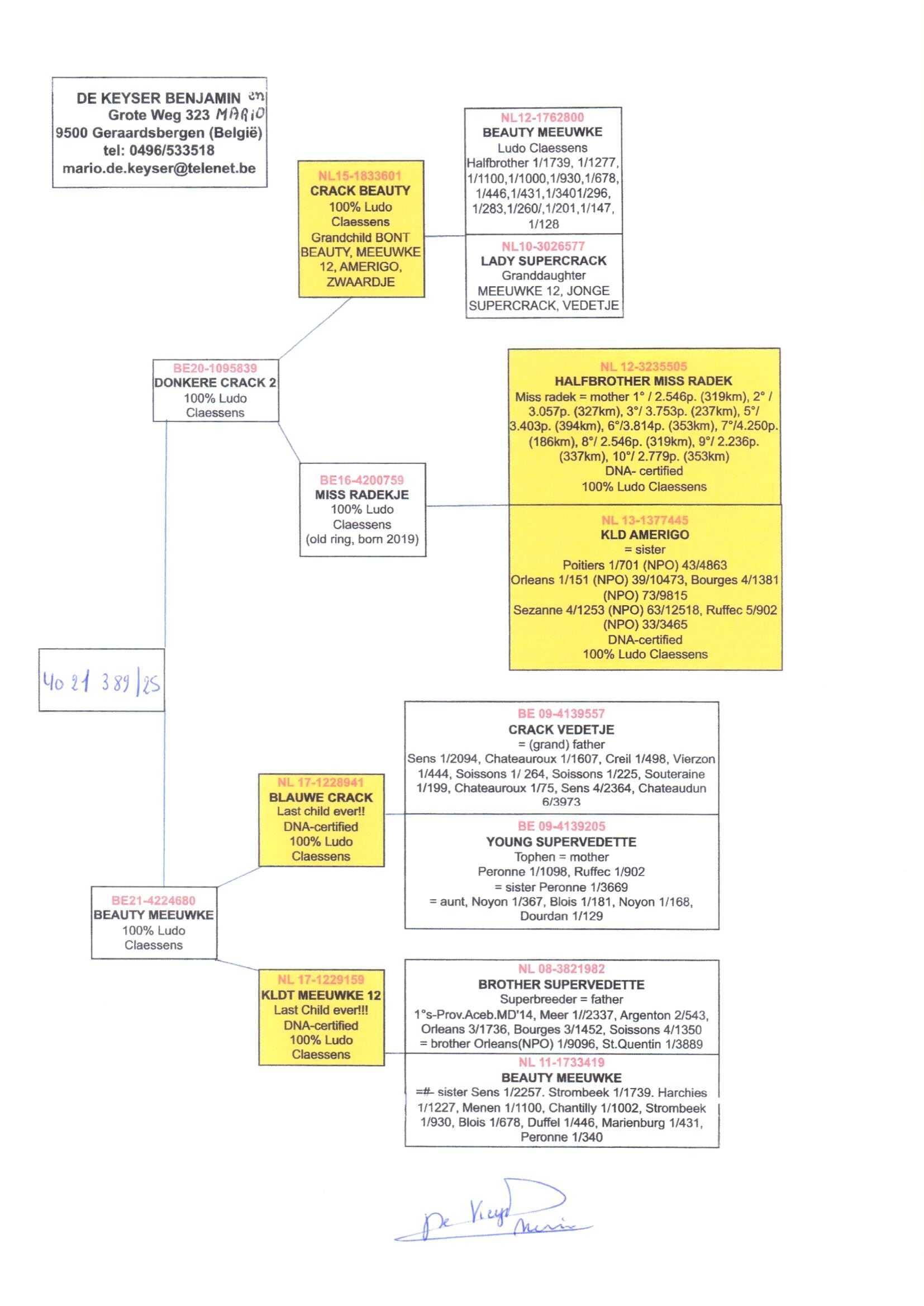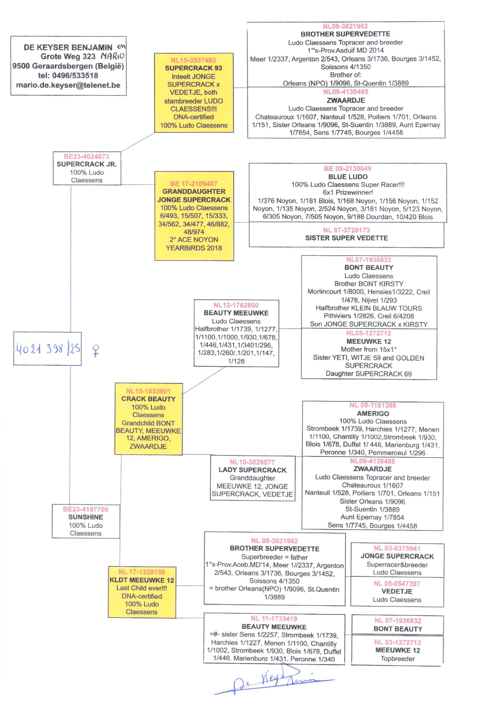 Vader is zoon van “Crack Beauty”, is kleinkind van “Bont Beauty”, “Meeuwke 12”, “Amerigo” & “Zwaardje”
