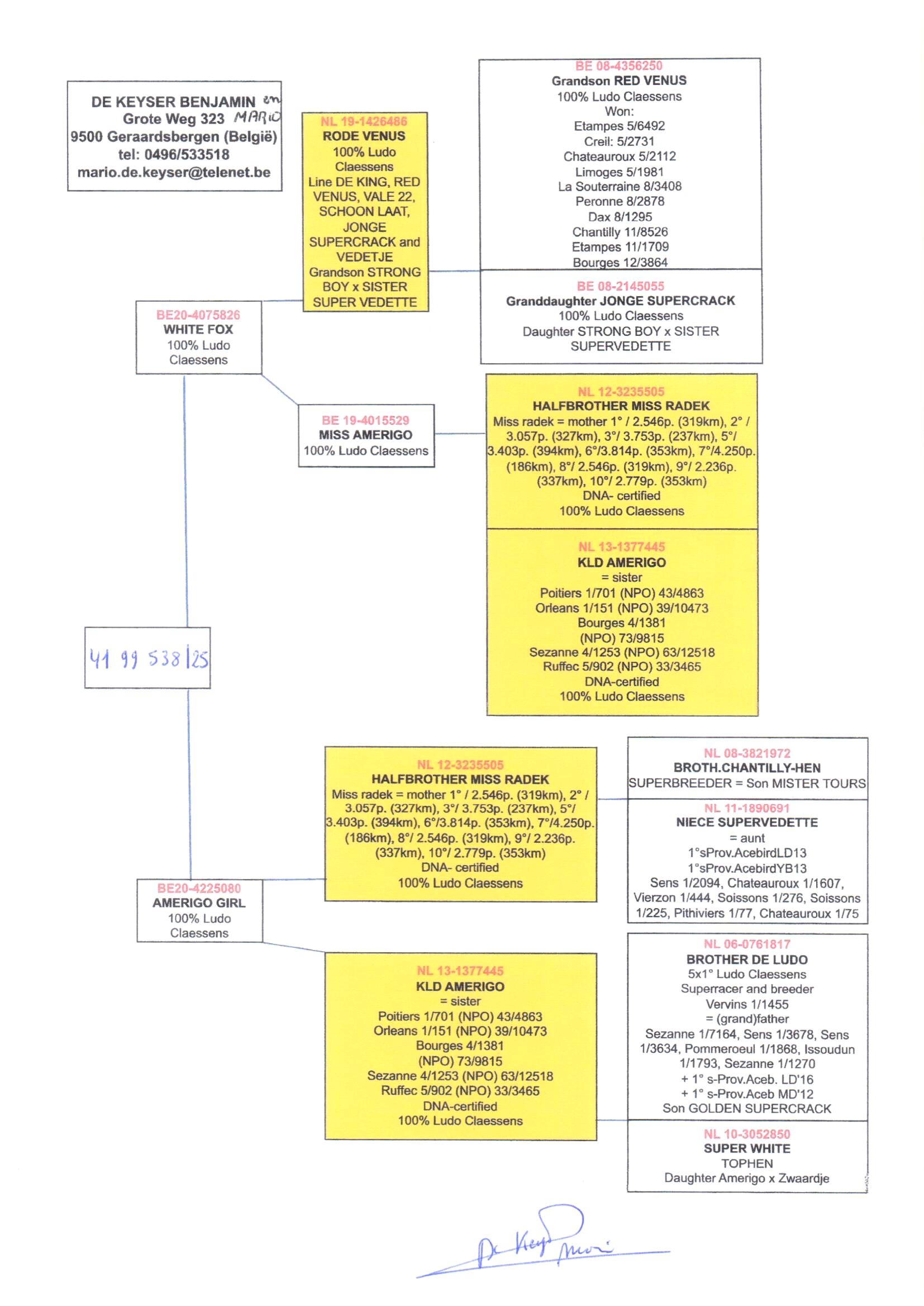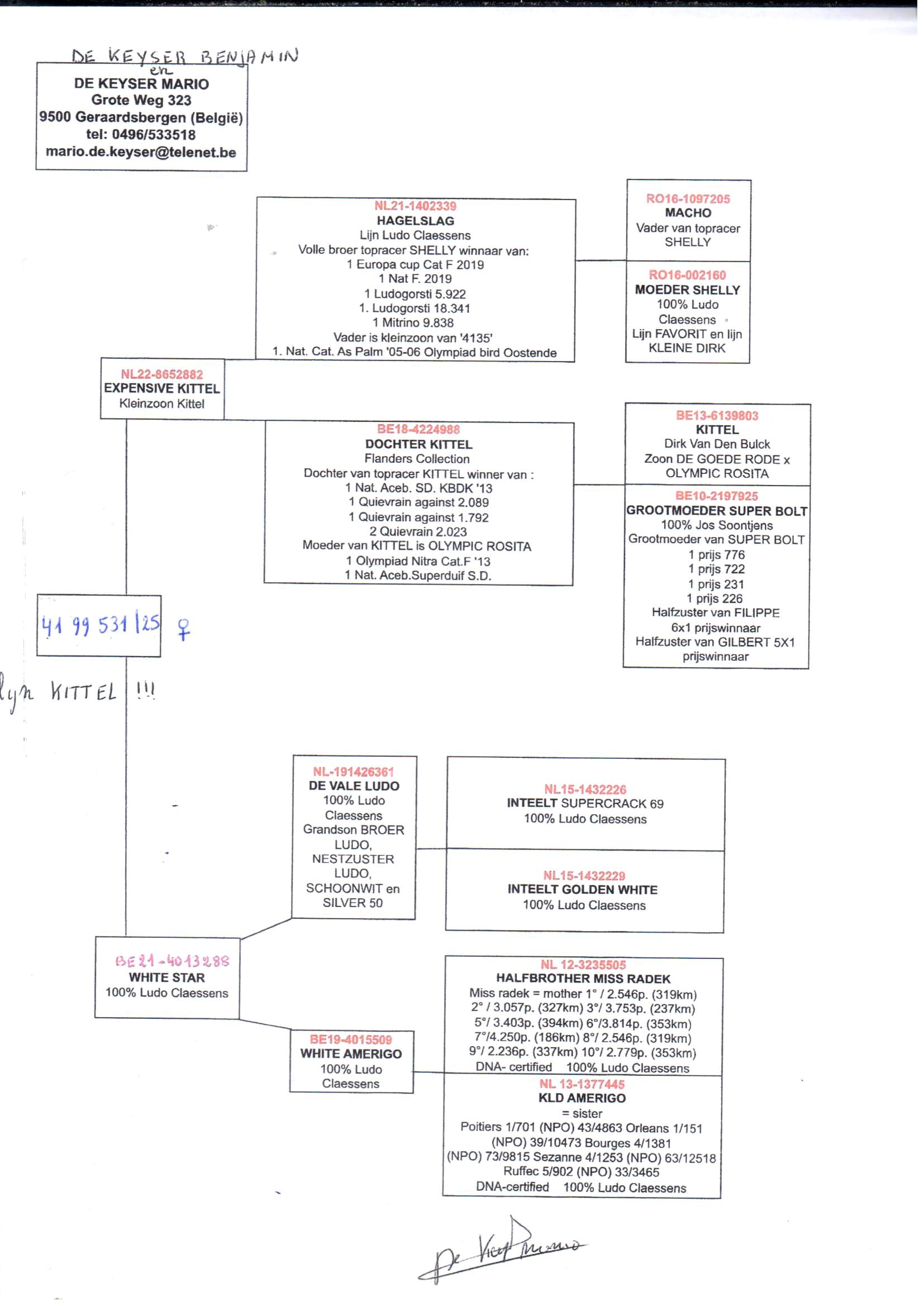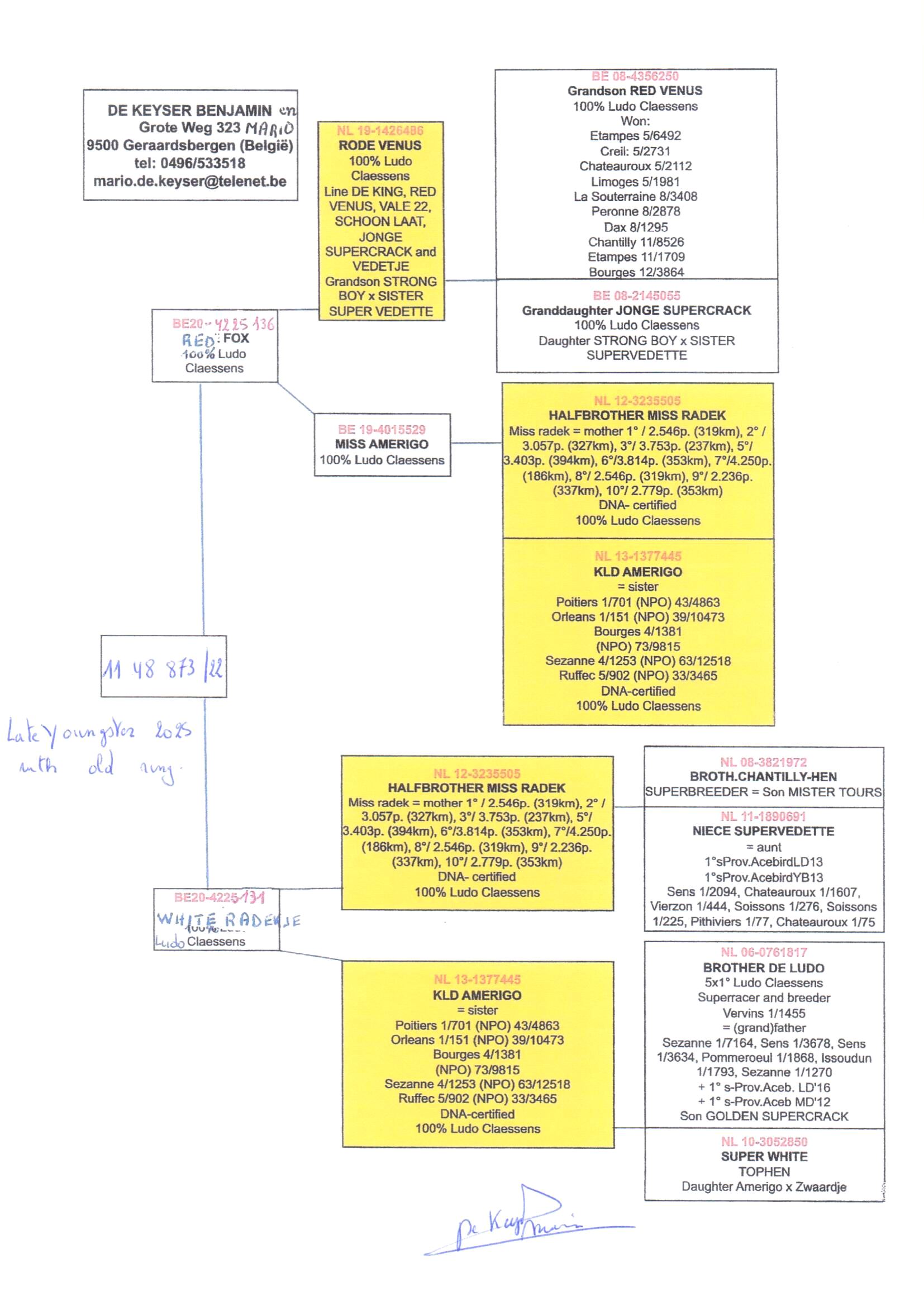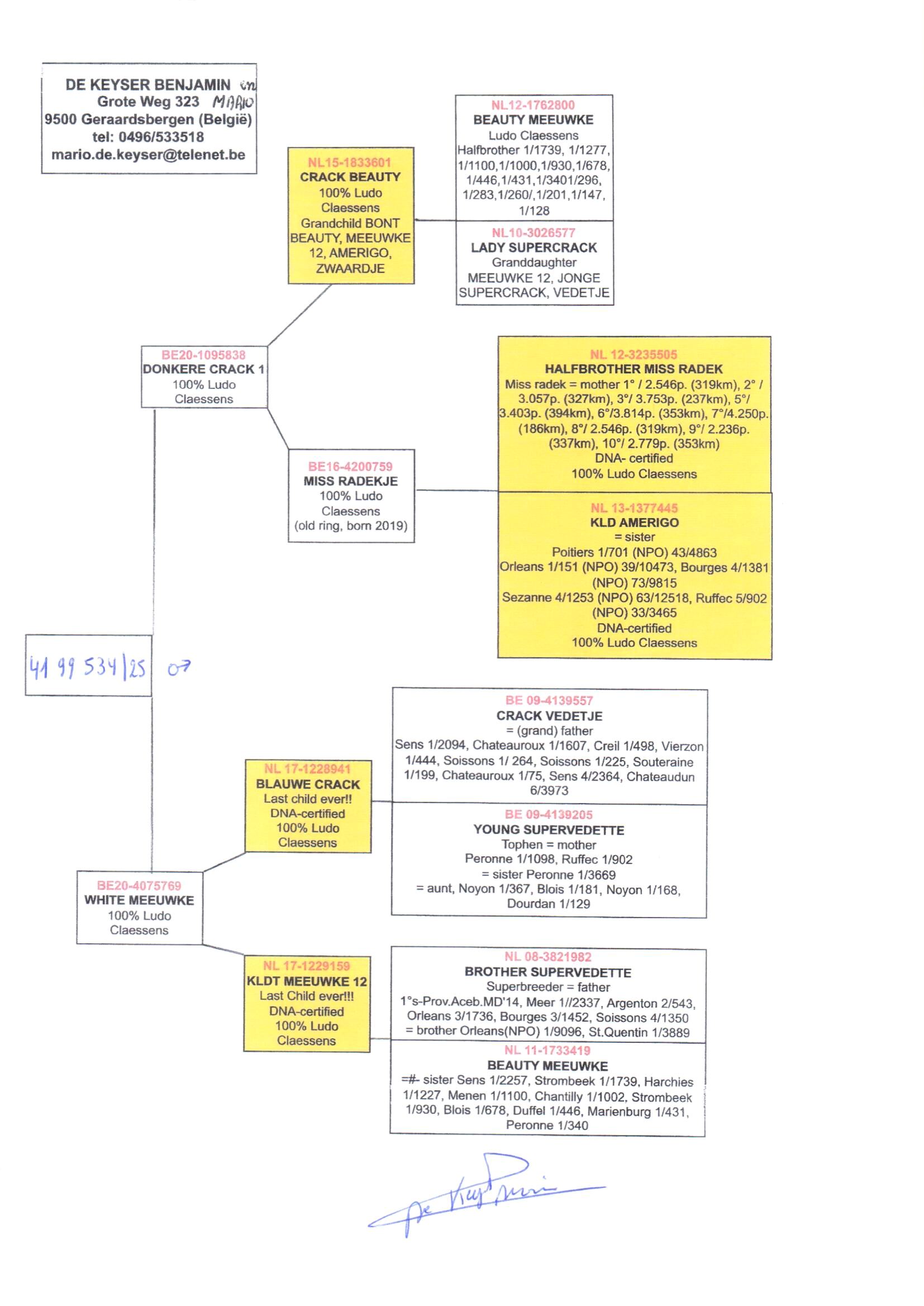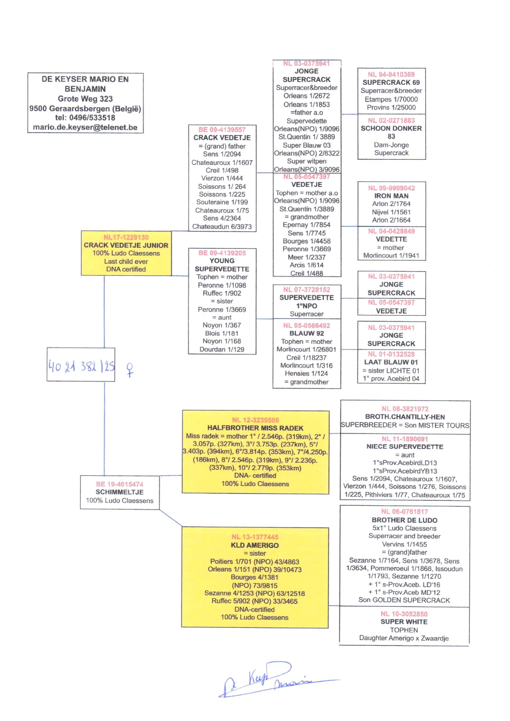 Vader is zoon van “Crack Beauty”, is kleinkind van “Bont Beauty”, “Meeuwke 12”, “Amerigo” & “Zwaardje”