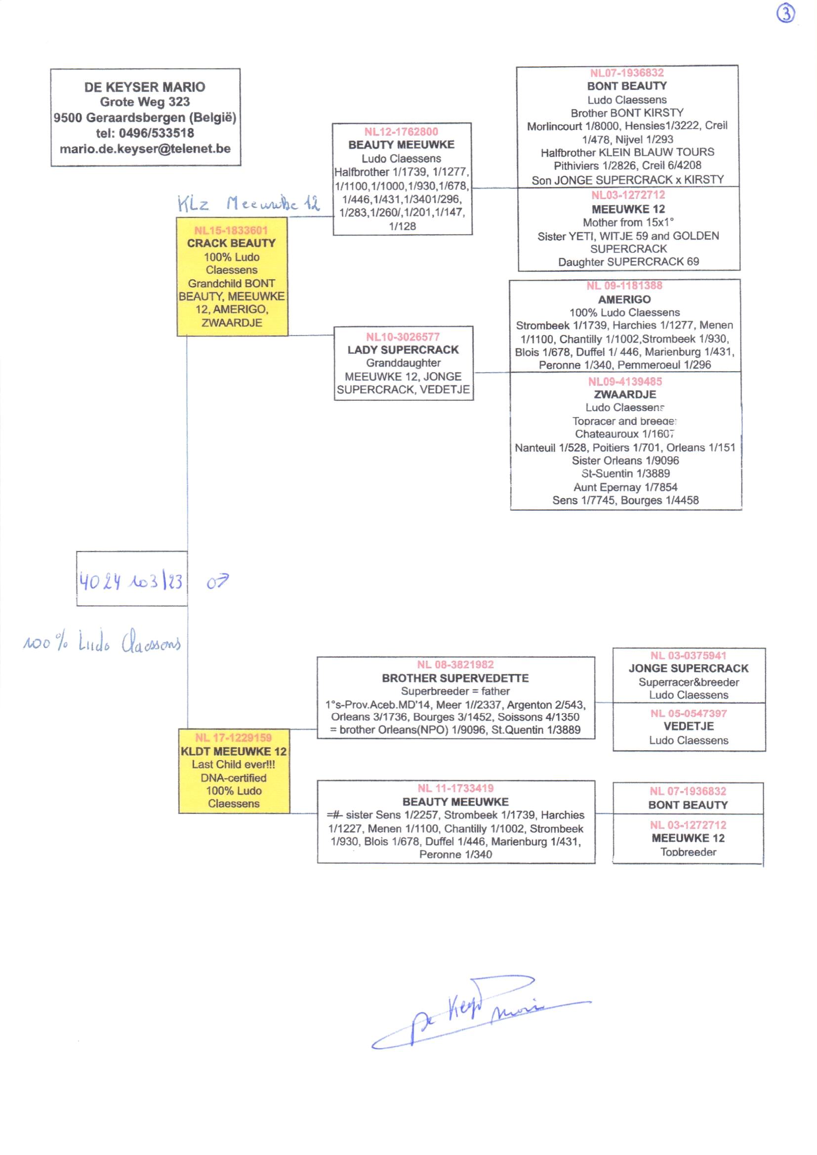 Vader is “Crack Beauty”, is kleinkind van “Bont Beauty”, “Meeuwke 12”, “Amerigo” & “Zwaardje”