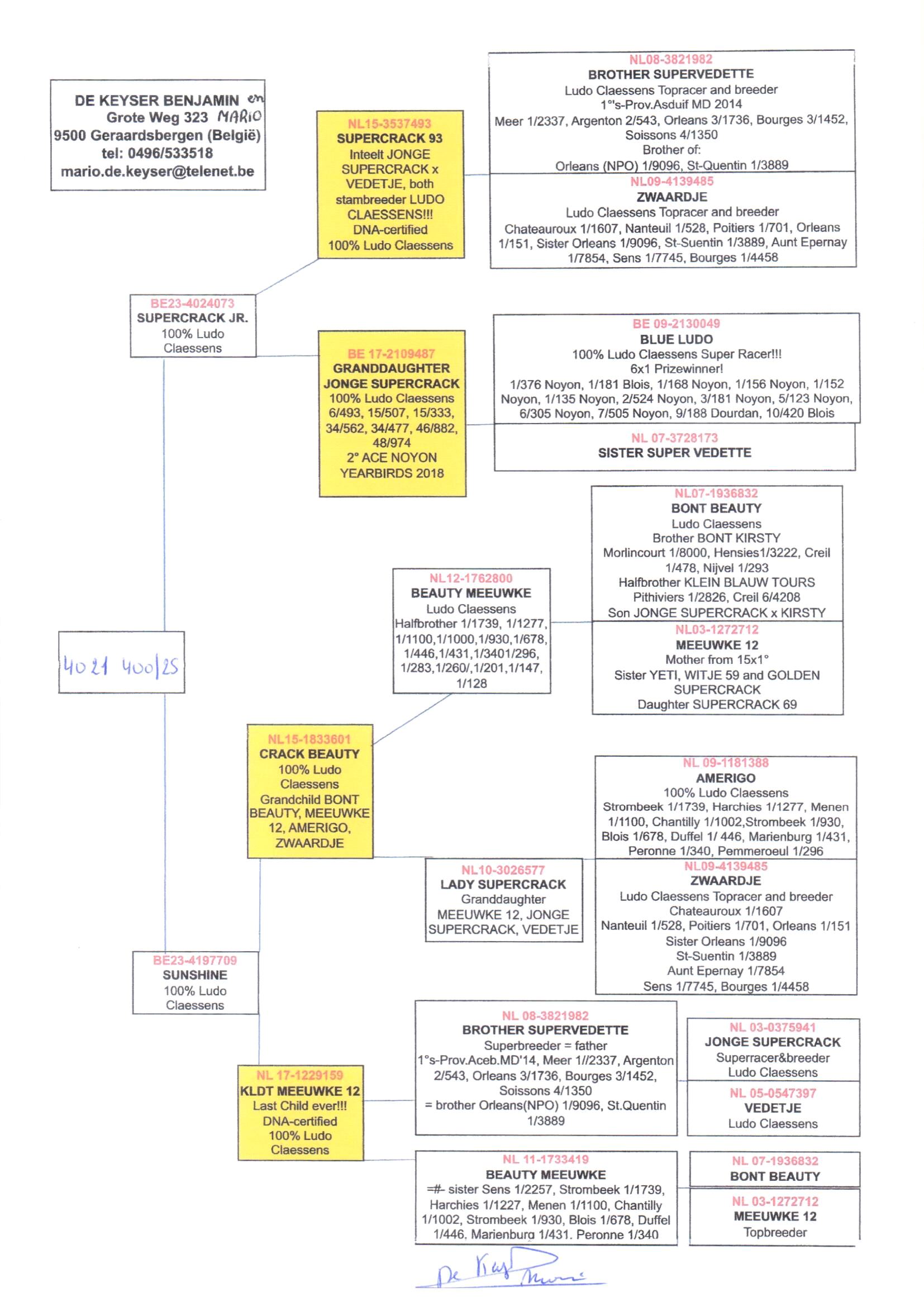 Is zoon van “Crack Beauty”, is kleinkind van “Bont Beauty”, “Meeuwke 12”, “Amerigo” & “Zwaardje”