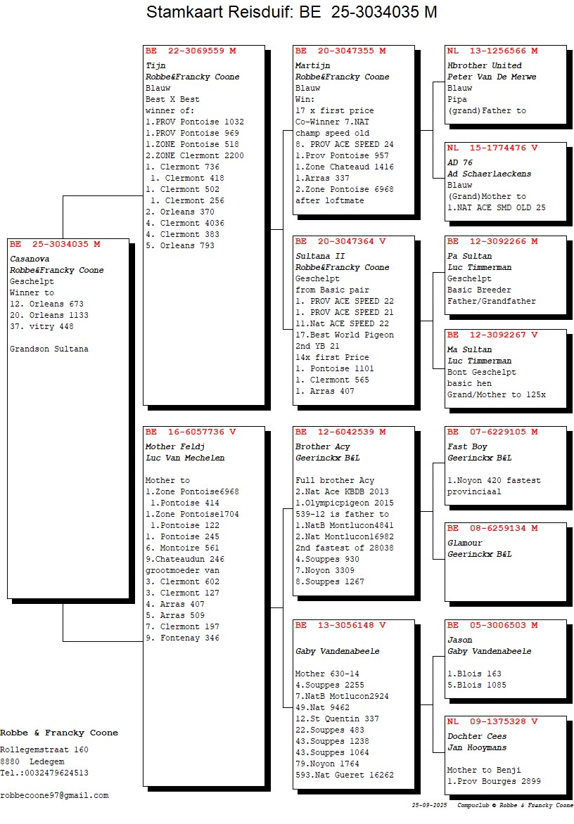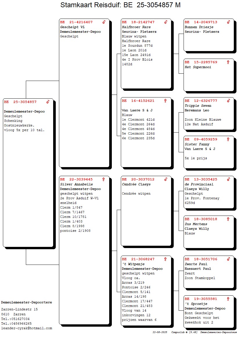 Christof is al meer dan 35 jaar actief in de duivensport. Velen kennen hem als de voorzitter van de West-Vlaamse jeugdclub of als schrijver onder het pseudoniem Chris Ardyn. Zijn resultaten dankt hij onder andere aan sterk duivenmateriaal van topliefhebbers als Karlos Callens, Jonas Everaert, Eric De Backer, Melvin Florissoone, Serge Claeys, Kathleen Balcaen, Patrick De Bruyne, Gert Van Limbergen en anderen. Met hun bloedlijnen scoorde hij de afgelopen jaren knap met zijn oude en jaarse duiven. In 2023 en 2024 scoorde hij een aantal eerste prijzen.Voor deze schenking biedt Christof een duivin aan van het jaar 2025, met ringnummer 3017285. De moeder komt uit de hokken van Freddy Depuydt, de vader van Johan en Nadine Demon.