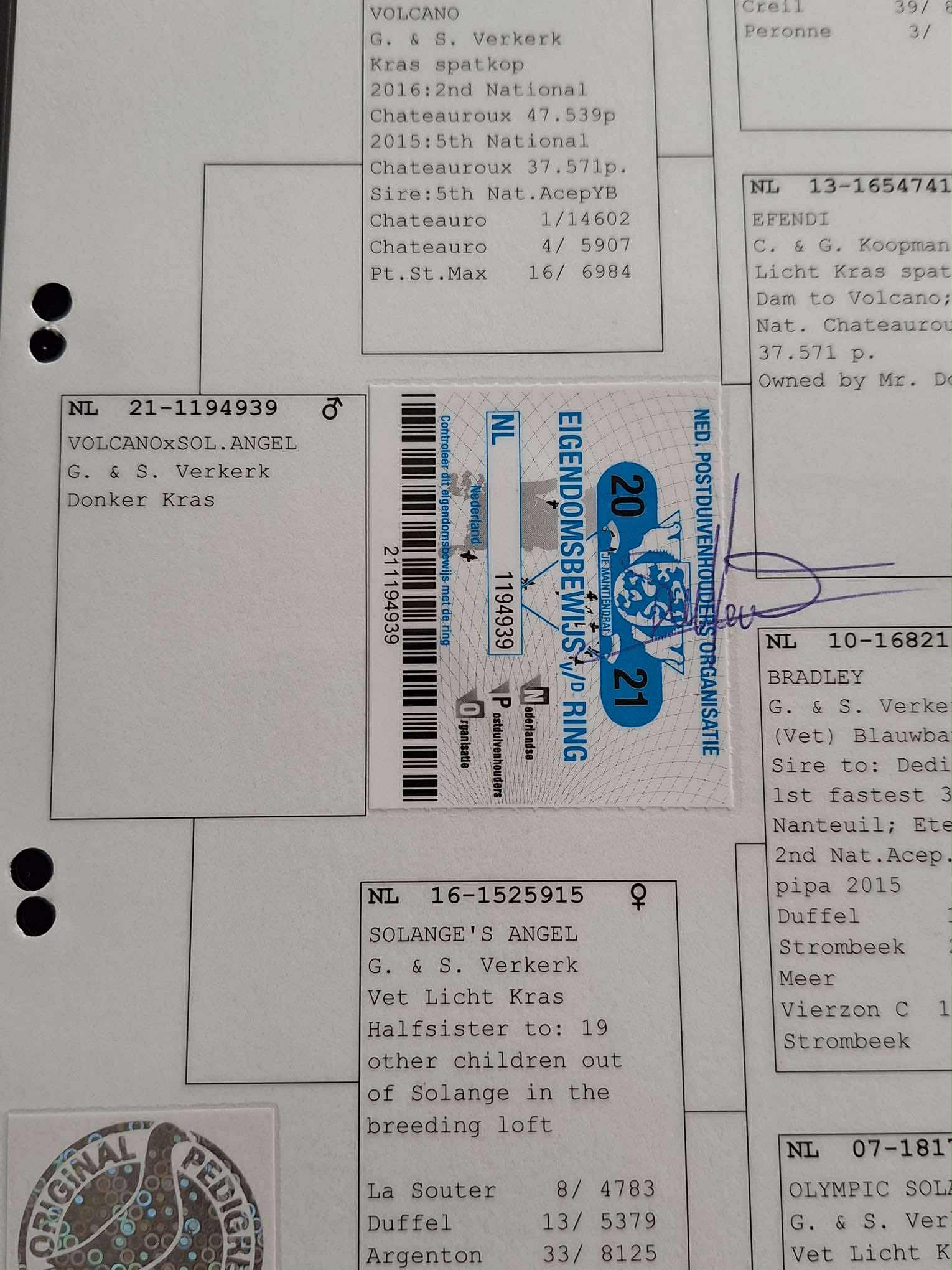 Broer 508/25 vliegt; 2/500, 4/580,4/522 ..ClermontZus 322/24 vliegt; 2/125,..213/24 ; 13/523,2/717,37/747... van Clermont of PontoiseIn bijlage pedigree van vader en moeder