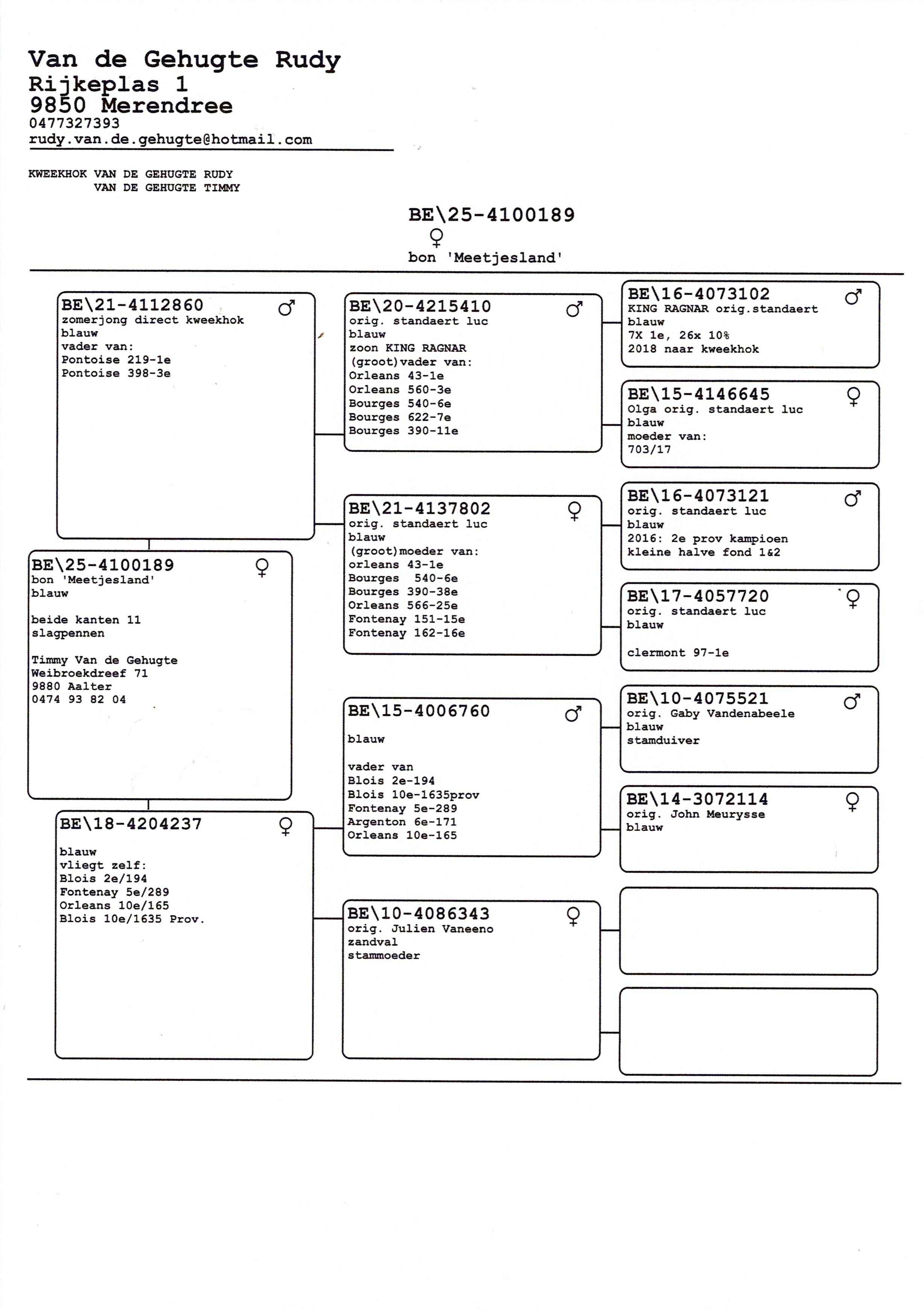 Een duif ter plaatse (zie pedigree) of een keuze uit de 1e ronde rond 20 januari.