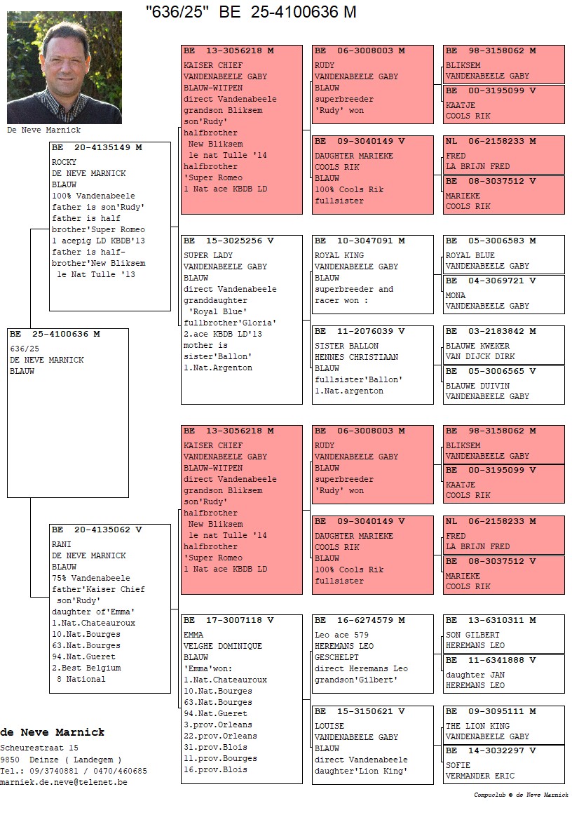 In lokaal Ruiselede/Wingene oa. 6e kampioen zware halve fond oude en 7e kampioen zware halve fond jaarse In het Meetjesland 8e puntenkampioen zware halve fond en 5e asduif zware halve fond oude.