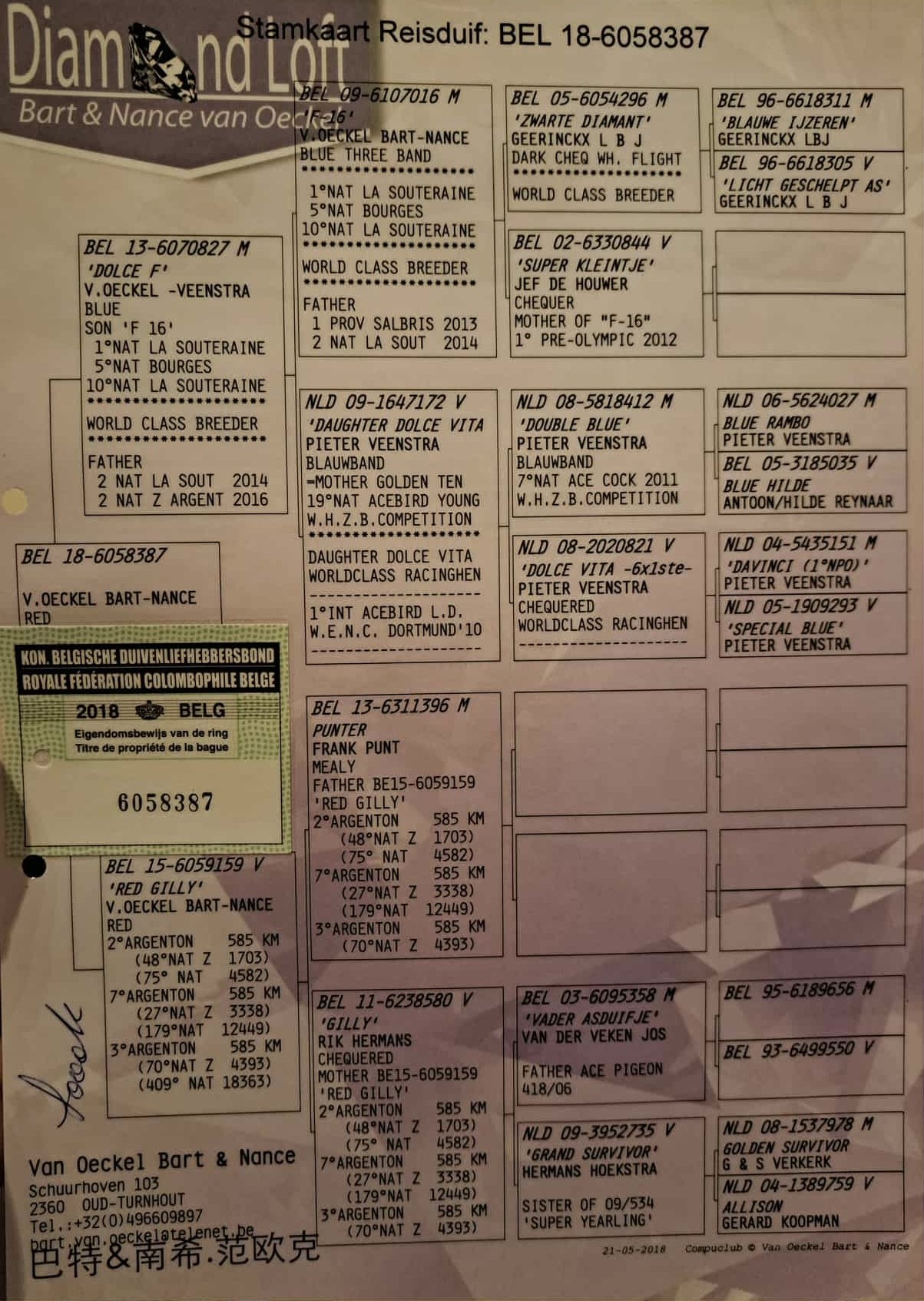 Afkomstig uit de beste lijnen van Bart Van Oeckel (Oud-Turnhout, BE) – lijn van F16, Dolce F, Red Gilly, …