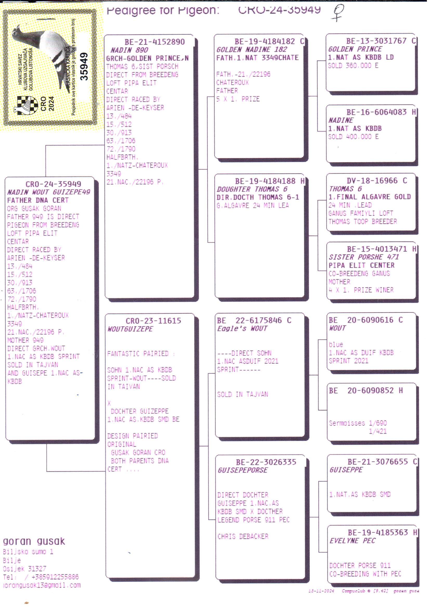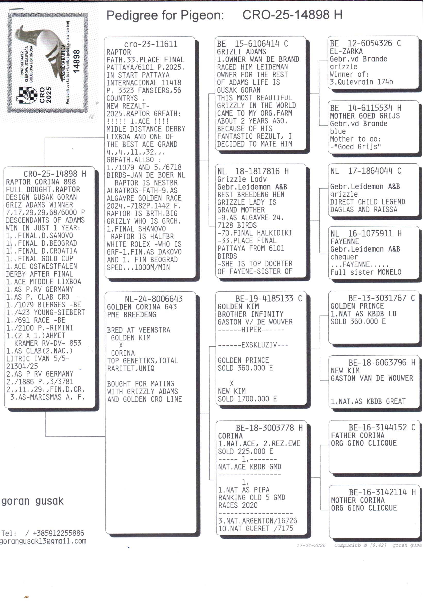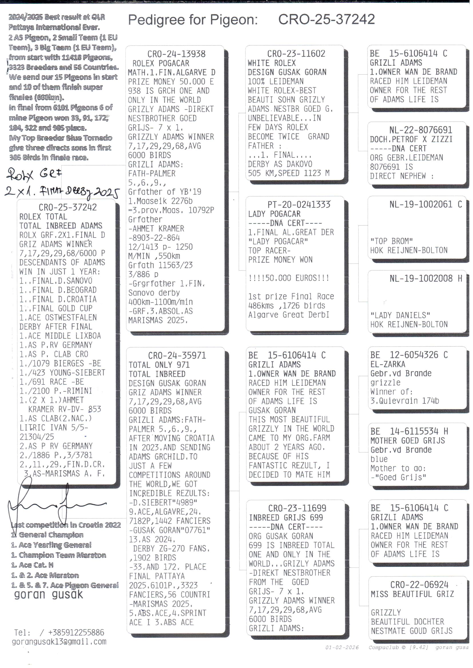 Als nestbroer van het beroemde “Goed Grijs” van Gebroeders Leideman, drukte "Grizzly Adams" een blijvende stempel op de duivensport over de hele wereld. De Kroatische Goran Gusak wist deze topduif aan te kopen nog vóór het "Goed Grijs" een absolute hype werd en dit bleek een schot in de roos, want "Grizzly Adams" bevestigde zijn afkomst en kweekwaarde met brio! Ondanks zijn gevorderde leeftijd kweekt hij nog steeds succesvol en vormen zijn kinderen ondertussen de basis op vele hokken. De kweekkwaliteit van de “Goed Grijs”-lijn wordt bovendien bevestigd door uitstekende resultaten in clubwedstrijden en diverse one loft-races over heel Europa en de wereld.
