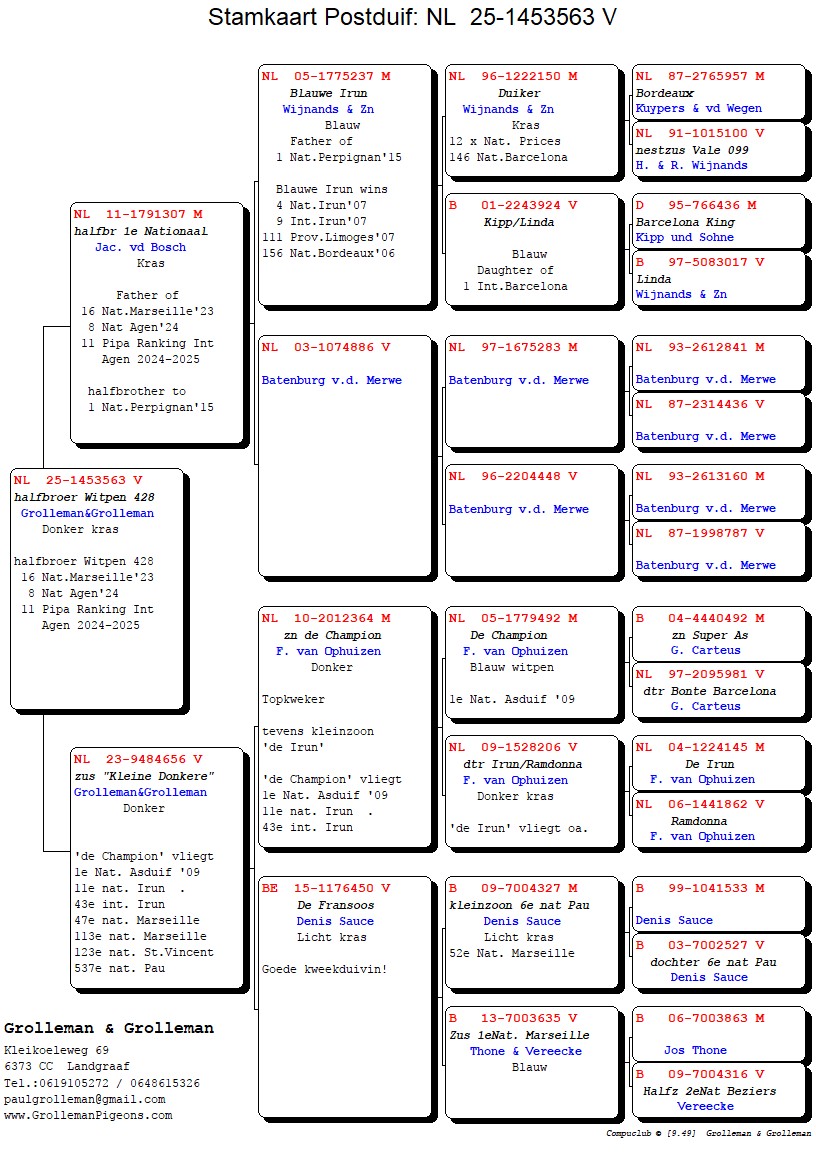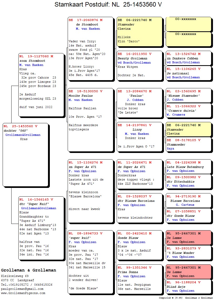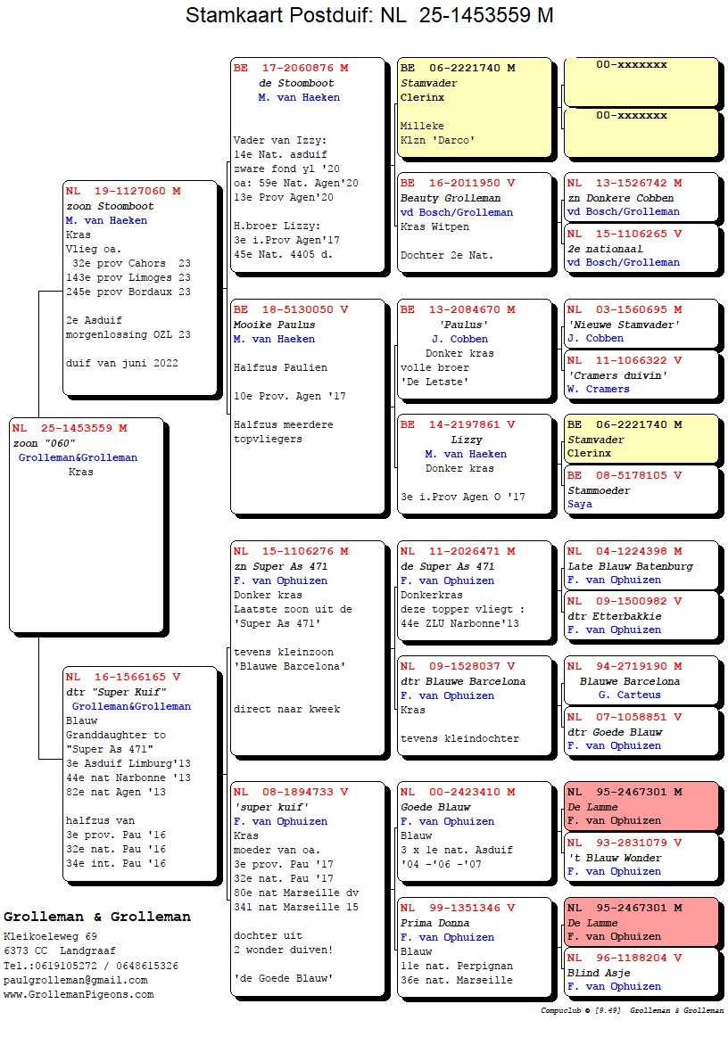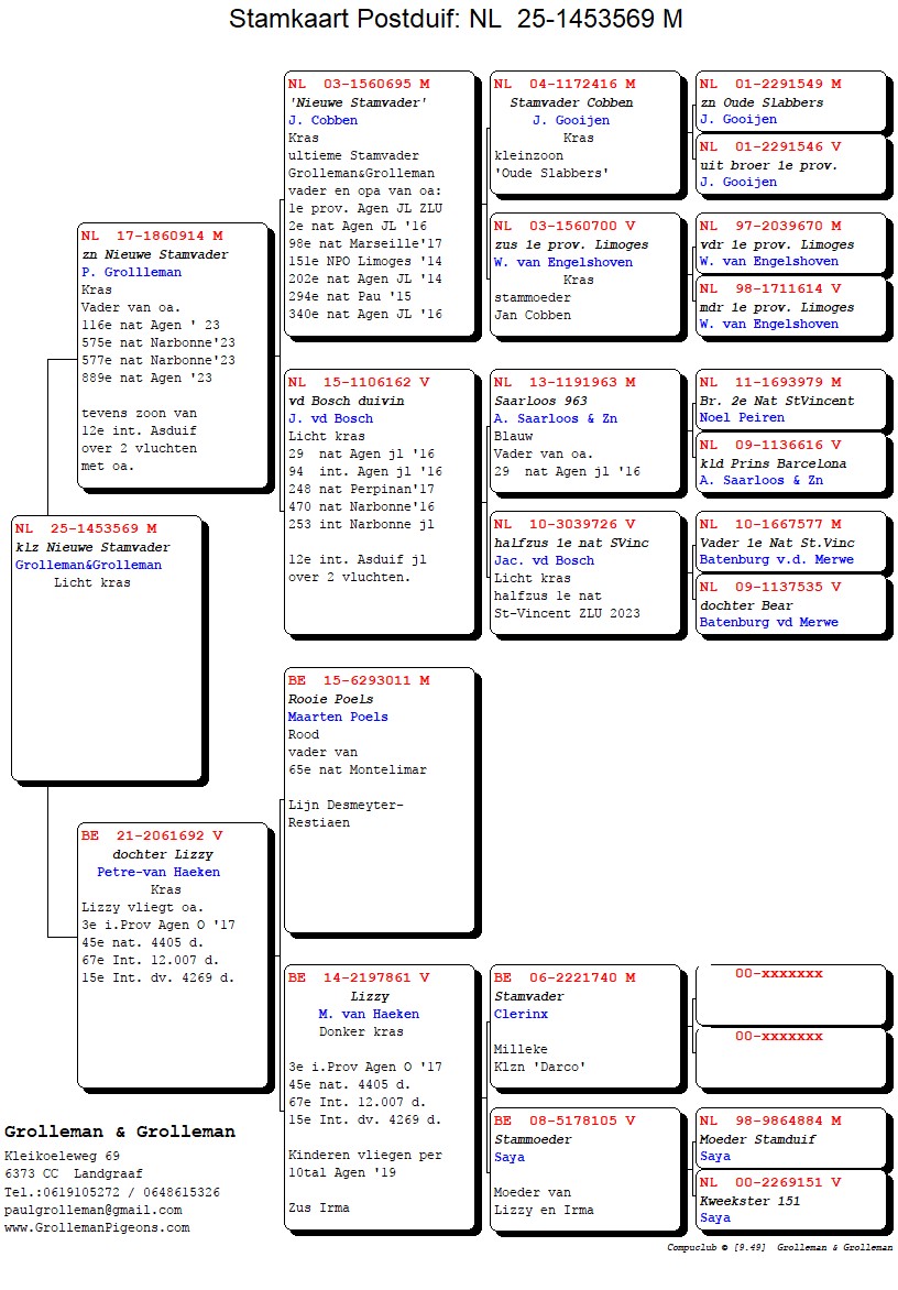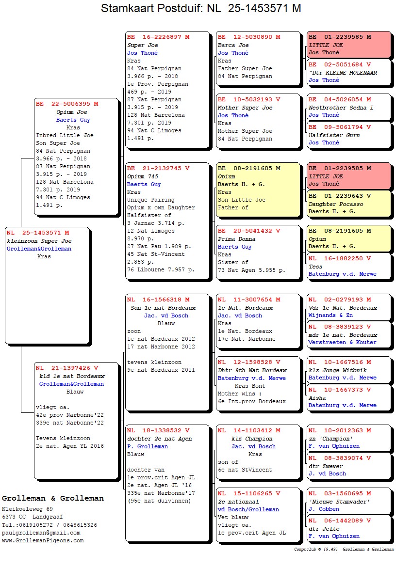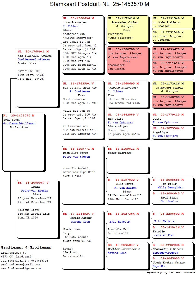Met 1ste Nationaal ZLU St. Vincent in 2023 en nationale en internationale kopprijzen op onder andere Agen en Tarbes, staat het als een paal boven water dat bij de combinatie Grolleman serieus materiaal onder de pannen zit. Ook op andere hokken zoals bij Michiel van Haeken maakten de duiven van Paul Grolleman al snel furore. Op zoek naar knap gebouwde duiven die de kilometers aankunnen? Dan is het nu de moment! Voor hun debuut op Pitts gingen Grolleman & Grolleman stevig tekeer en selecteerden een ploeg jonge beloften om U tegen te zeggen!