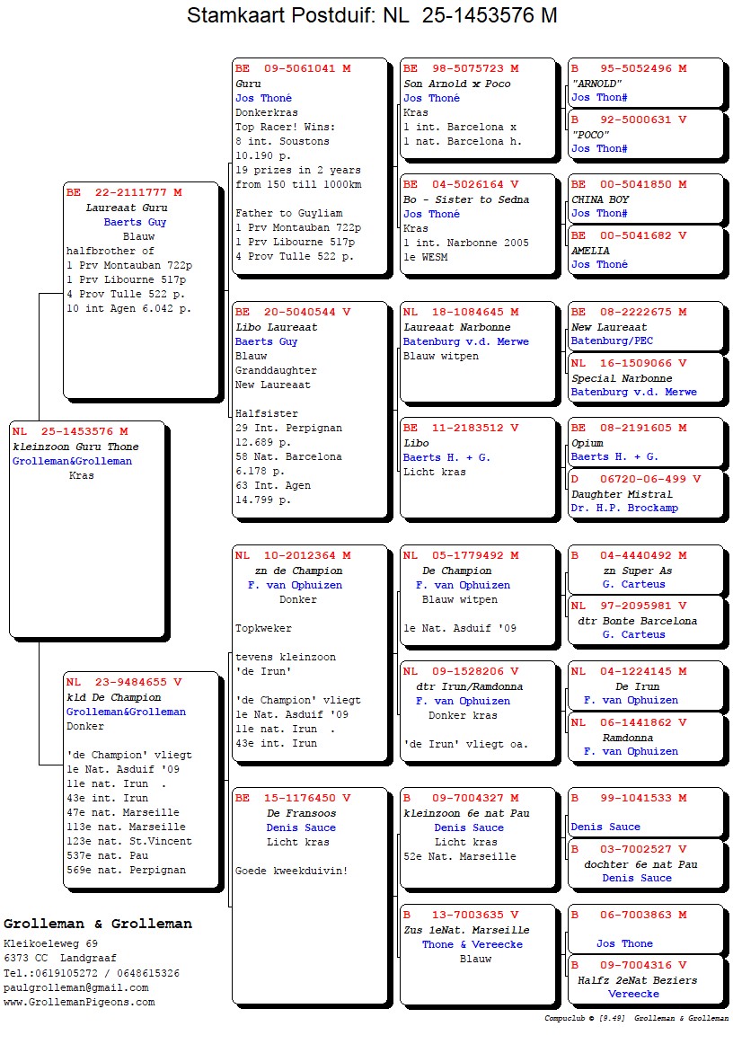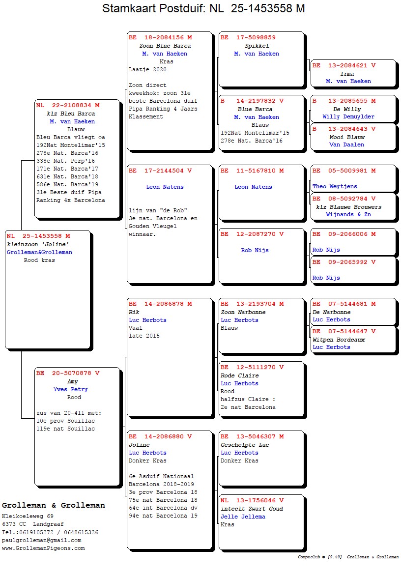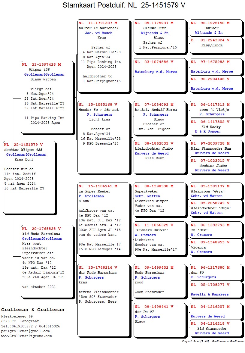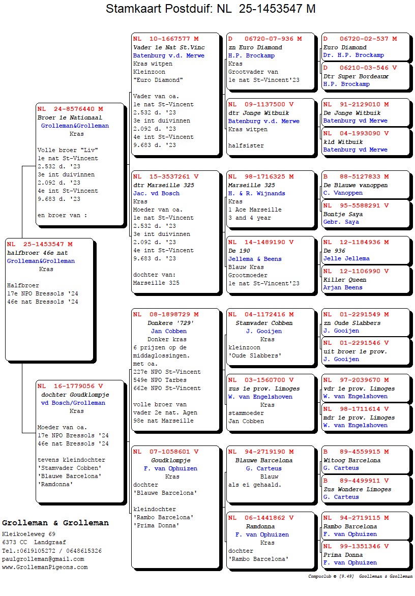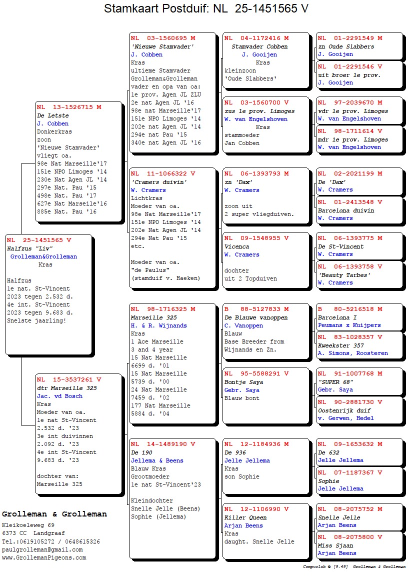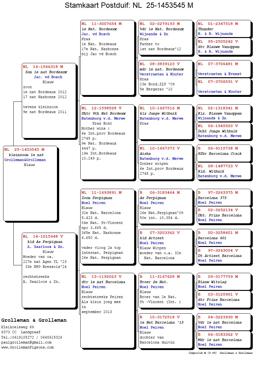 Met 1ste Nationaal ZLU St. Vincent in 2023 en nationale en internationale kopprijzen op onder andere Agen en Tarbes, staat het als een paal boven water dat bij de combinatie Grolleman serieus materiaal onder de pannen zit. Ook op andere hokken zoals bij Michiel van Haeken maakten de duiven van Paul Grolleman al snel furore. Op zoek naar knap gebouwde duiven die de kilometers aankunnen? Dan is het nu de moment! Voor hun debuut op Pitts gingen Grolleman & Grolleman stevig tekeer en selecteerden een ploeg jonge beloften om U tegen te zeggen!