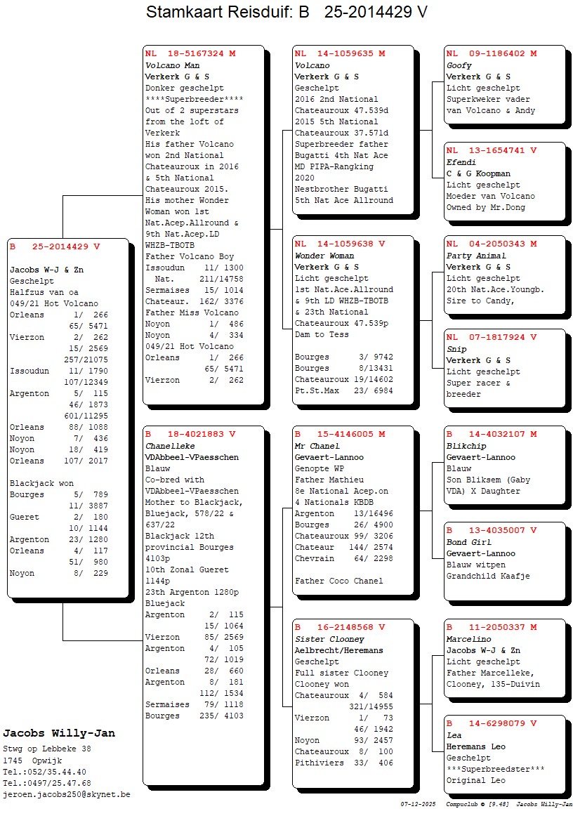Volcano Man zijn vader is ‘Volcano’, 2e Nationaal Chateauroux 47539 duiven in 2016 & 5e Nationaal Chateauroux 37571 duiven in 2015 maar ook 16e Pont St. Max. van 6984 duiven. ‘Volcano’ zelf is bij Verkerk een topkweker en vader van oa ‘Bugatti’, 4e Nat.Asduif Halve Fond PIPA-Ranking ’20 & ‘Nestbroer Bugatti’, 5e Nat.Asduif Allround 2019.
