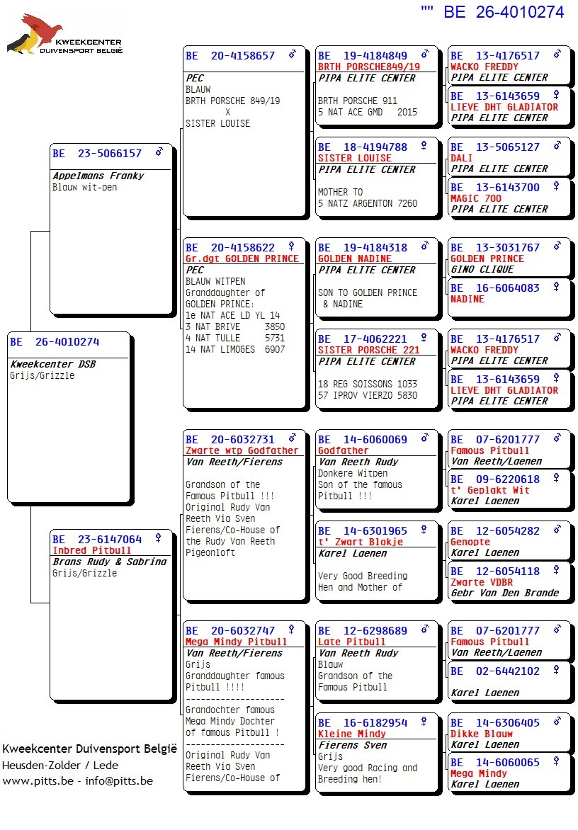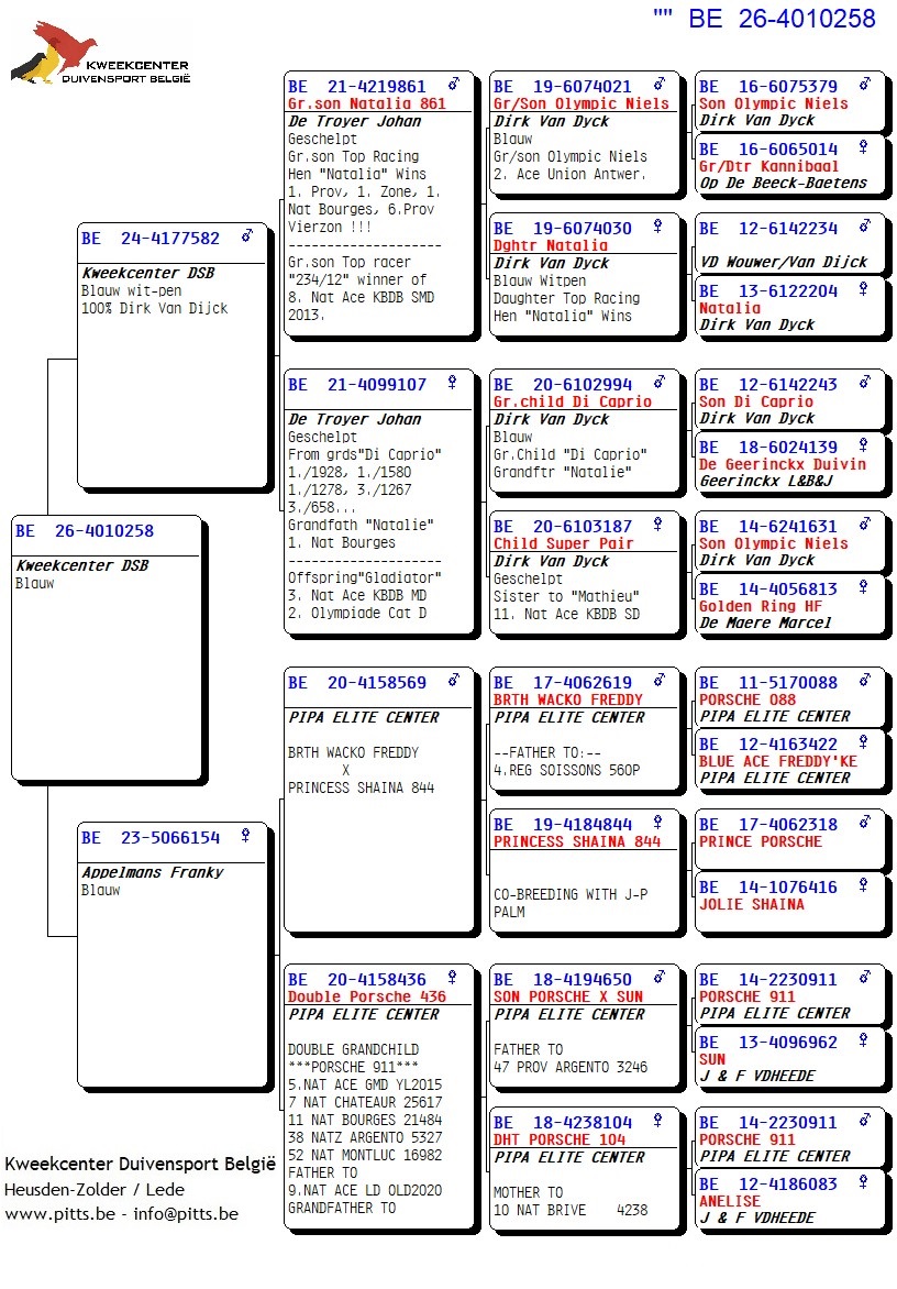 dubbele kleindochter “Porsche 911”, won oa; 5° Nationale Asduif Grote Halve Fond ’15, 7° Nationaal Chateauroux 25617d, 11° Nationaal Bourges 21484d …