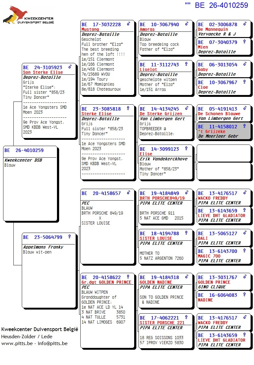 Kleindochter van “Porsche 911”, won oa; 5° Nationale Asduif Grote Halve Fond ’15, 7° Nationaal Chateauroux 25617d, 11° Nationaal Bourges 21484d …