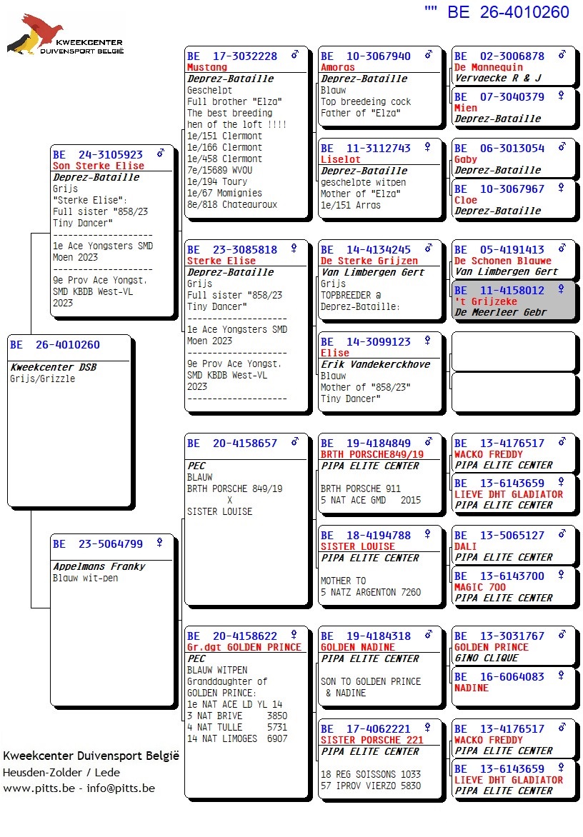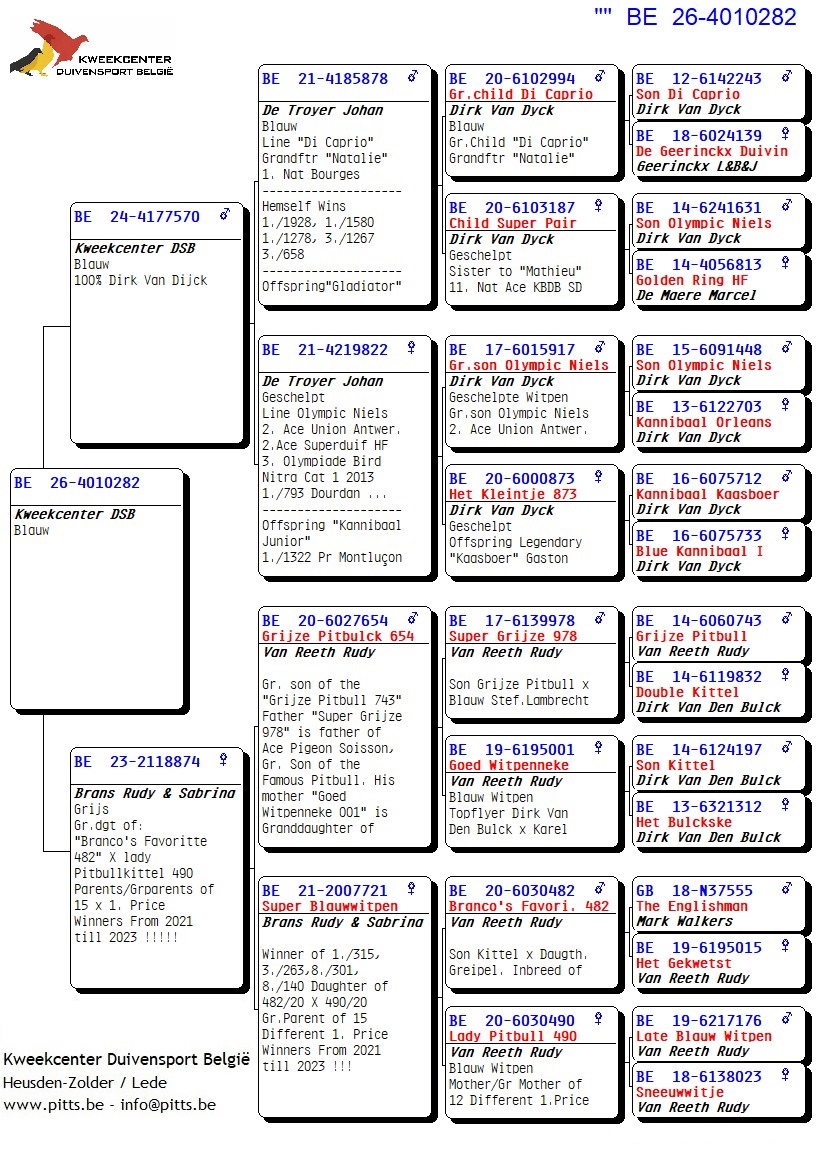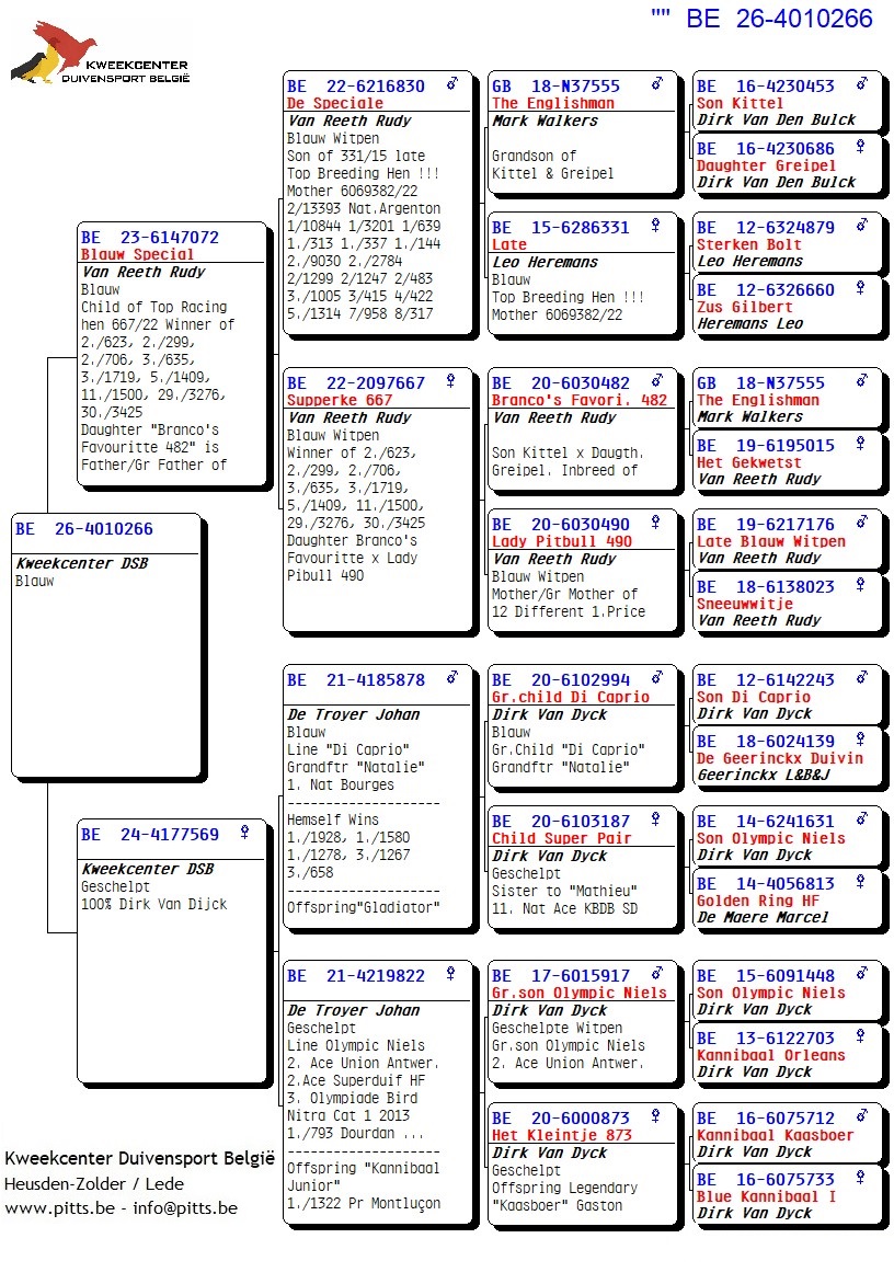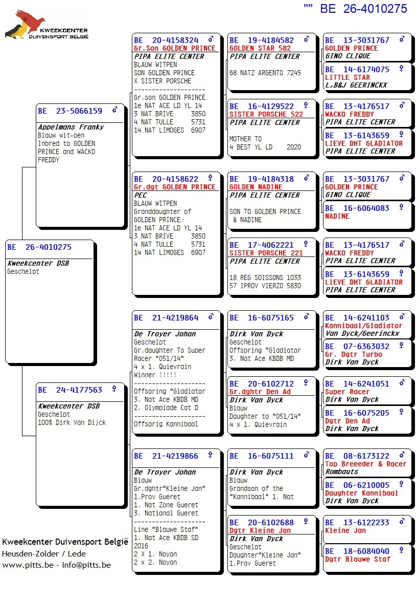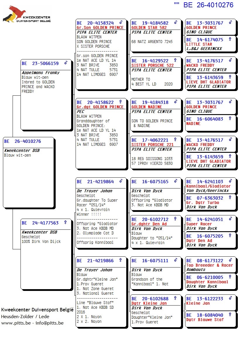 achterkleinzoon “Golden Prince”, won oa; 1° Nationale Asduif Fond Jaarse ’14, 3° Nationaal Brive 3850d, 4° Nationaal Tulle 5731d, 14° Nationaal Limoges 6907d