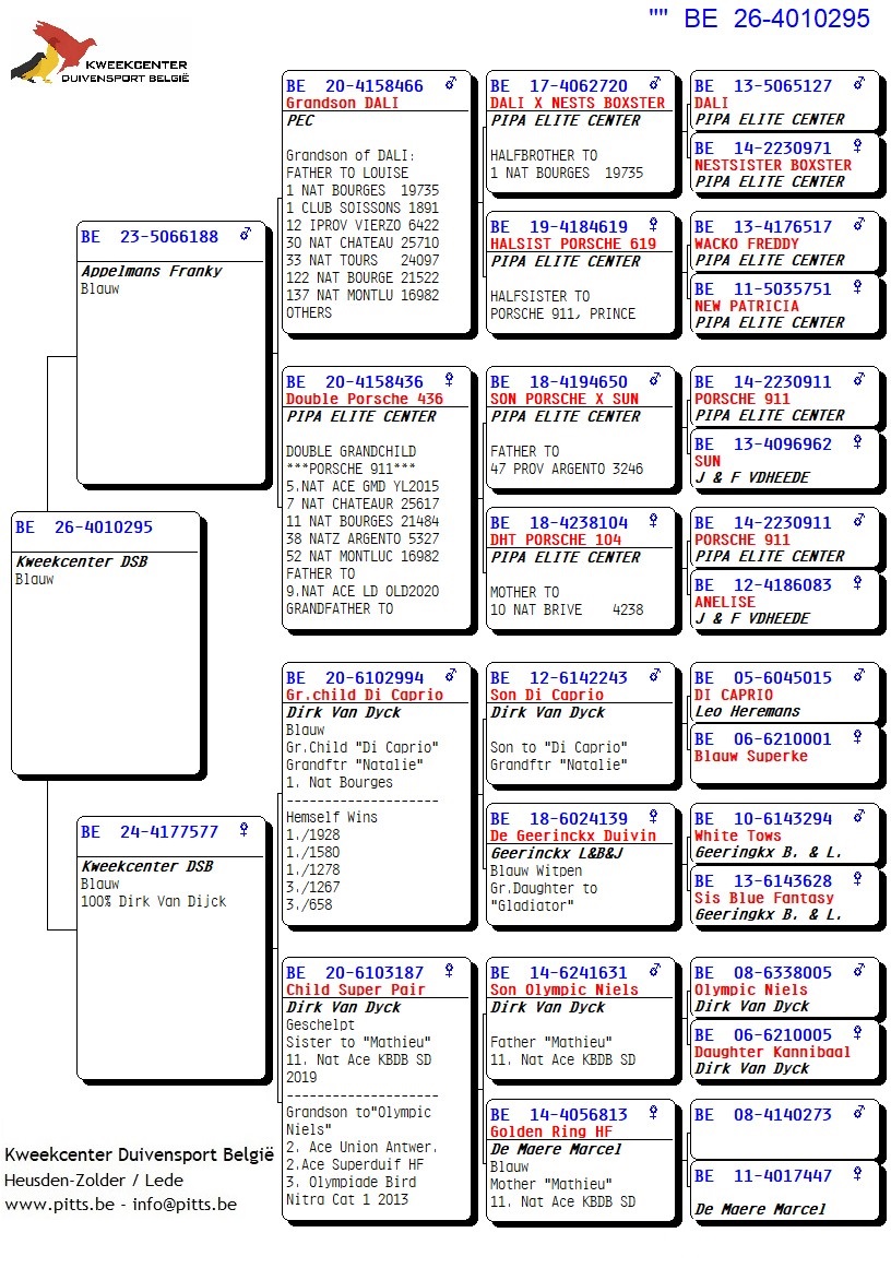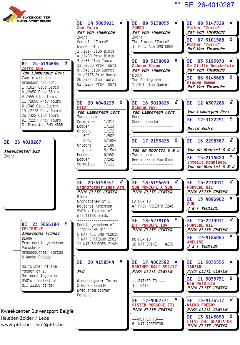 dubbele kleindochter “Porsche 911”, won oa; 5° Nationale Asduif Grote Halve Fond Jaarse ’15, 7° Nationaal Chateauroux 25617d, 11° Nationaal Bourges 21484d …