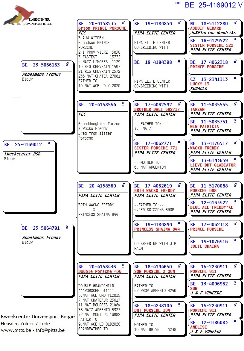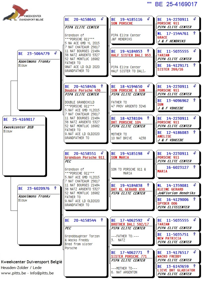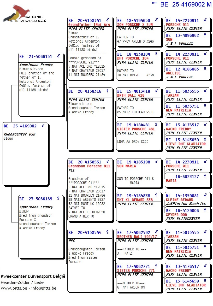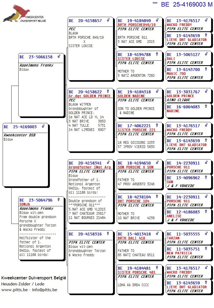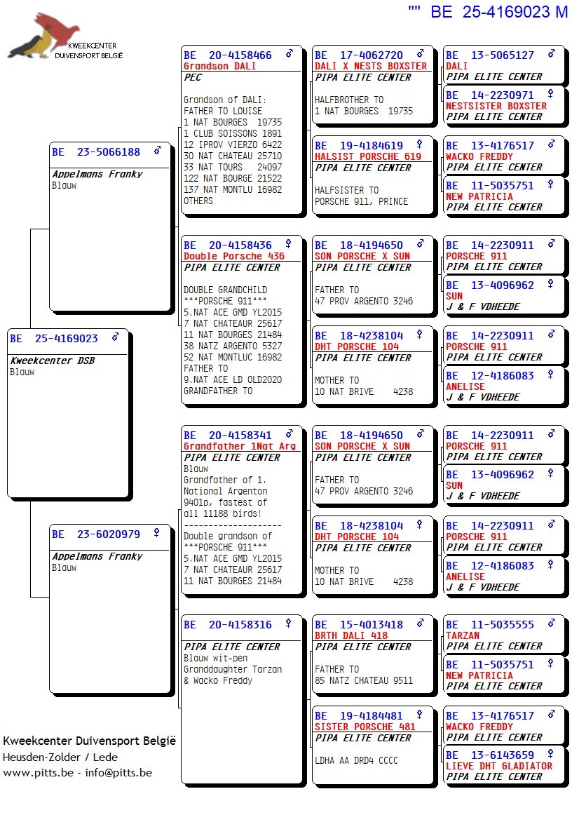 Voor deze Porsche-collectie werd een verbluffende selectie kweekduiven van Franky Appelmans naar de boxen van ons kweekcenter gebracht en zorgvuldig gekoppeld volgens hun individuele kenmerken. We bieden dan ook met trots deze selectie zomerjongen aan, stuk voor stuk teruggekoppeld naar de basis nl. "Porsche 911". Een uitgelezen kans om iets te pakken te krijgen van uit deze bewezen toplijn!