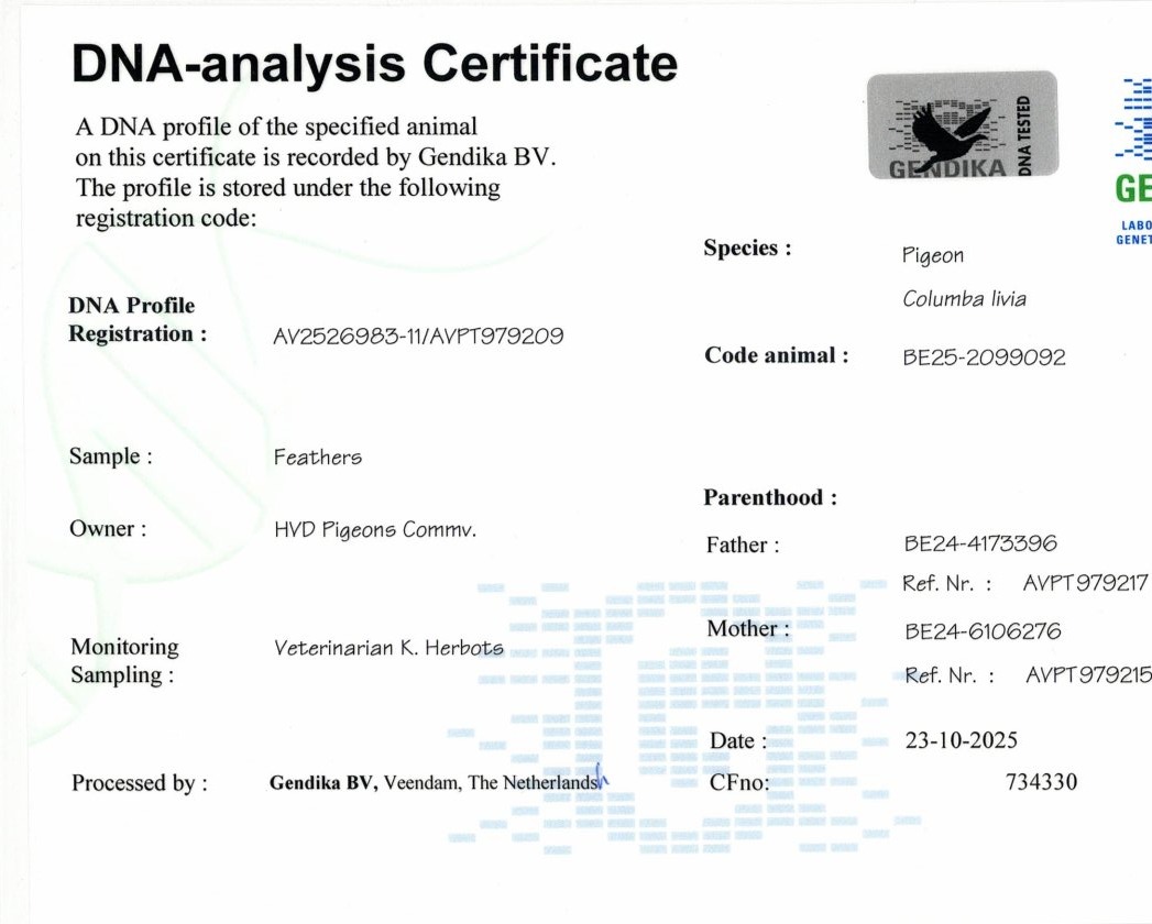 Duif, met stamboom + DNA ter plaatse. Zal worden tentoongesteld vrijdagavond 30 januari tussen 16 en 21u samen met de PITTS tentoonstellingen.