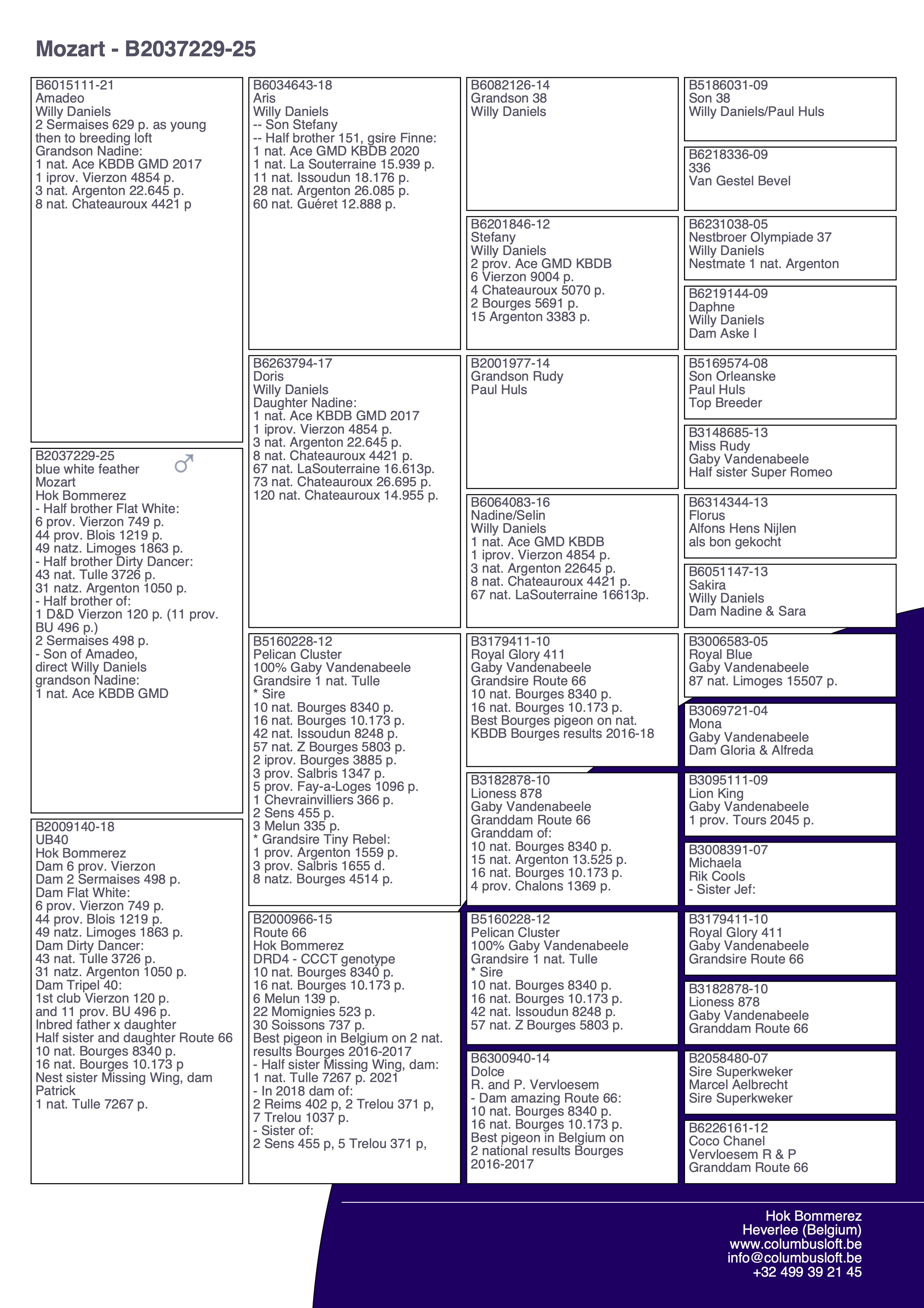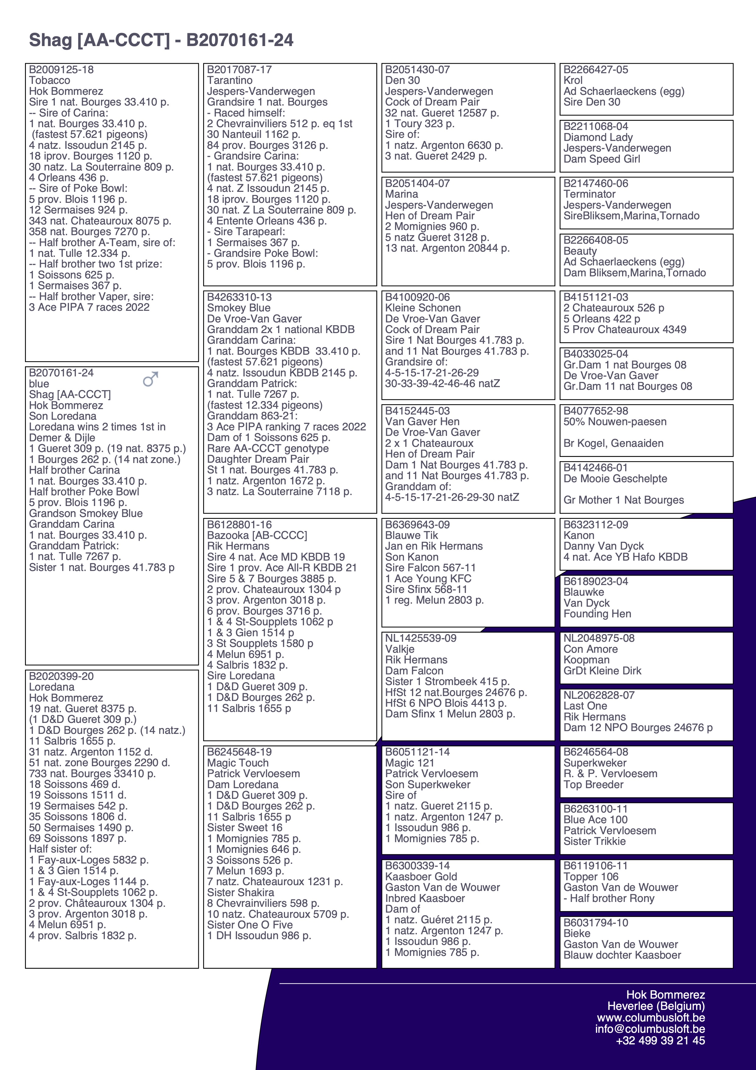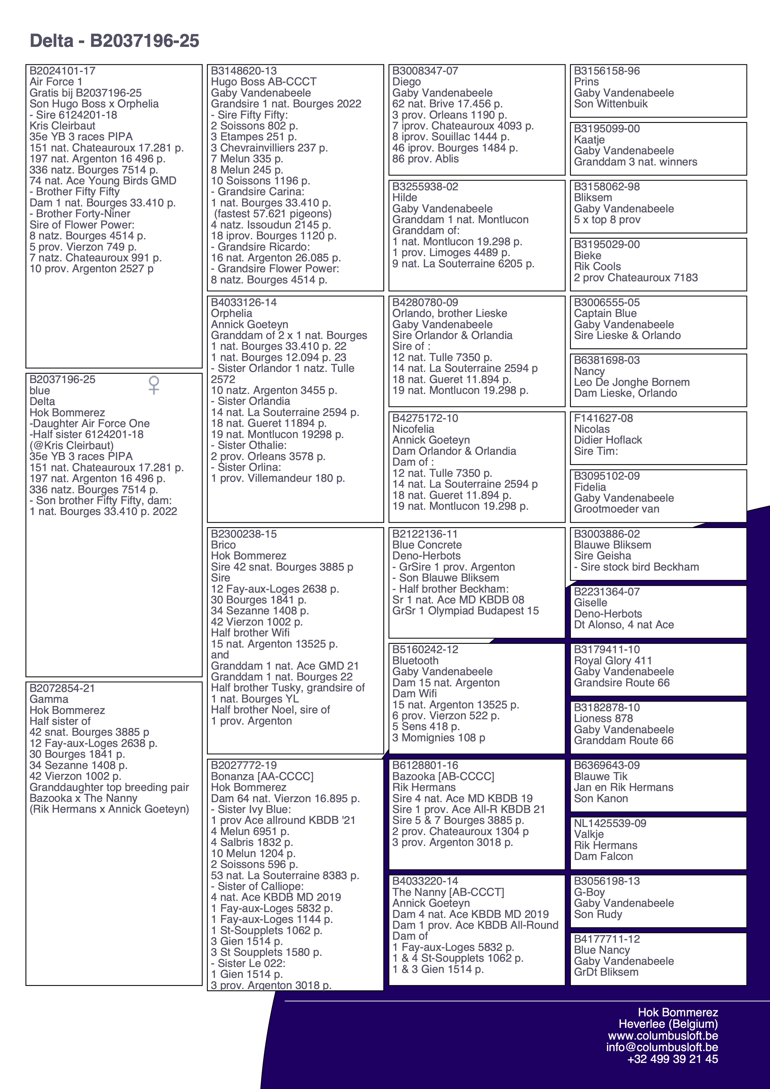 Maarten en Michel Bommerez uit Heverlee draaien al jaren mee met de besten op de grote halve fond en nationale dagfond, met recente uitslagen als 11e Nationaal Souillac, 9e Nationaal Argenton en 13e Nationaal Châteauroux. Wat is hun geheim? "Op een bepaald moment beslisten we vooral duiven bij te halen uit erkende superkoppels." Wie het verkoopprogramma doorneemt, ontdekt al snel welke die koppels zijn: het "Dream Pair" van De Vroe-Van Gaver, het "Gloria Koppel" van Gaby Vandenabeele, het "Stamkoppel" van Annick Goeteyn, het "Golden Pair" van Patrick Vervloesem en nog veel meer. Nu het kweekbestand wordt gehalveerd, komt die topkwaliteit onder de hamer. Met kinderen van stamvaders "Big Deal" en "Bazooka", nakomelingen van fenomeen "Tiny Rebel" en zes duiven met het begeerde LDHA "AA"-gen wordt dit een niet te missen verkoping!