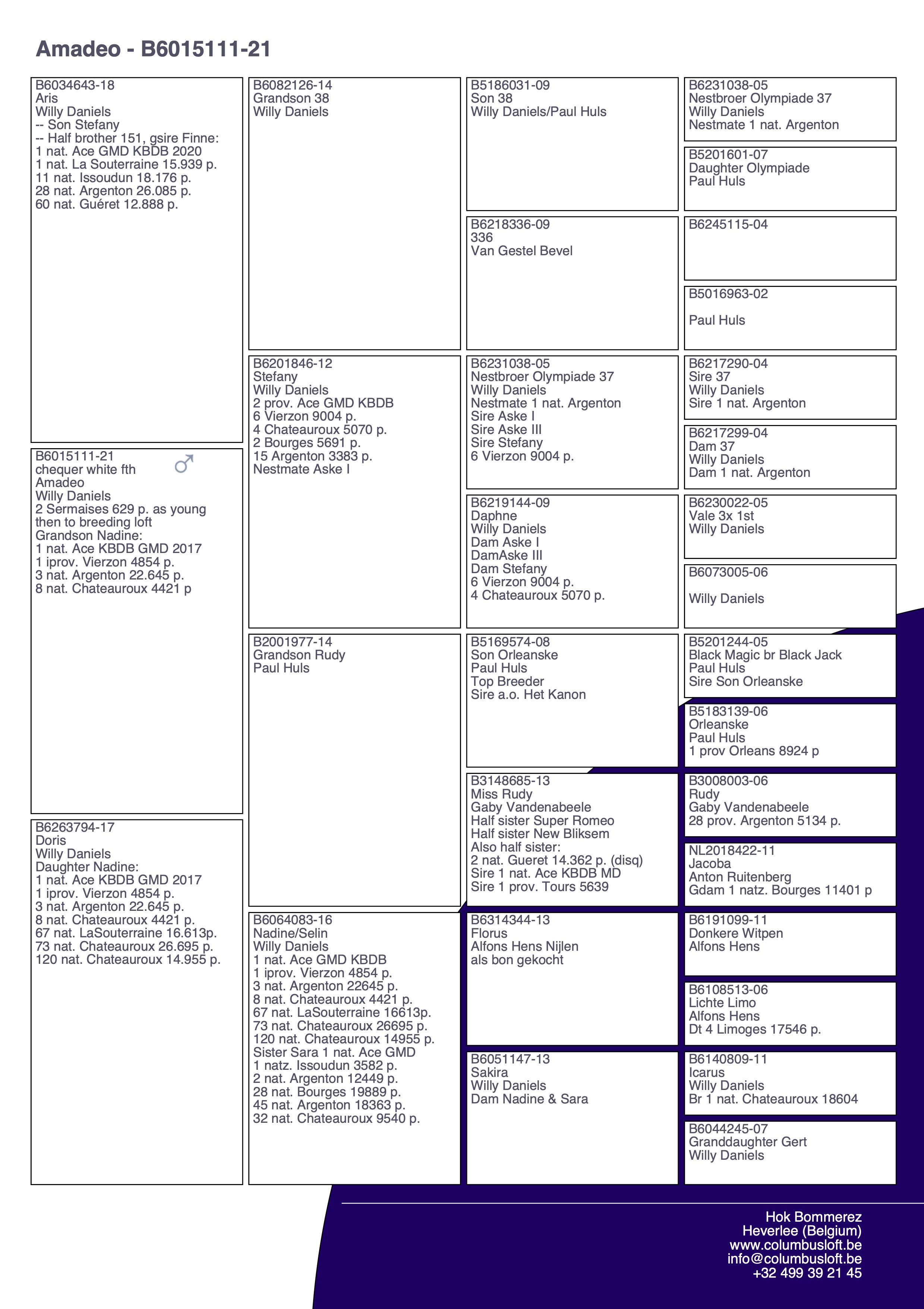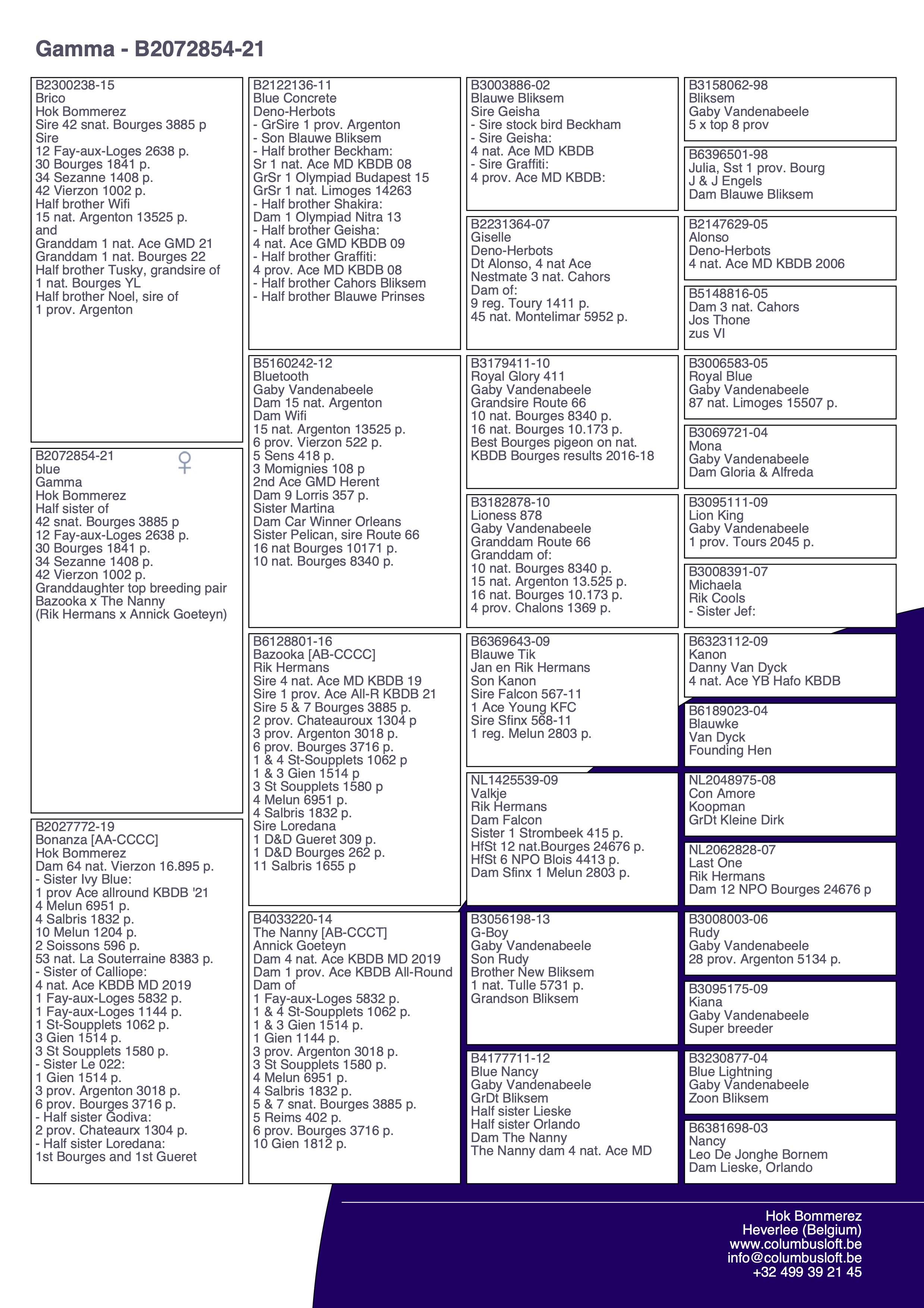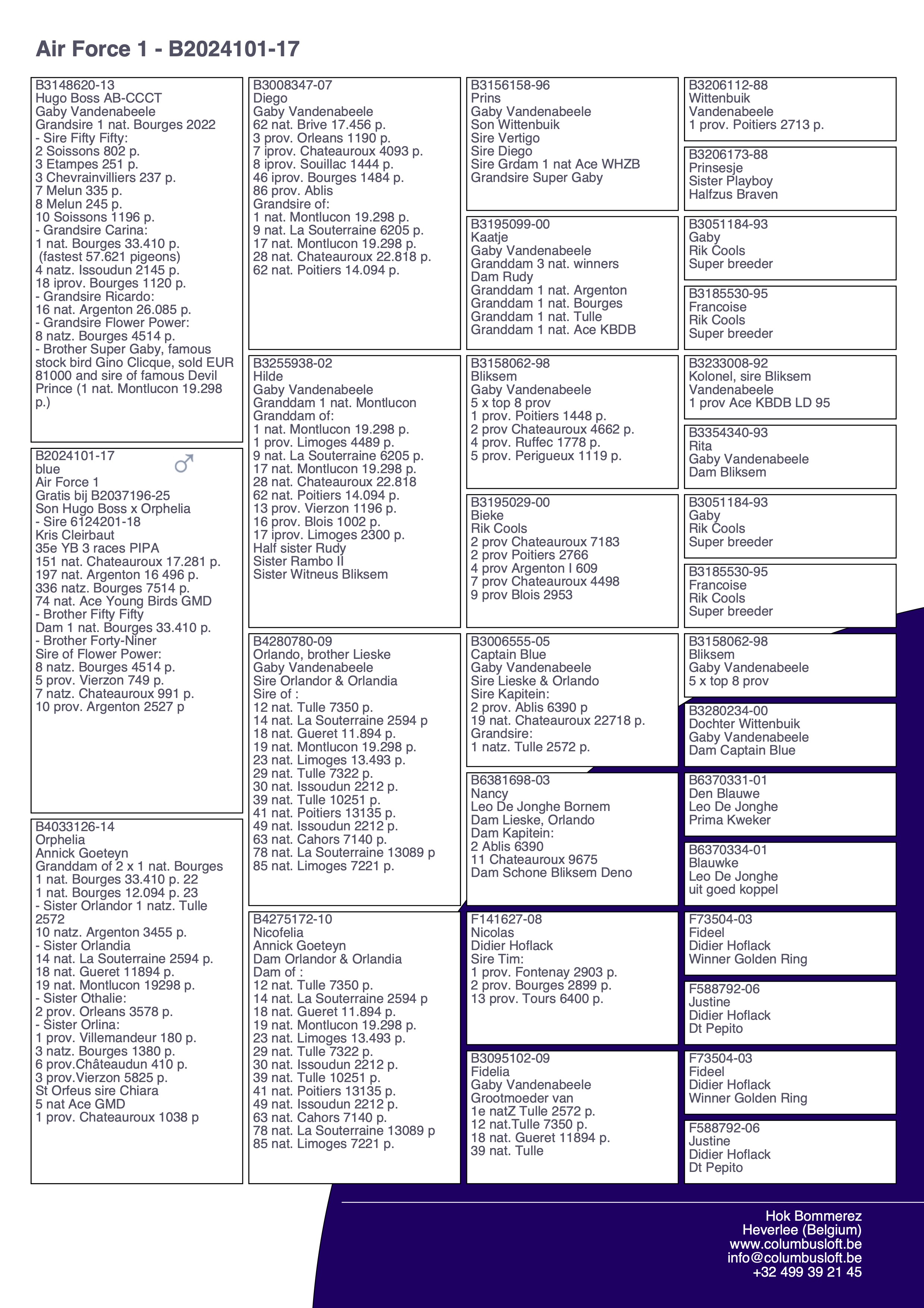 Maarten en Michel Bommerez uit Heverlee draaien al jaren mee met de besten op de grote halve fond en nationale dagfond, met recente uitslagen als 11e Nationaal Souillac, 9e Nationaal Argenton en 13e Nationaal Châteauroux. Wat is hun geheim? "Op een bepaald moment beslisten we vooral duiven bij te halen uit erkende superkoppels." Wie het verkoopprogramma doorneemt, ontdekt al snel welke die koppels zijn: het "Dream Pair" van De Vroe-Van Gaver, het "Gloria Koppel" van Gaby Vandenabeele, het "Stamkoppel" van Annick Goeteyn, het "Golden Pair" van Patrick Vervloesem en nog veel meer. Nu het kweekbestand wordt gehalveerd, komt die topkwaliteit onder de hamer. Met kinderen van stamvaders "Big Deal" en "Bazooka", nakomelingen van fenomeen "Tiny Rebel" en zes duiven met het begeerde LDHA "AA"-gen wordt dit een niet te missen verkoping!