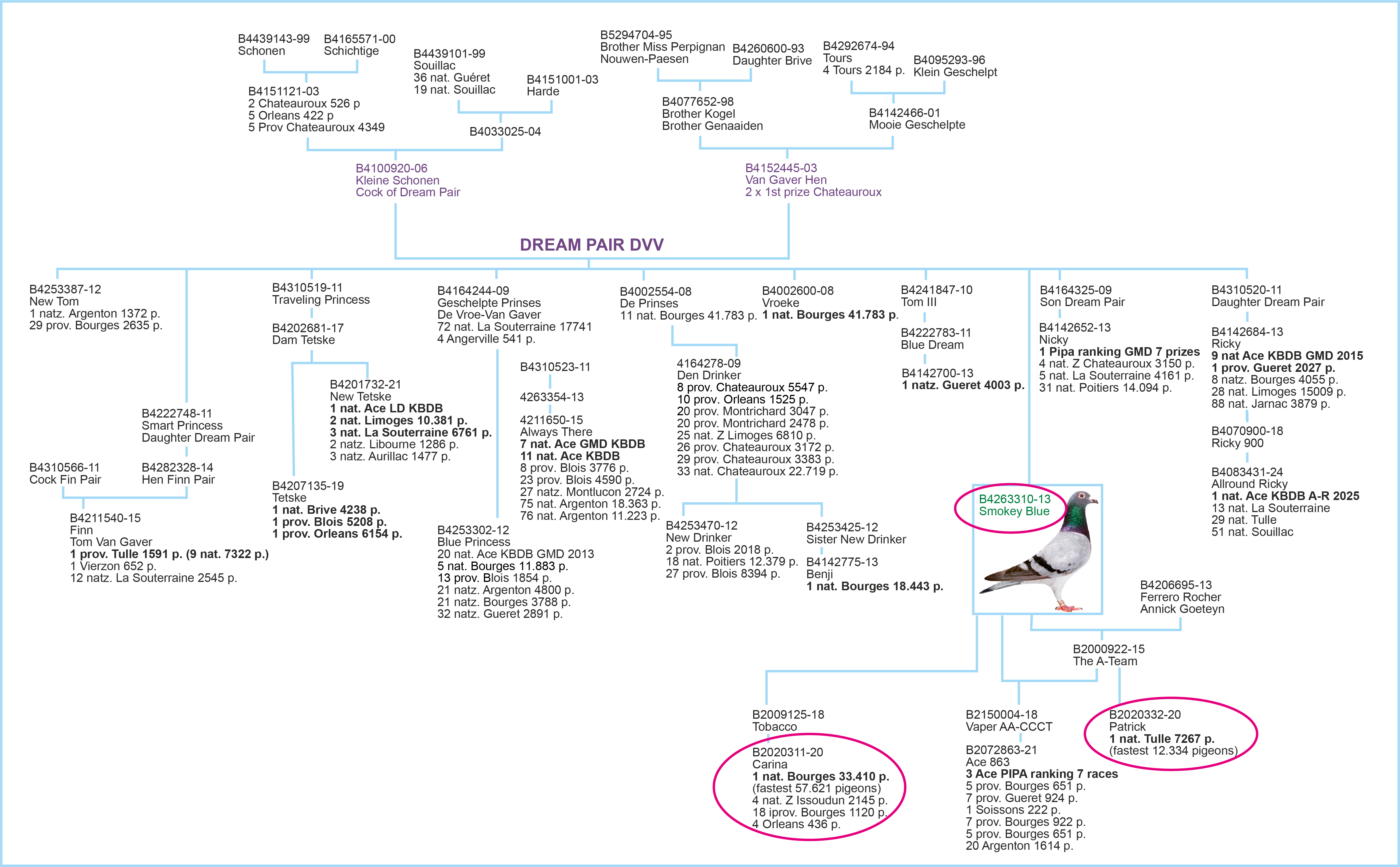 > Halfbroer “Wifi” 15 nat. Argenton 13.525 d. en grootmoeder 1 nat. Asduif KBDB & grootmoeder 1 nat. Bourges 24.211 d.