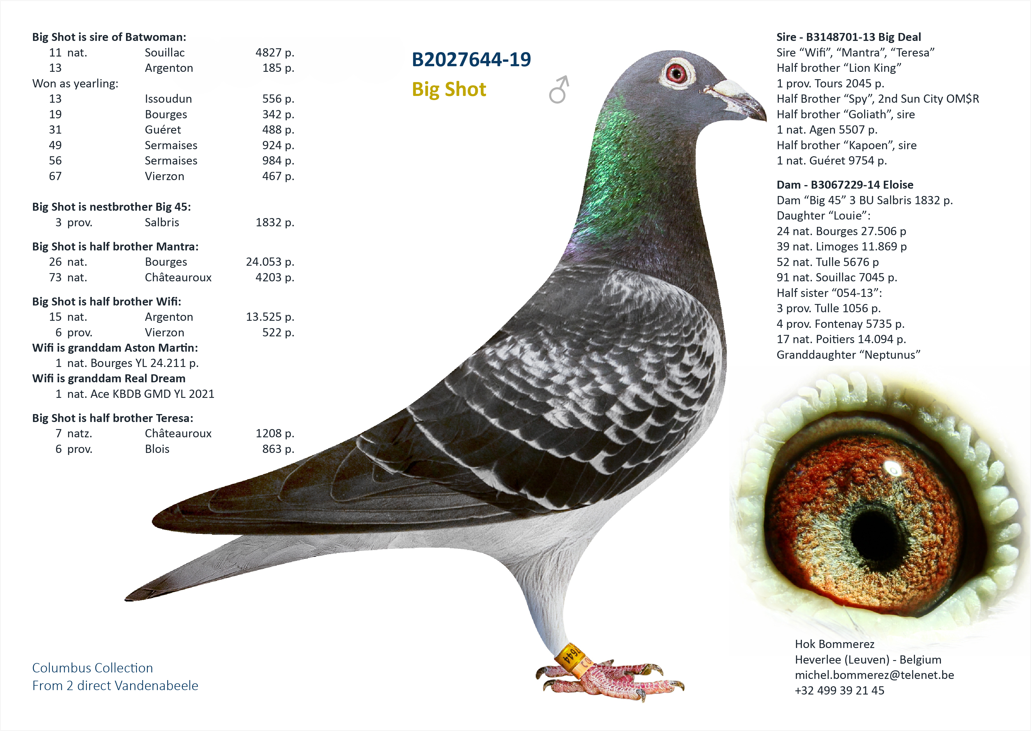 Halfbroer “Wifi”: 15 nat. Argenton 13525 d. en grootmoeder 1 nat. Asduif GHF YL KBDB, 1 nat. Bourges 24.211 d., 29 nat. Bourges 17.163 d., 39 nat. Bourges 3990 d., 64 nat. Vierzon 16.895 d.