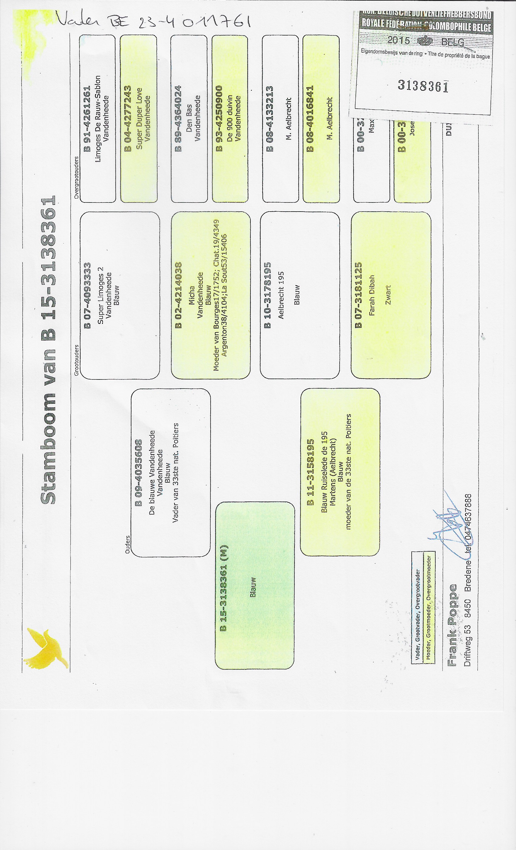 Vader is de BE15-3138361, allround-topvlieger met meerdere eerste prijzen van Arras tot Argenton. Vader vloog o.a.