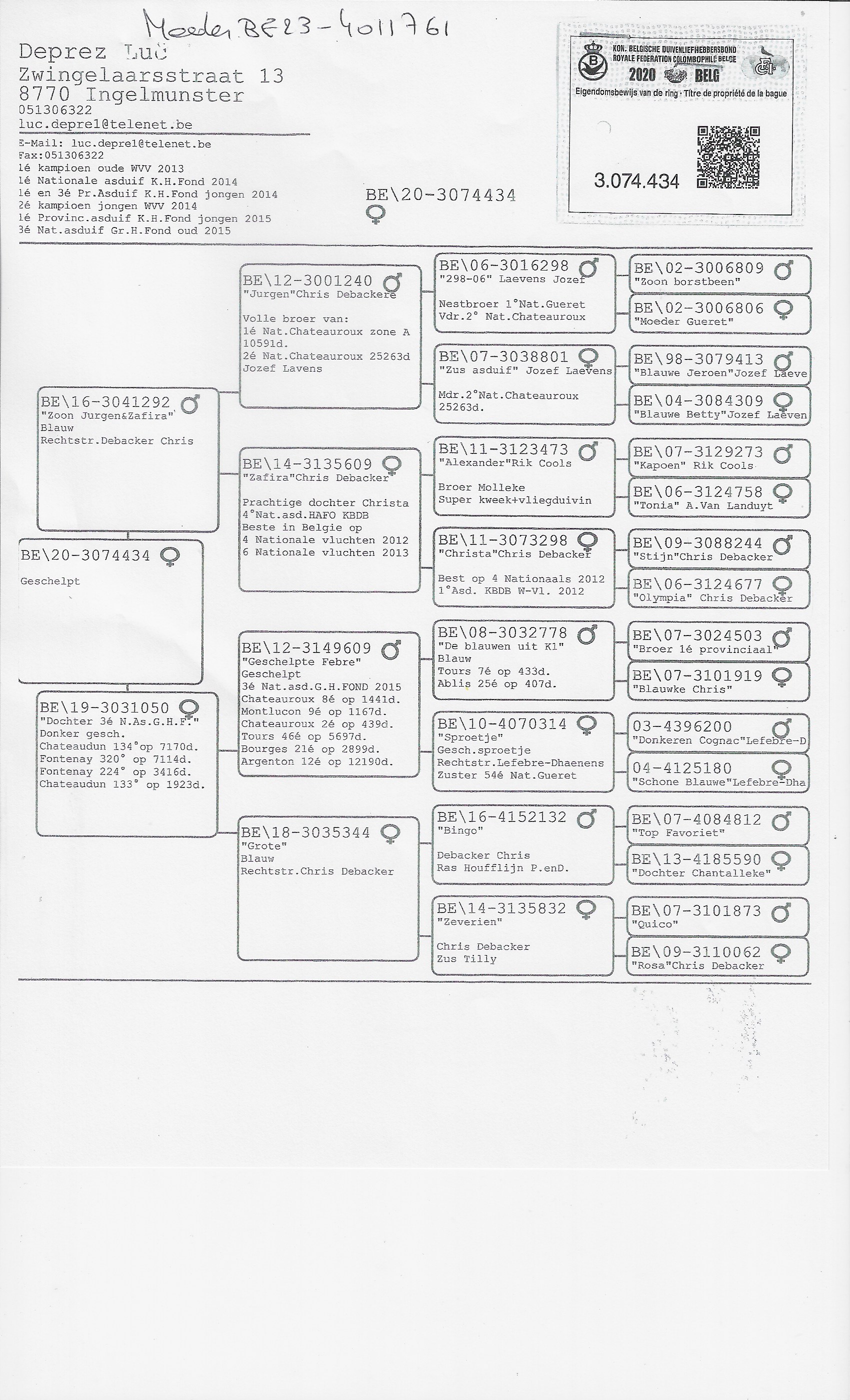 Langs moederszijde een 100% Luc Deprez duivin. Luc behaalde de titel van 1e Nationale Asduif Kleine Halve Fond bij jonge duiven . Duivin is reeds moeder van verschillende goede prestatievliegers. In haar lijn: via vaderszijde, 100% Chris Debacker, Beveren-Leie, uit zoon volle broer 1ste nationaal Chateauroux 10591dn, 2de nationaal Chateauroux 25263 dn met een dochter van Christa, 4de nat. Asduif HAFO KBDB. Via moederszijde, een dochter van 3de nat asduif grote halve fond, won oa 8ste Chateauroux 1441dn, 9de Montlucon 1167dn.