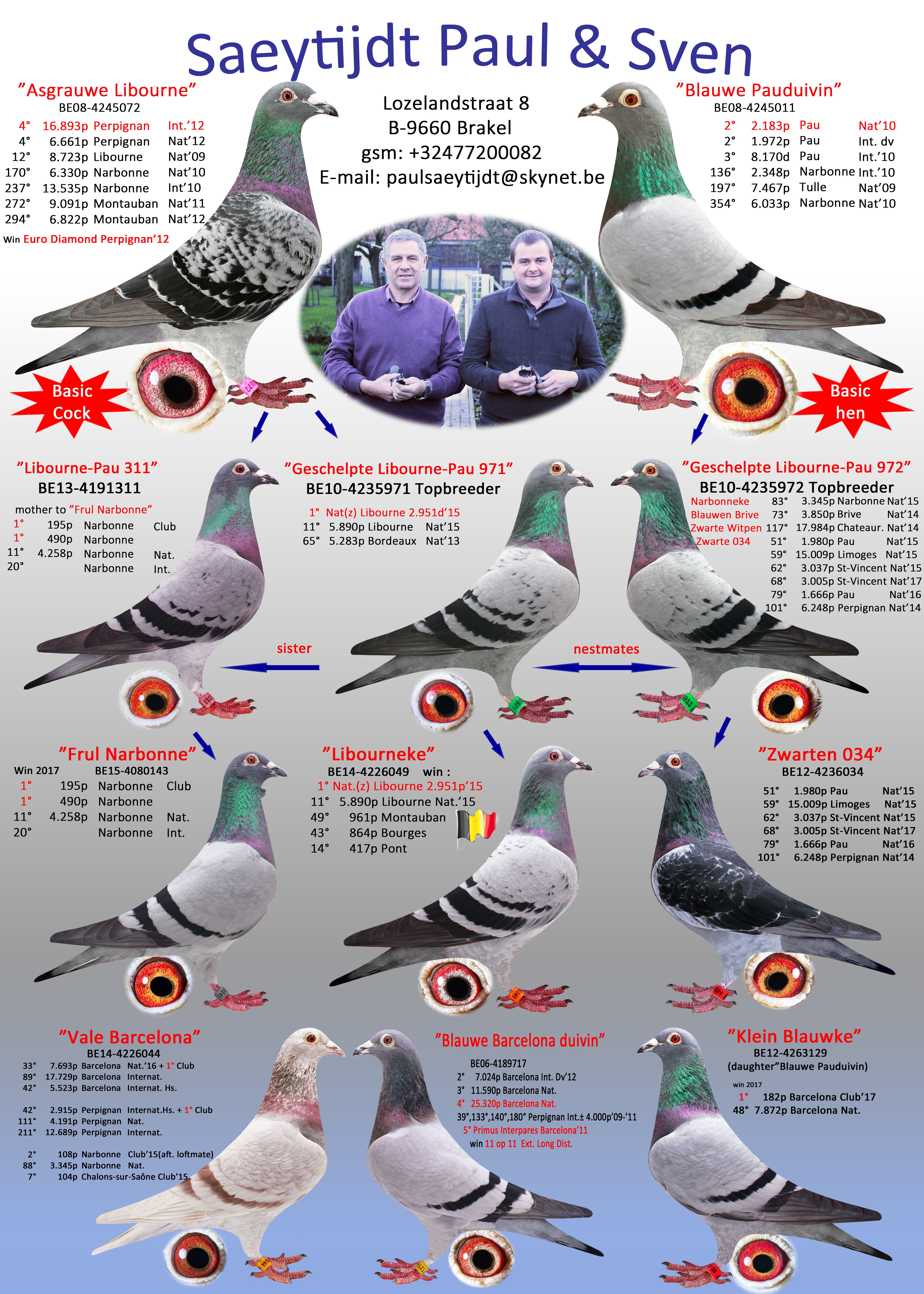 Deze doffer is afkomstig uit een sterke lijn van kampioensduiven en is een samenkweek met Van De Walle Marc & Franky. Hij is een zoon van 4292770/2009 Den Bordeaux en een kleinzoon van 4245072/2008 Asgrauwe Libourne (stamvader Saeytijdt) en 4189717/2006 Blauwe Barcelona (stammoeder Saeytijdt).