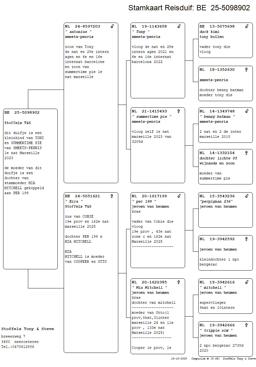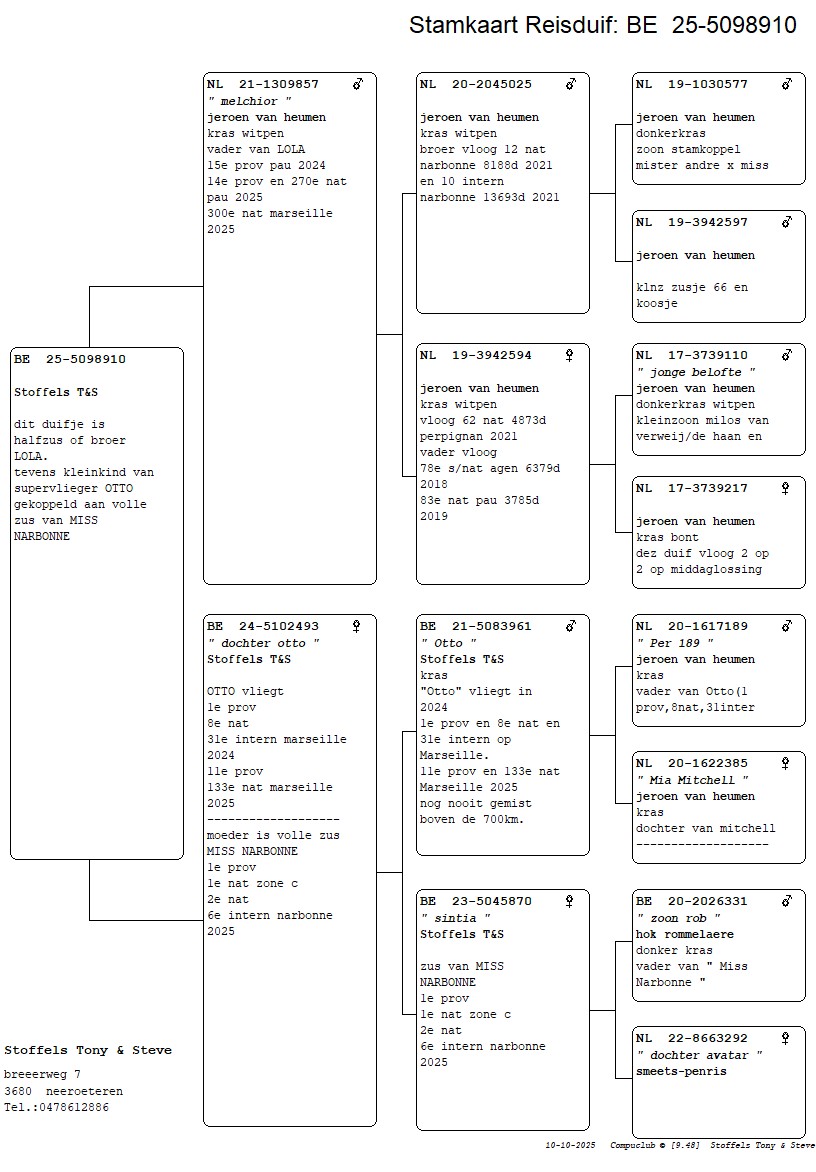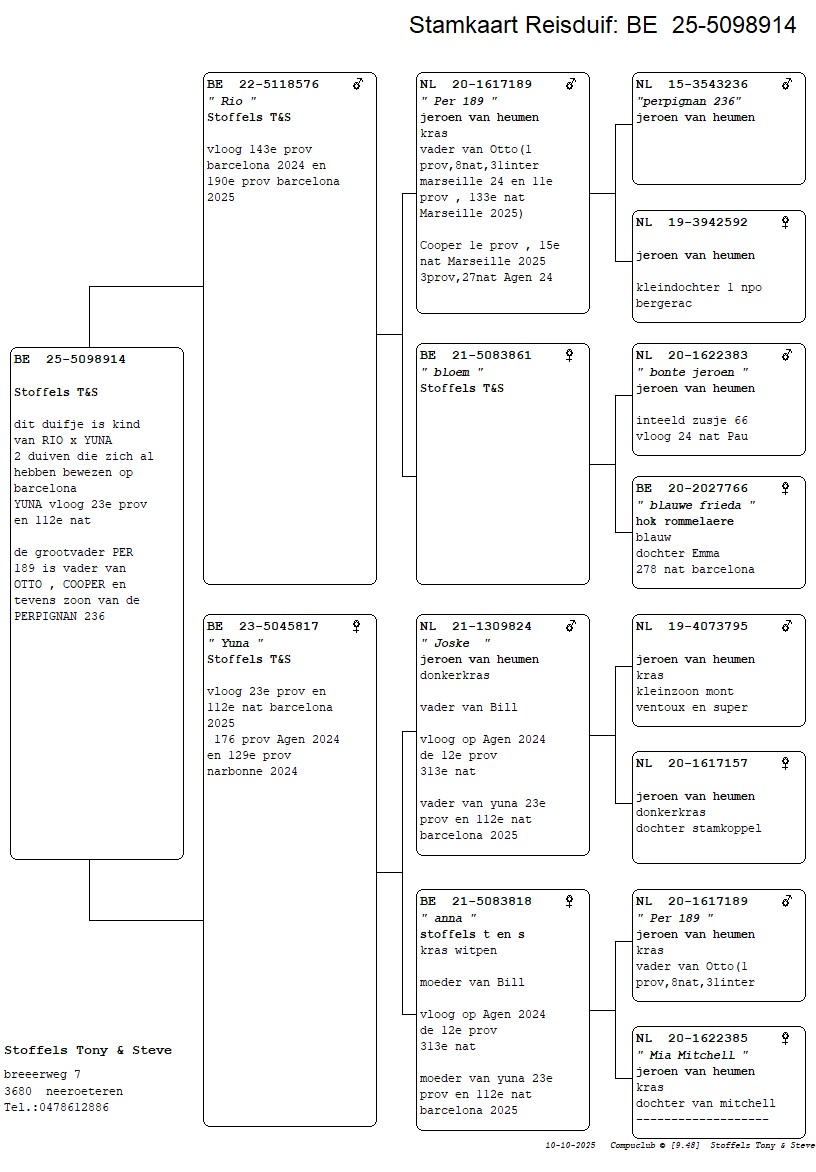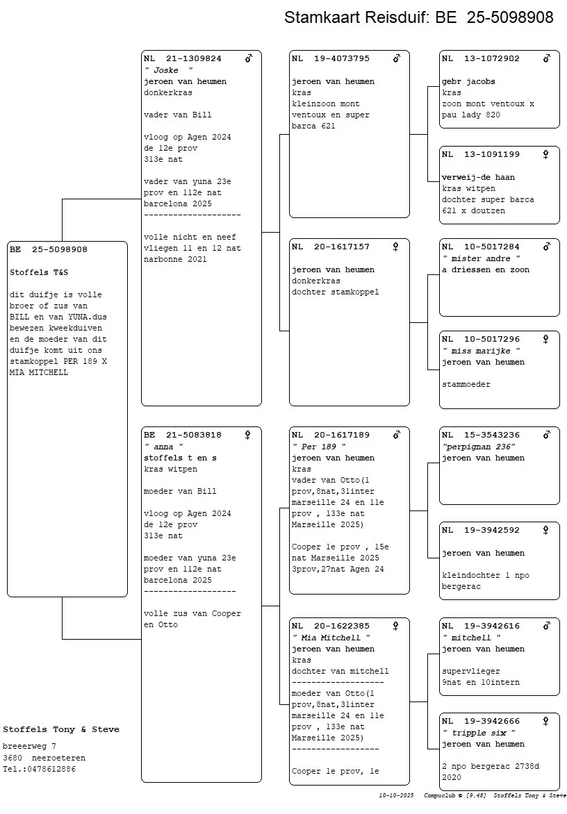 Is volle broer/zus van “Bill” en “Yuna”, bewezen kweekduiven. Moeder van dit duifje komt uit stamkoppel “Per 189” x “Mia Michell”