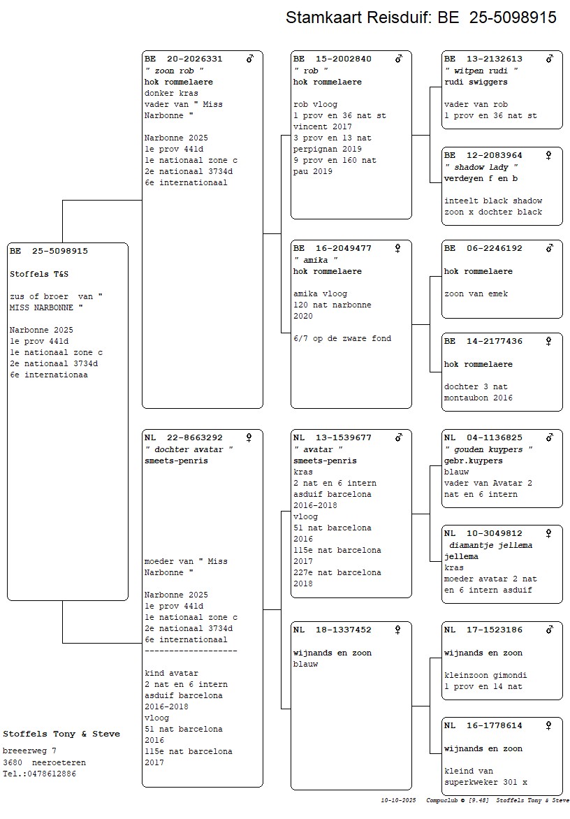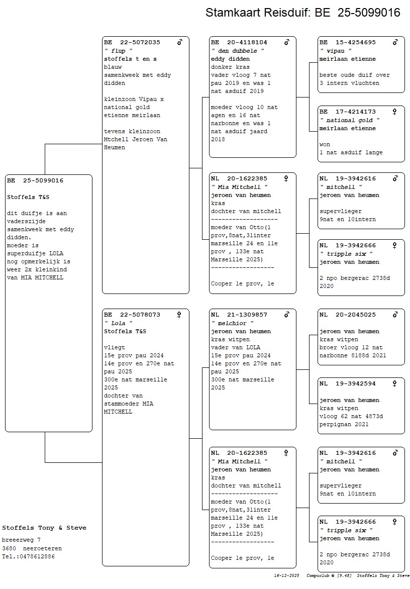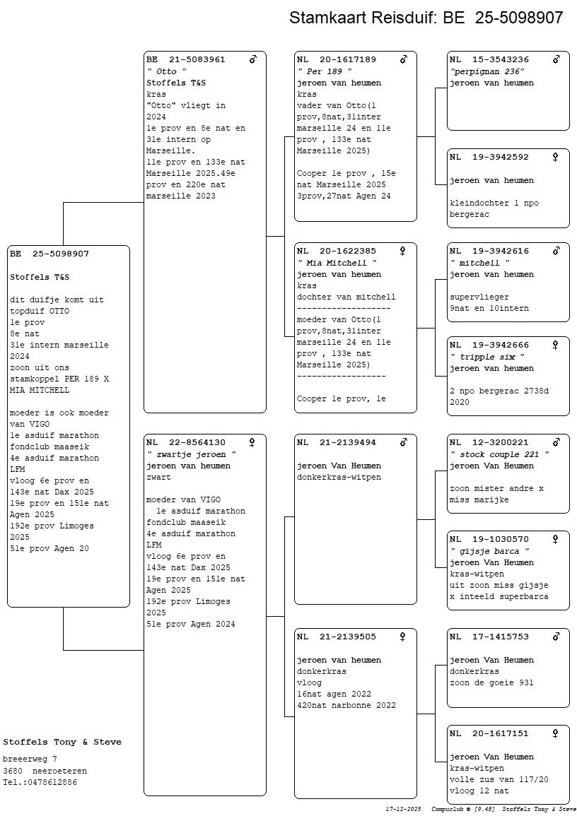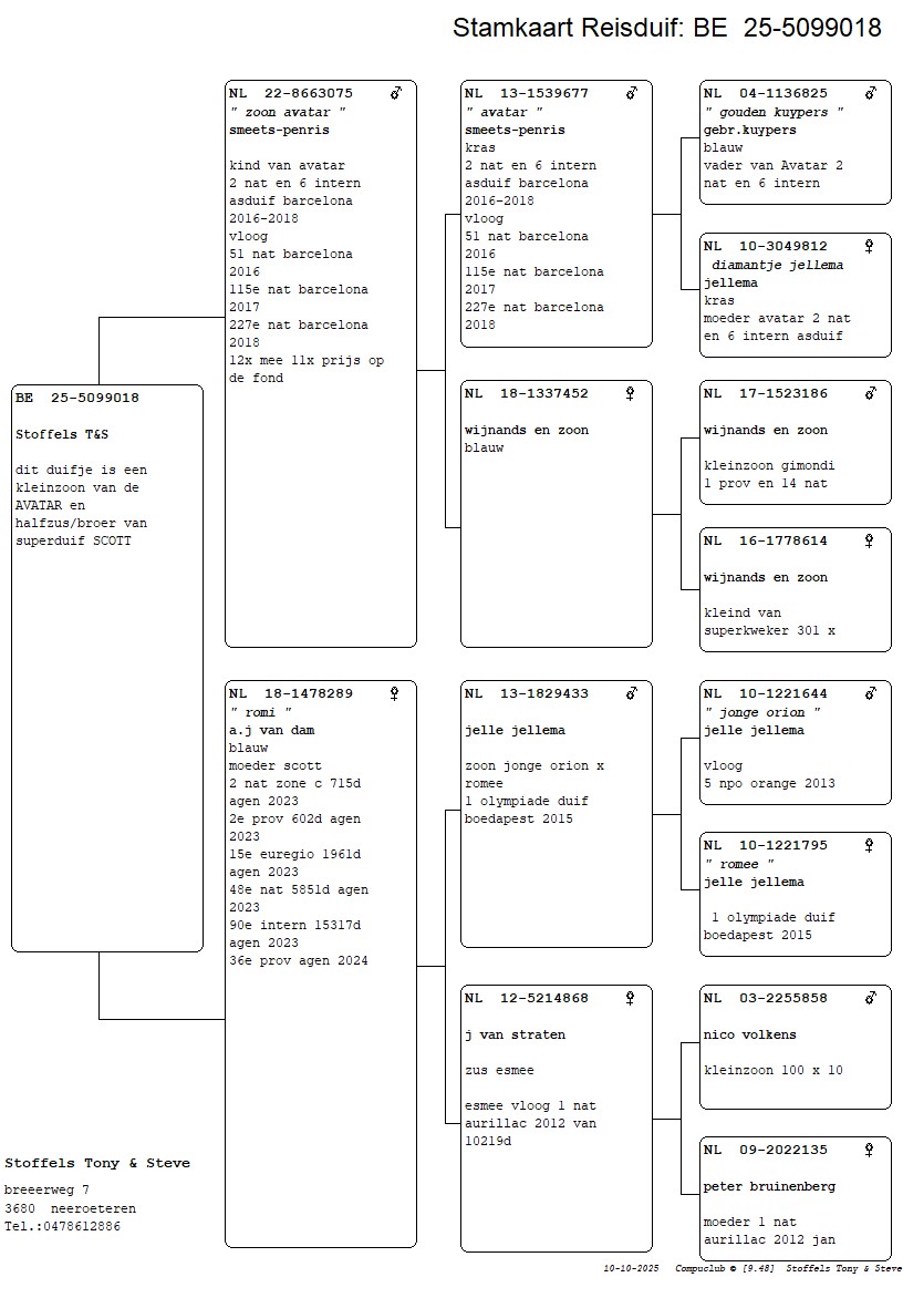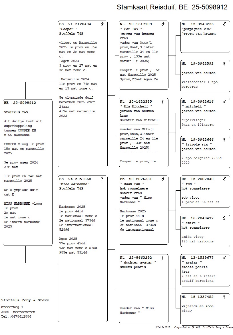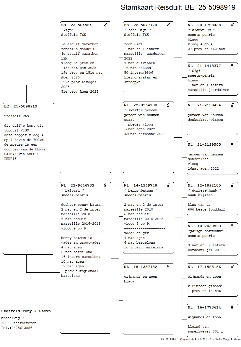 De Stoffels-kolonie bestaat voor 70% uit duiven van Jeroen Van Heumen (NL), aangevuld met hoofdzakelijk Smeets-Penris en een tikkeltje Jacobs (NL) en Zwiers (NL) nog hierbij. In deze veiling bieden zij wederom een formidabel lot late jonge duiven aan die enkel uit de beste kwekers en vliegers komen. Wie deze niet in huis haalt, zal er spijt van hebben!