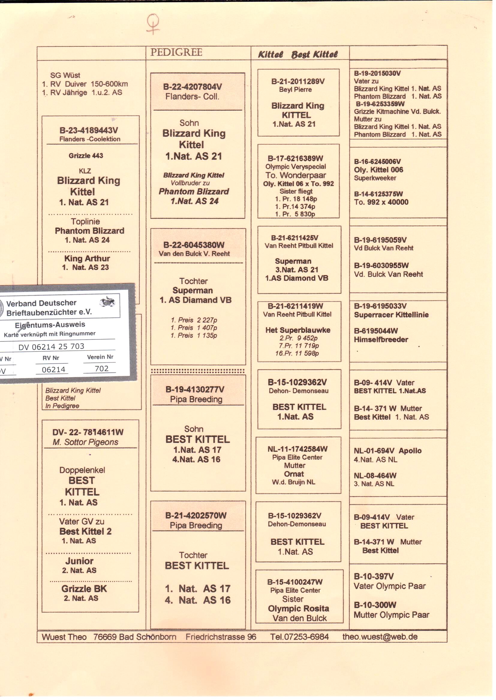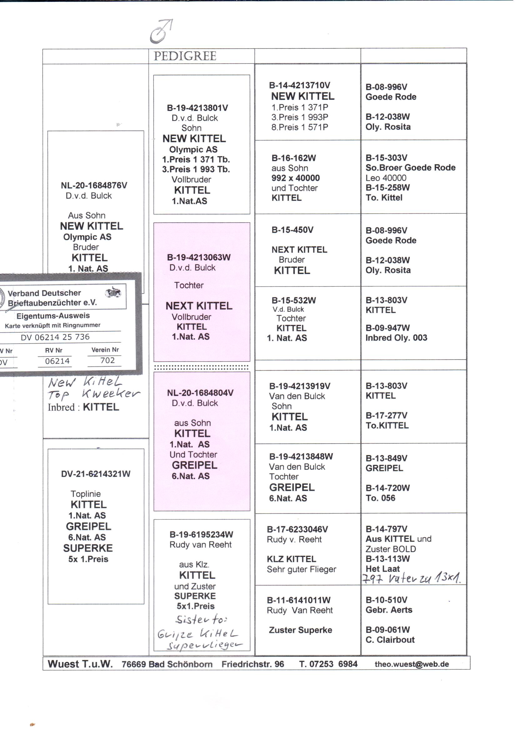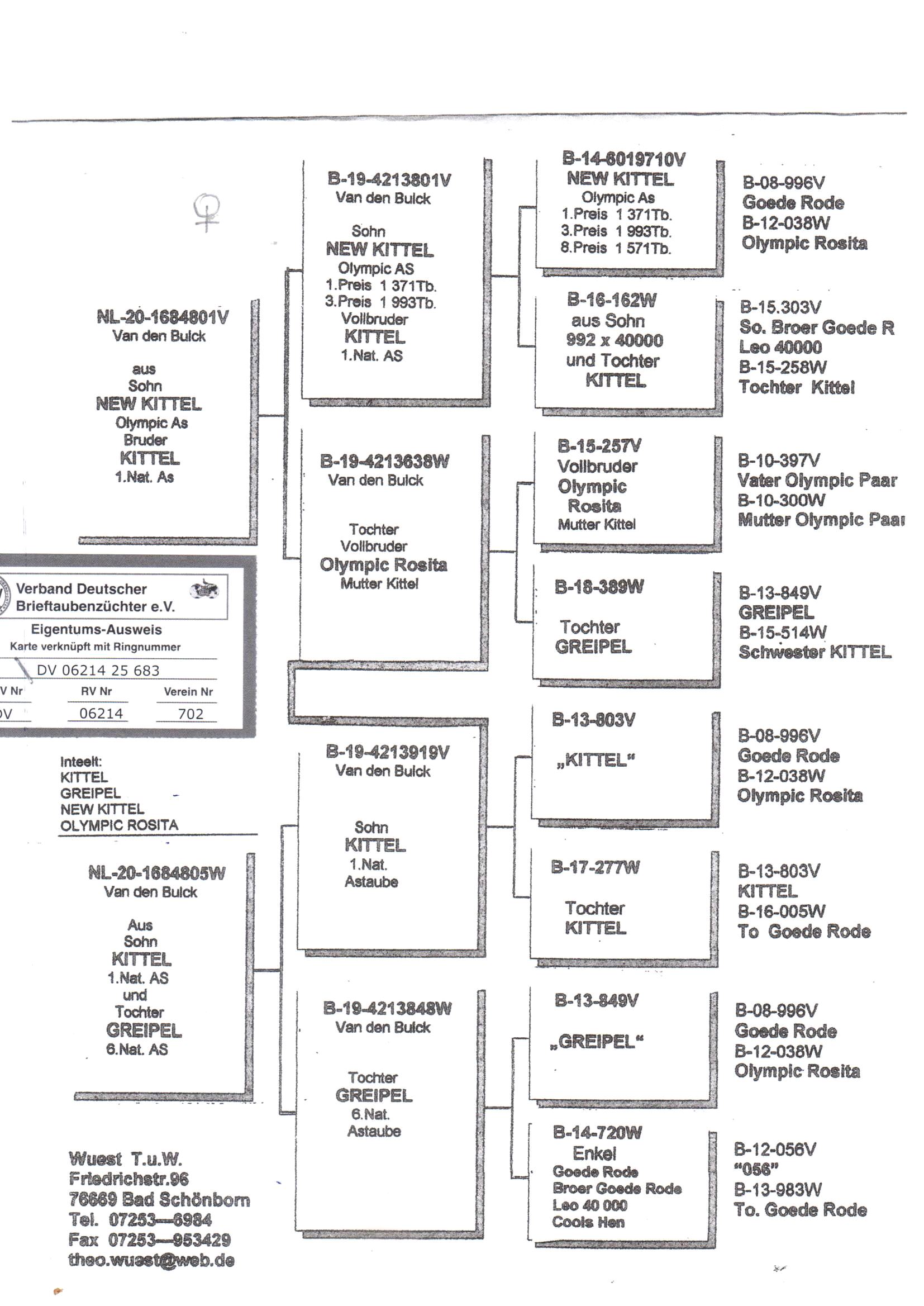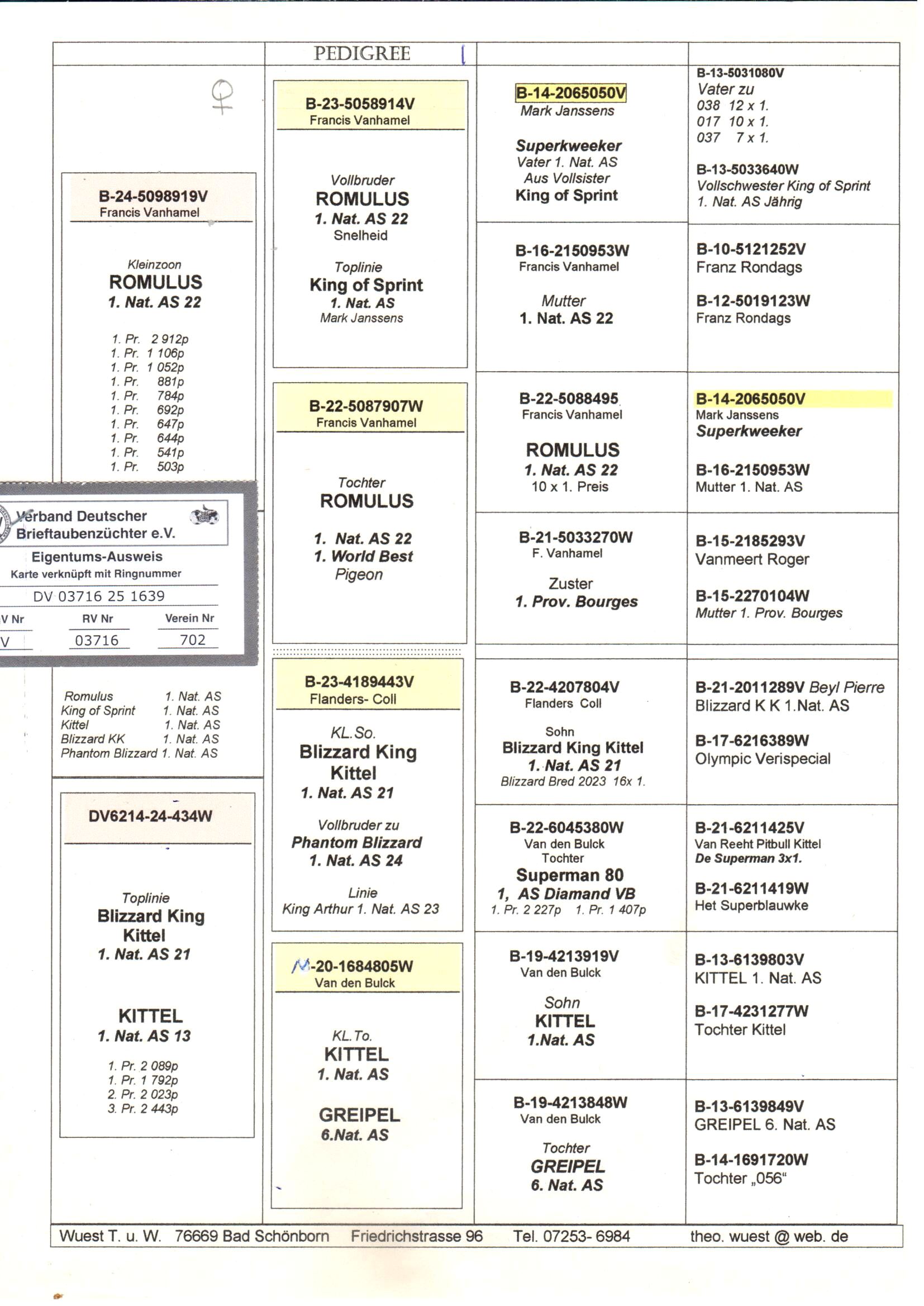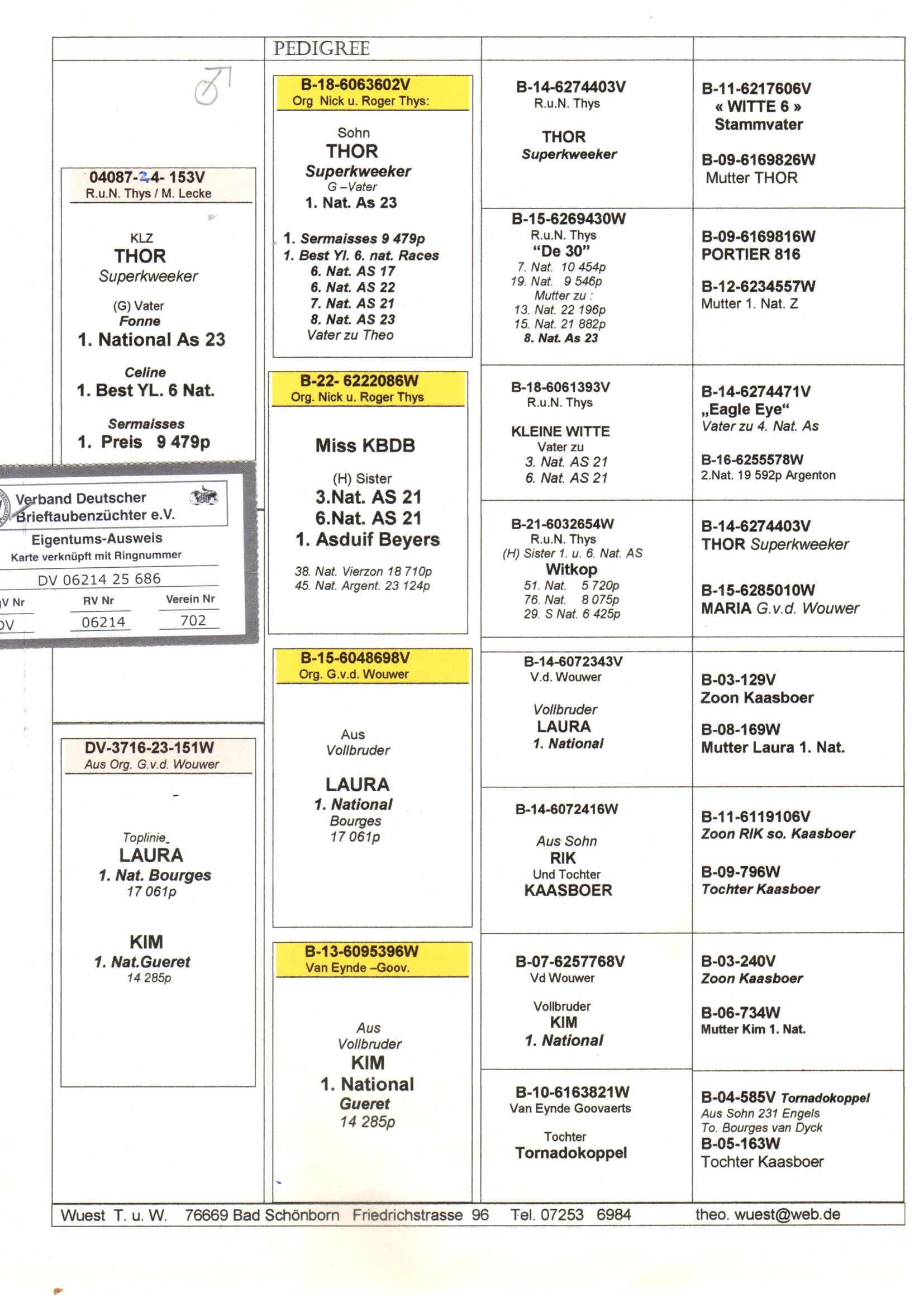 In het Duitse Bad Schönborn, gelegen halverwege tussen Frankfurt en Stuttgart, bevinden zich de hokken van Theo Wüst. Jarenlang gaat hij reeds op zoek naar afstammelingen van de allerbeste duiven ter wereld en hij bespaarde kosten noch moeite om deze in huis te halen. Wereldnamen als Kittel, Greipel, Porsche, White Man, Olympic Rico, Kaasboer, Wonderboy, Jackpot, Special One, Golden Prince, Harry, Jef, Champ, Murphy's Law, Di Caprio... zijn de stokpaardjes van het kweekhok van Theo Wüst. Zijn neus voor topduiven bracht hem bij de beste liefhebbers wereldwijd en zorgde ervoor dat het intussen één van de meest gerenommeerde hokken werd, met talrijke referenties in binnen- en buitenland!