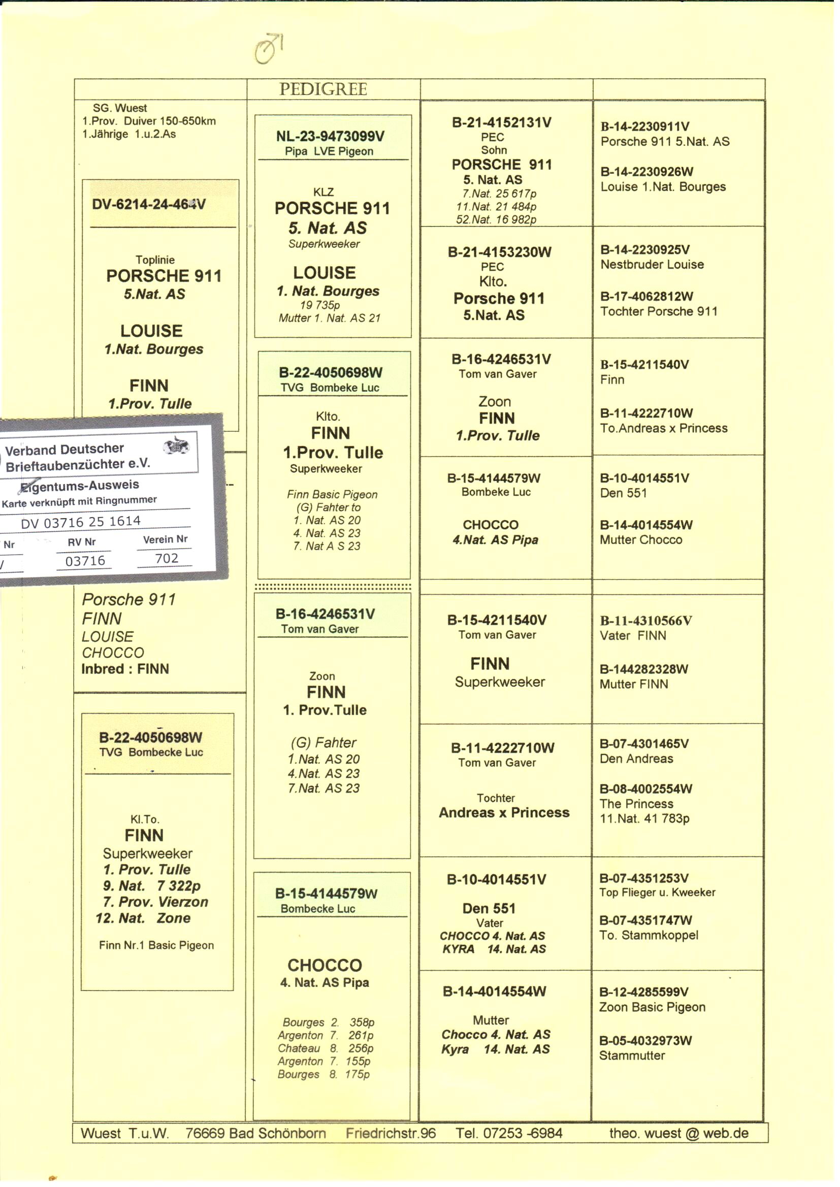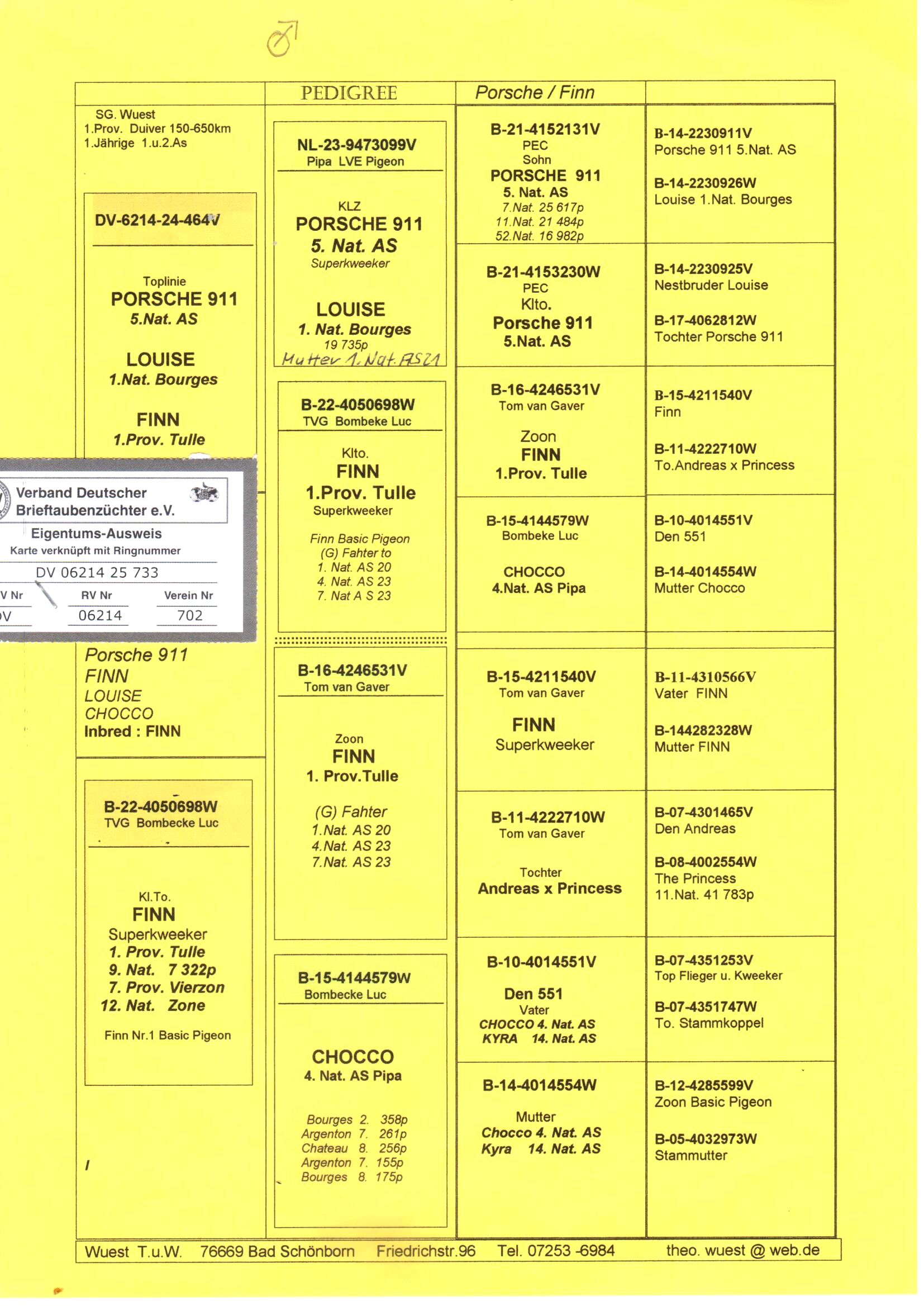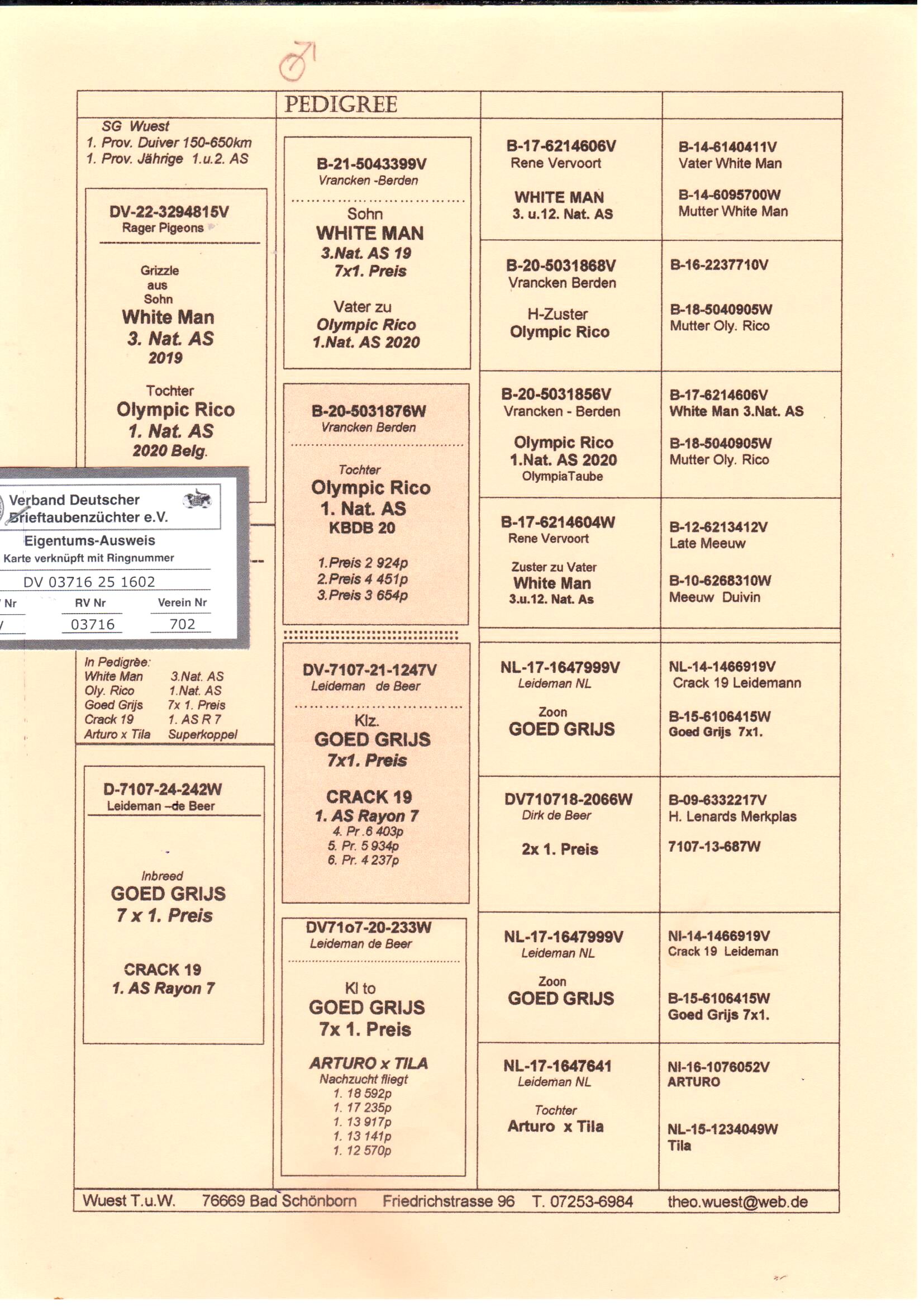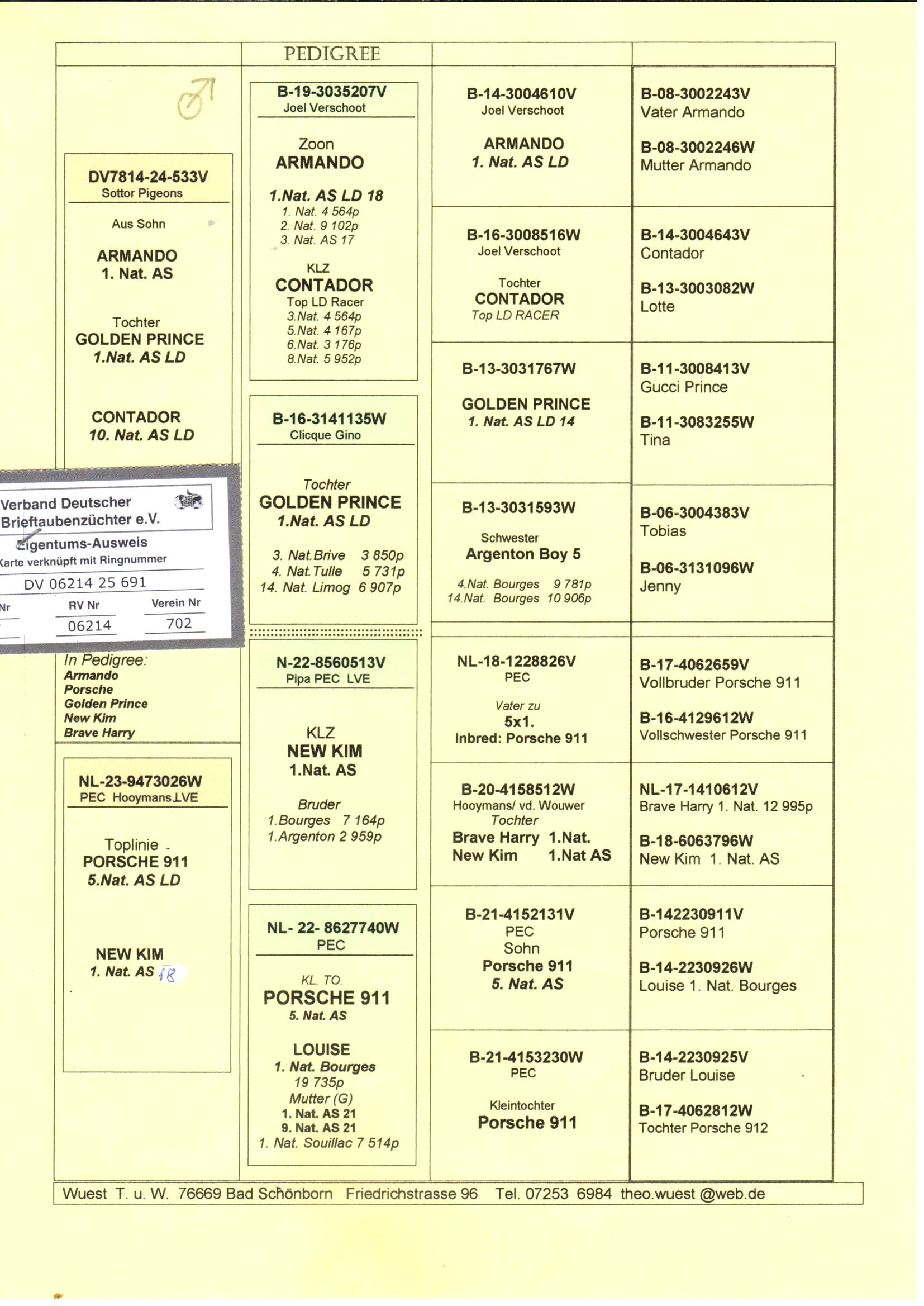 In het Duitse Bad Schönborn, gelegen halverwege tussen Frankfurt en Stuttgart, bevinden zich de hokken van Theo Wüst. Jarenlang gaat hij reeds op zoek naar afstammelingen van de allerbeste duiven ter wereld en hij bespaarde kosten noch moeite om deze in huis te halen. Wereldnamen als Kittel, Greipel, Porsche, White Man, Olympic Rico, Kaasboer, Wonderboy, Jackpot, Special One, Golden Prince, Harry, Jef, Champ, Murphy's Law, Di Caprio... zijn de stokpaardjes van het kweekhok van Theo Wüst. Zijn neus voor topduiven bracht hem bij de beste liefhebbers wereldwijd en zorgde ervoor dat het intussen één van de meest gerenommeerde hokken werd, met talrijke referenties in binnen- en buitenland!