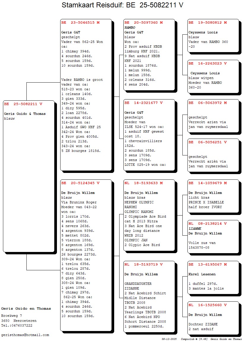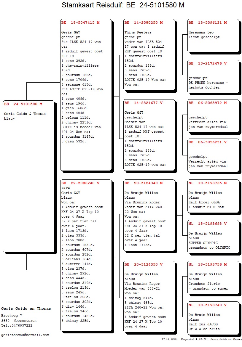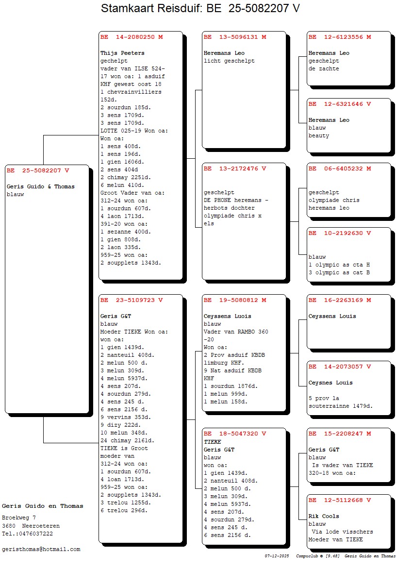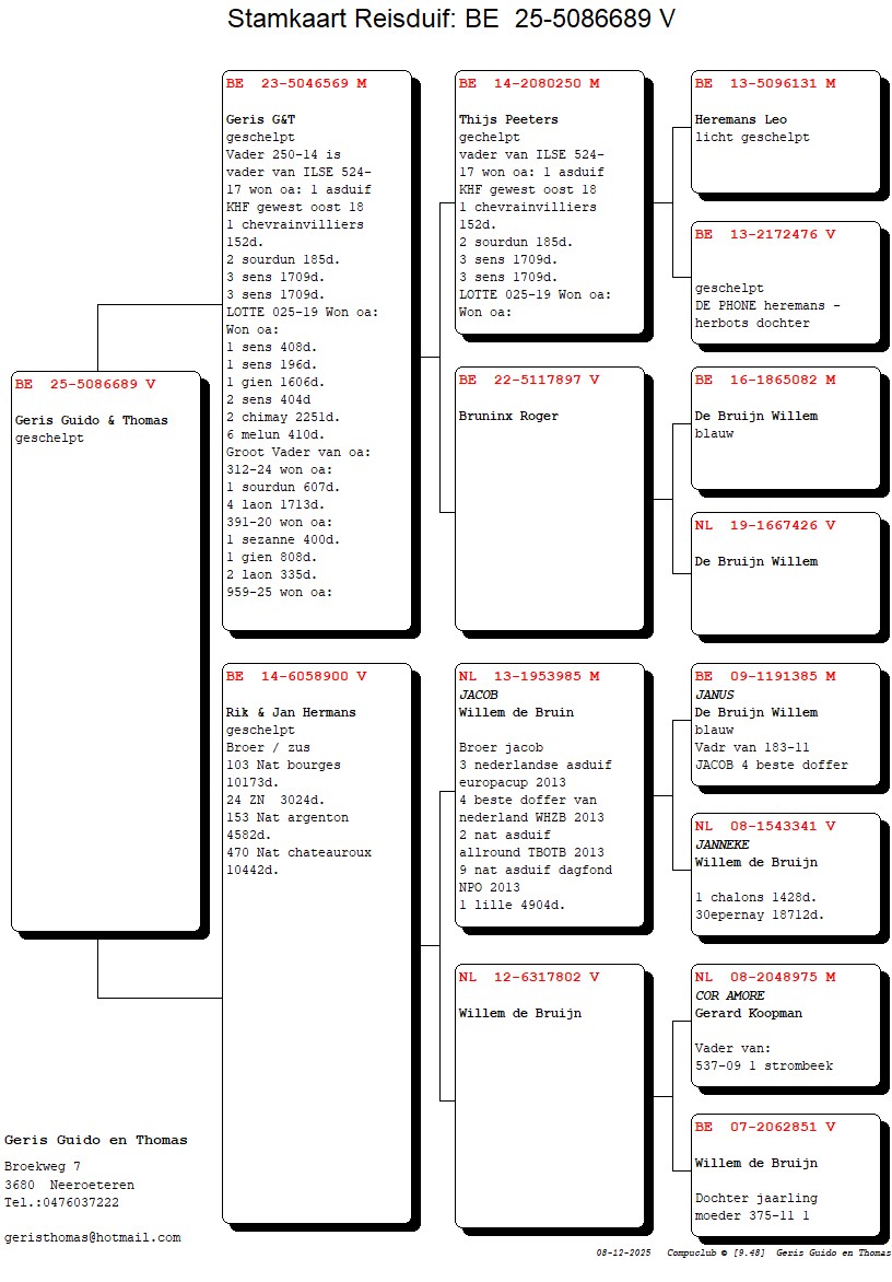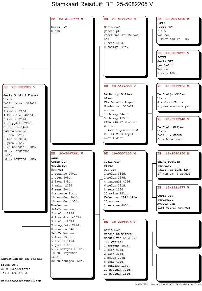 Met provinciale zeges uit Gien (2x) en Soulliac en Grootgewestelijke overwinningen aan de lopende band, mogen we vader en zoon Geris terecht onder de allerbeste liefhebbers van Limburg catalogeren. Ze slagen er wekelijks in hun geliefkoosde halve fondspel naar hun hand te zetten en ook het uitbreiden van hun horizon naar de zware halve fond en fond bracht hen allerminst in verlegenheid. We mogen dus gerust spreken van een allroundkolonie waarbij kopvliegen van 100 tot 800km simpelweg in de genen zit ingebakken. Met een lot werkelijk magnifieke duiven maakten Guido en Thomas Geris vorig jaar hun veilingdebuut op Pitts en ook dit jaar is het een groep om duiven en vingers van af te likken! Versterking verzekerd als je het ons vraagt!