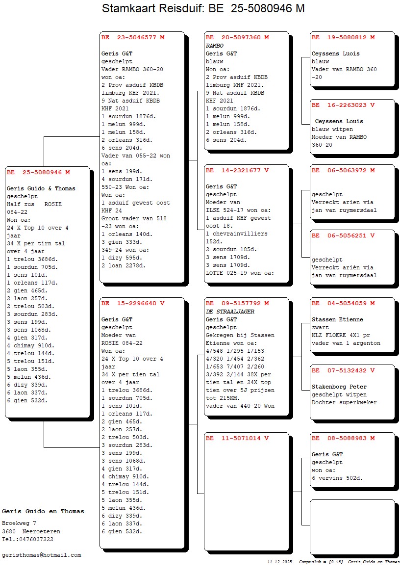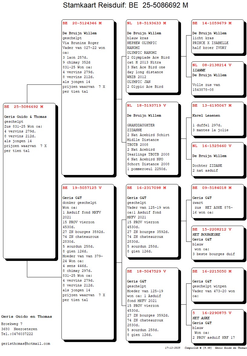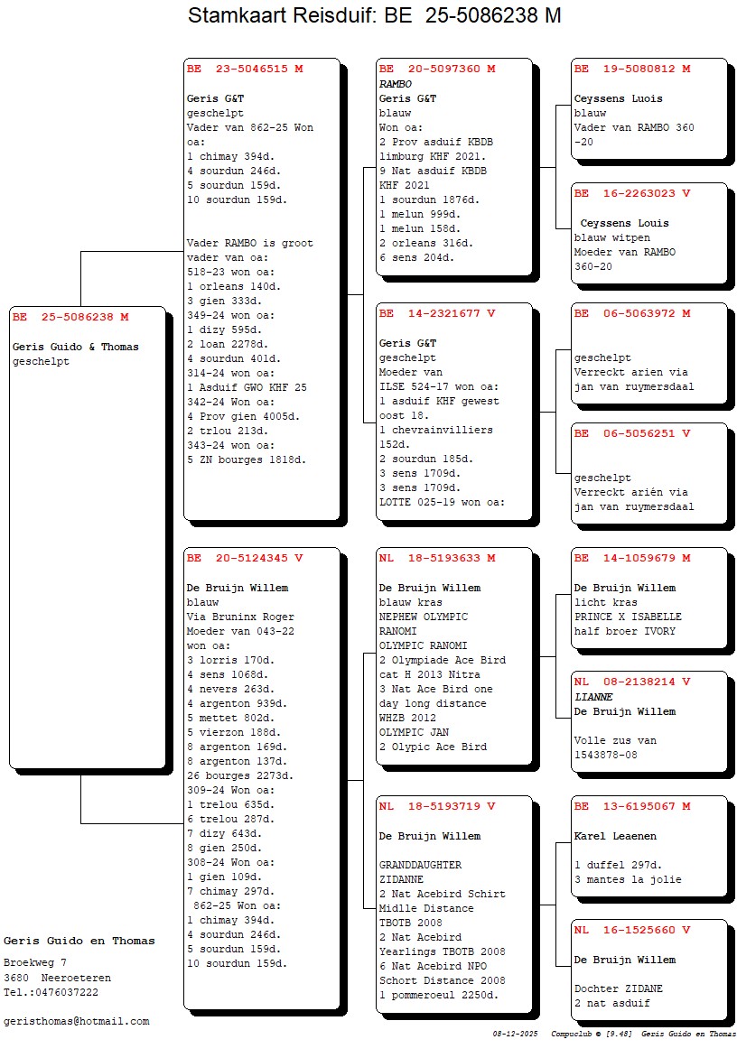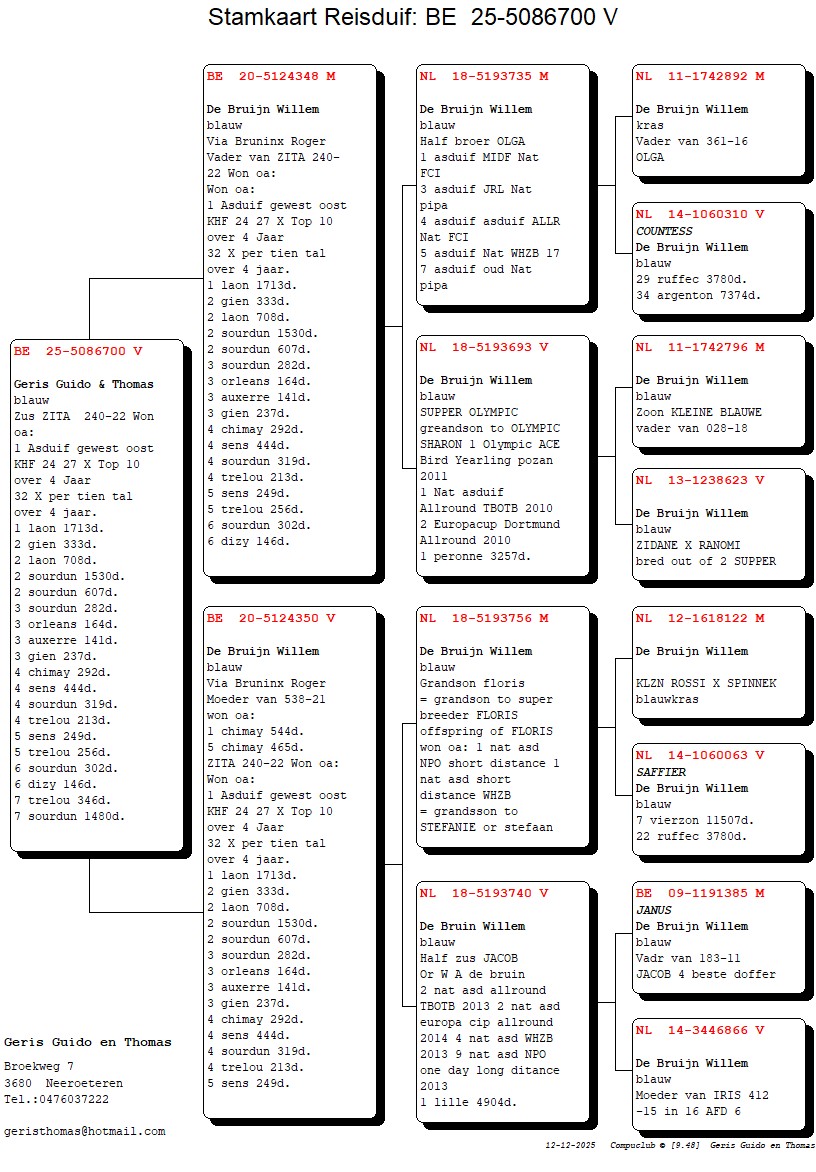 Met provinciale zeges uit Gien (2x) en Soulliac en Grootgewestelijke overwinningen aan de lopende band, mogen we vader en zoon Geris terecht onder de allerbeste liefhebbers van Limburg catalogeren. Ze slagen er wekelijks in hun geliefkoosde halve fondspel naar hun hand te zetten en ook het uitbreiden van hun horizon naar de zware halve fond en fond bracht hen allerminst in verlegenheid. We mogen dus gerust spreken van een allroundkolonie waarbij kopvliegen van 100 tot 800km simpelweg in de genen zit ingebakken. Met een lot werkelijk magnifieke duiven maakten Guido en Thomas Geris vorig jaar hun veilingdebuut op Pitts en ook dit jaar is het een groep om duiven en vingers van af te likken! Versterking verzekerd als je het ons vraagt!