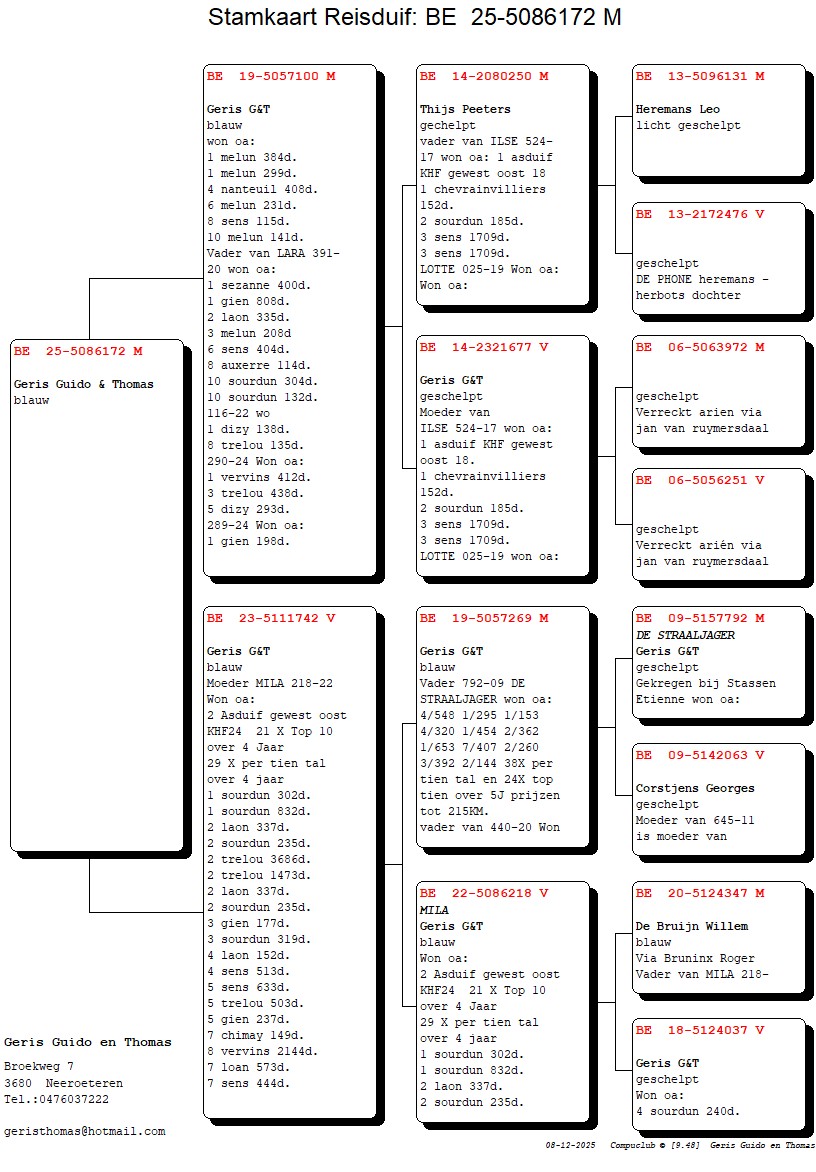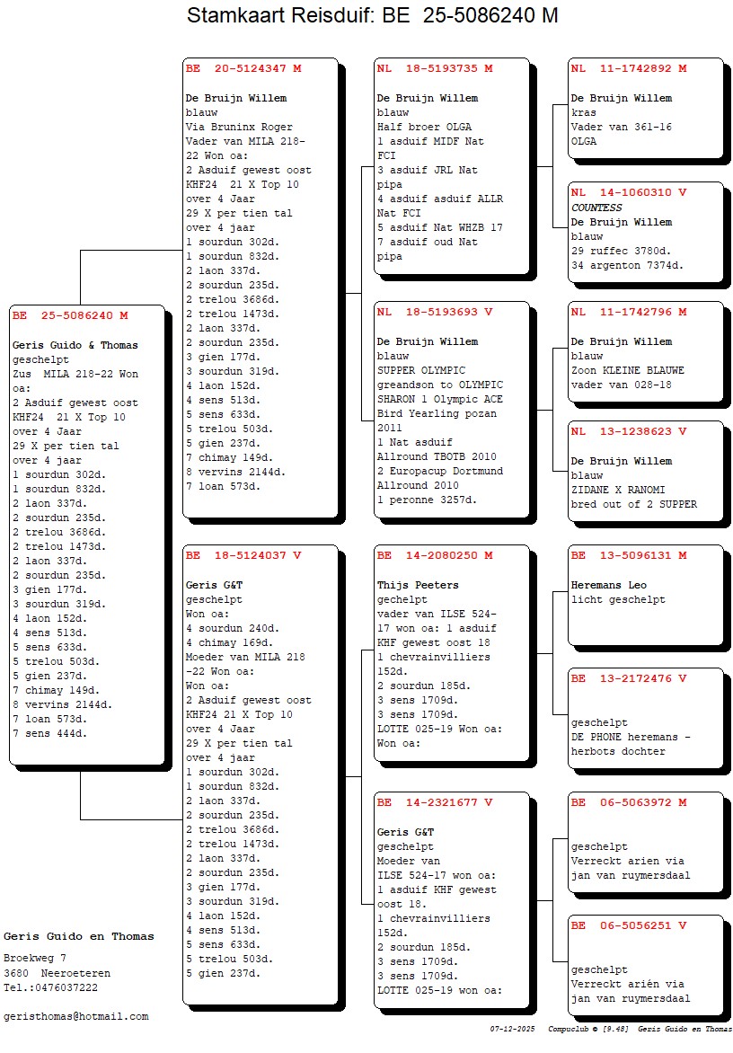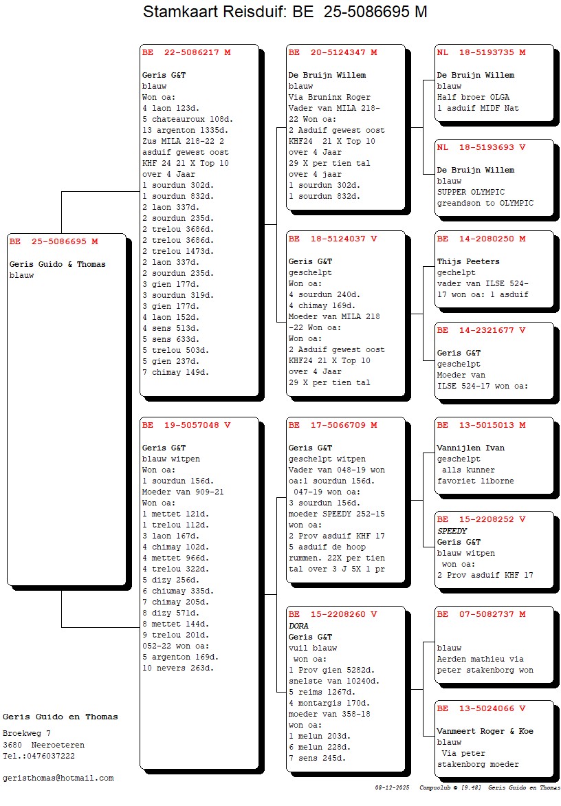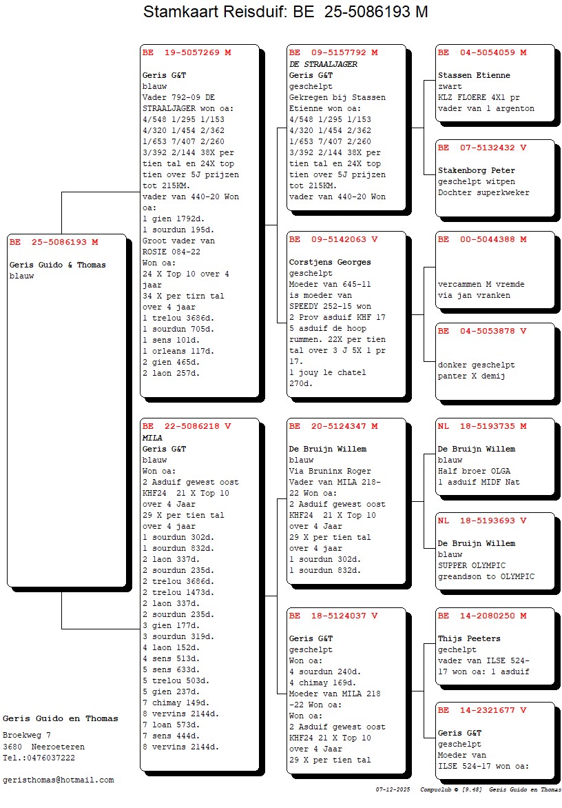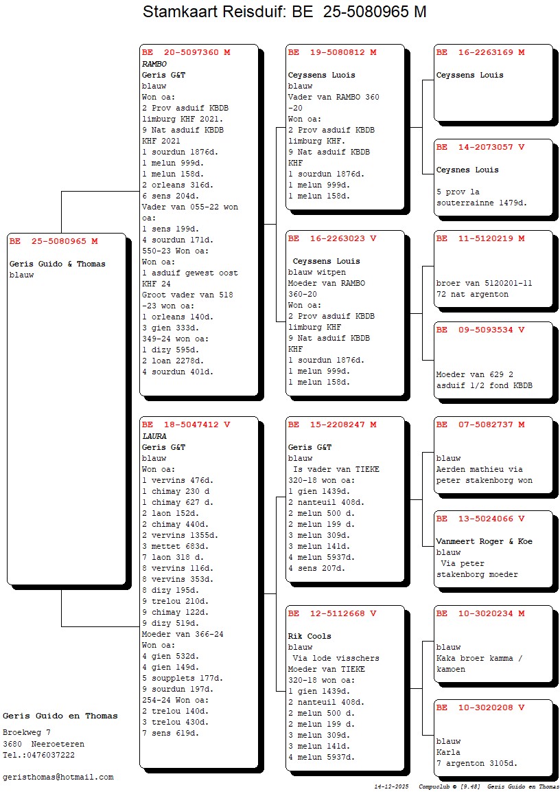 Met provinciale zeges uit Gien (2x) en Soulliac en Grootgewestelijke overwinningen aan de lopende band, mogen we vader en zoon Geris terecht onder de allerbeste liefhebbers van Limburg catalogeren. Ze slagen er wekelijks in hun geliefkoosde halve fondspel naar hun hand te zetten en ook het uitbreiden van hun horizon naar de zware halve fond en fond bracht hen allerminst in verlegenheid. We mogen dus gerust spreken van een allroundkolonie waarbij kopvliegen van 100 tot 800km simpelweg in de genen zit ingebakken. Met een lot werkelijk magnifieke duiven maakten Guido en Thomas Geris vorig jaar hun veilingdebuut op Pitts en ook dit jaar is het een groep om duiven en vingers van af te likken! Versterking verzekerd als je het ons vraagt!