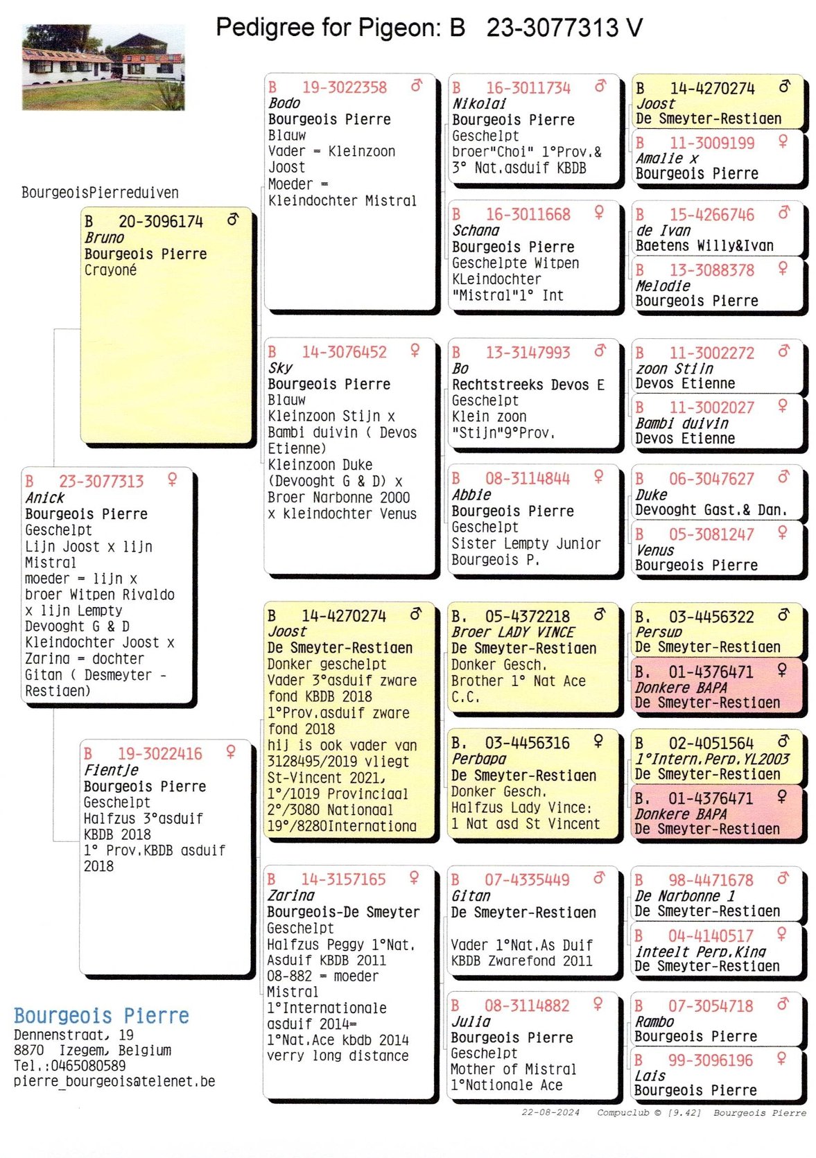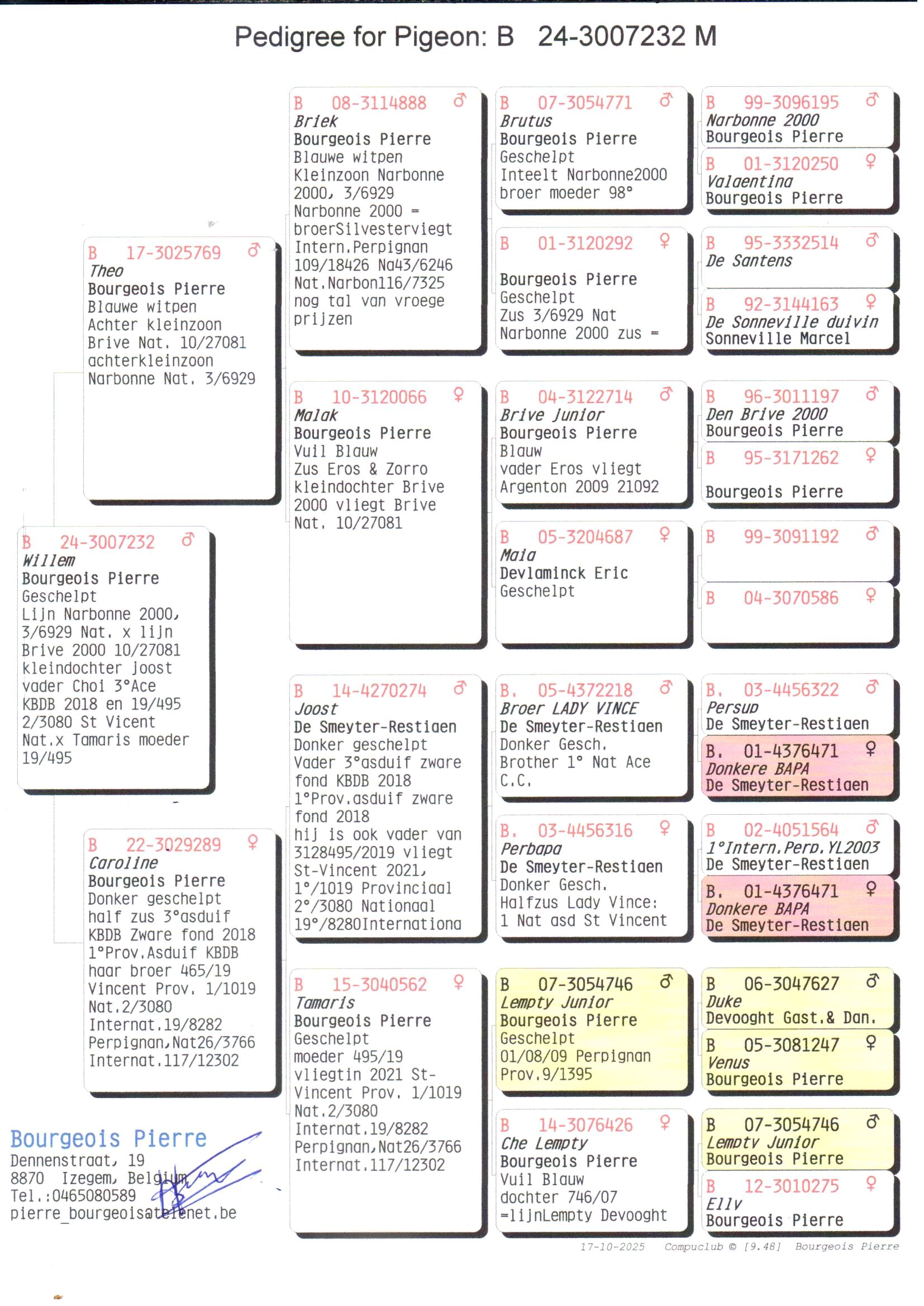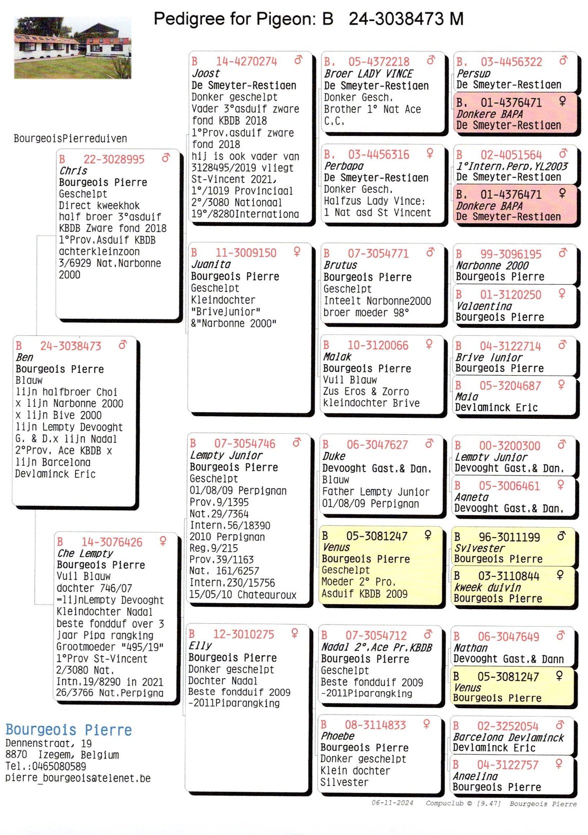 Dochter “Joost” (De Smeyter-Restiaen) Lijn 1. Internationaal Perpignan ’03, Vader van “Choi” 3. Nationale Asduif , 1. Provinciale Asduif KBDB Zware Fond 2018 x “Tamaris” (moeder van “Charles” 1.Provinciaal, 2. Nationaal St-Vincent 2021) Dochter “Lempty Junior” Vloog oa 56./18390 Internationaal Perpignan x “Che Lempty”(Lempty Lijn Devooght Gast. & Danny).