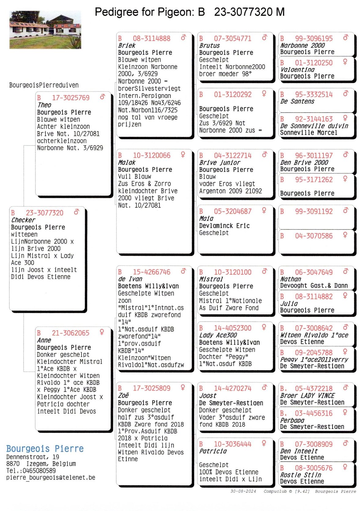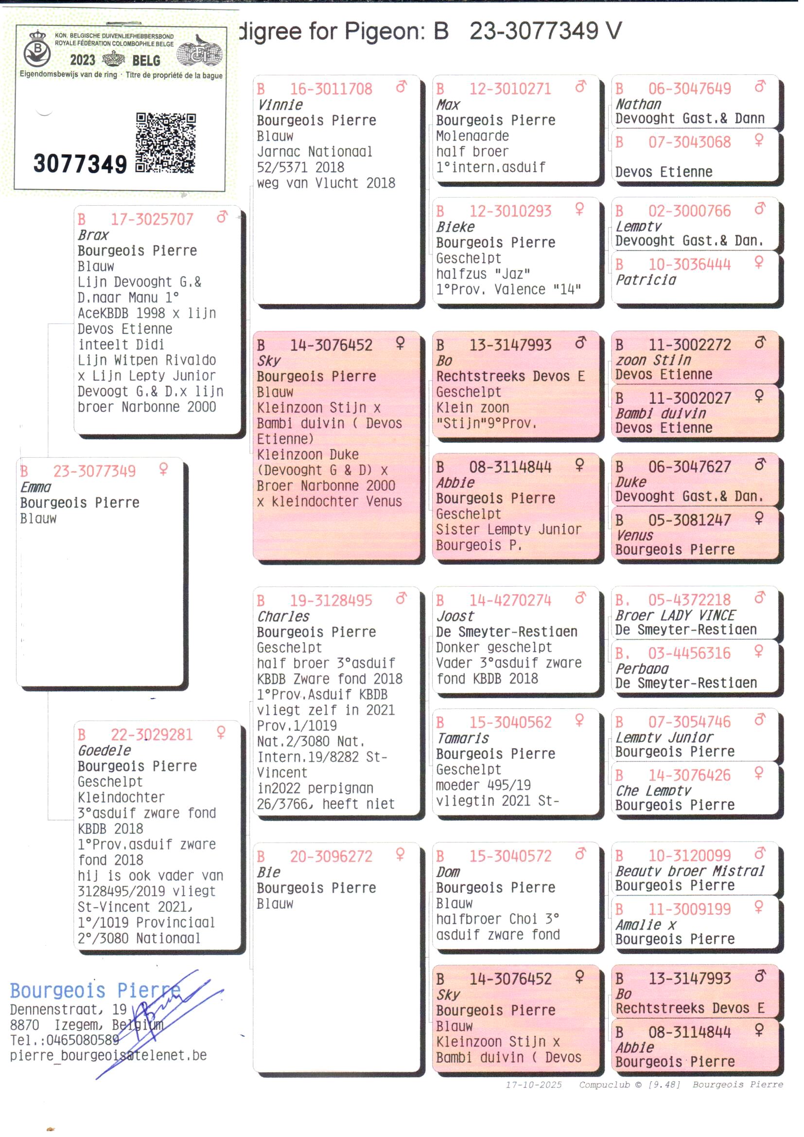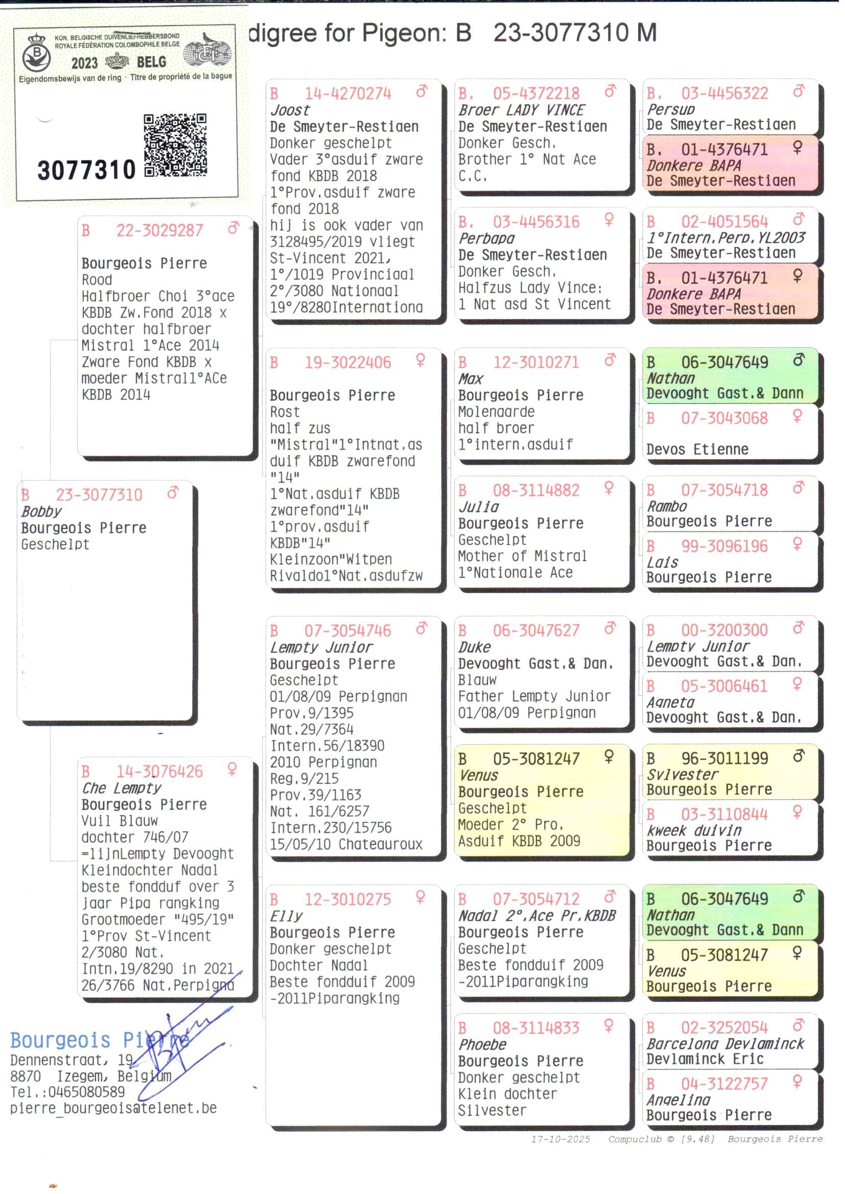 Dochter “Joost” (De Smeyter-Restiaen) Lijn 1. Internationaal Perpignan ’03, Vader van “Choi” 3. Nationale Asduif , 1. Provinciale Asduif KBDB Zware Fond 2018 x “Tamaris” (moeder van “Charles” 1.Provinciaal, 2. Nationaal St-Vincent 2021) Dochter “Lempty Junior” Vloog oa 56./18390 Internationaal Perpignan x “Che Lempty”(Lempty Lijn Devooght Gast. & Danny).