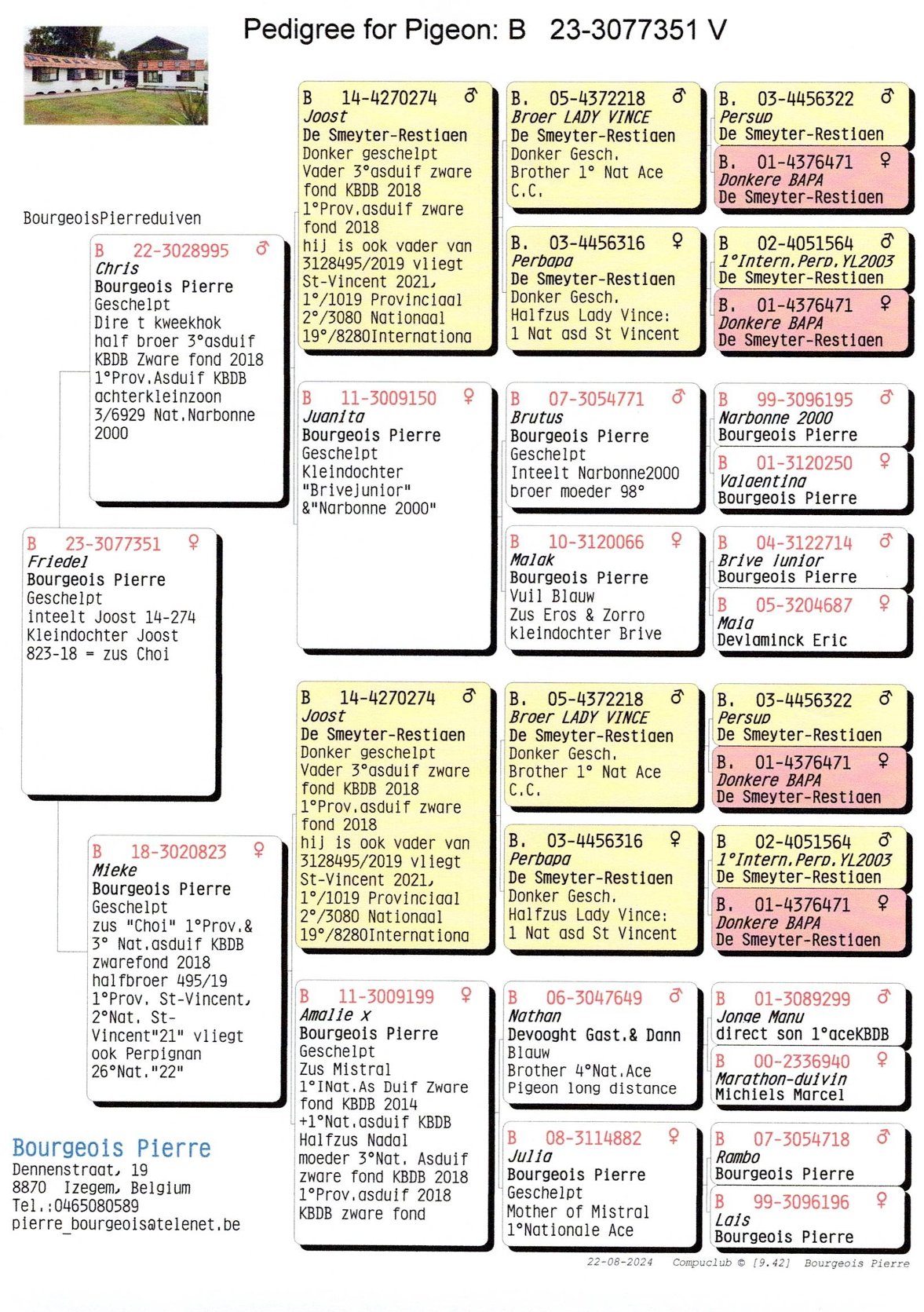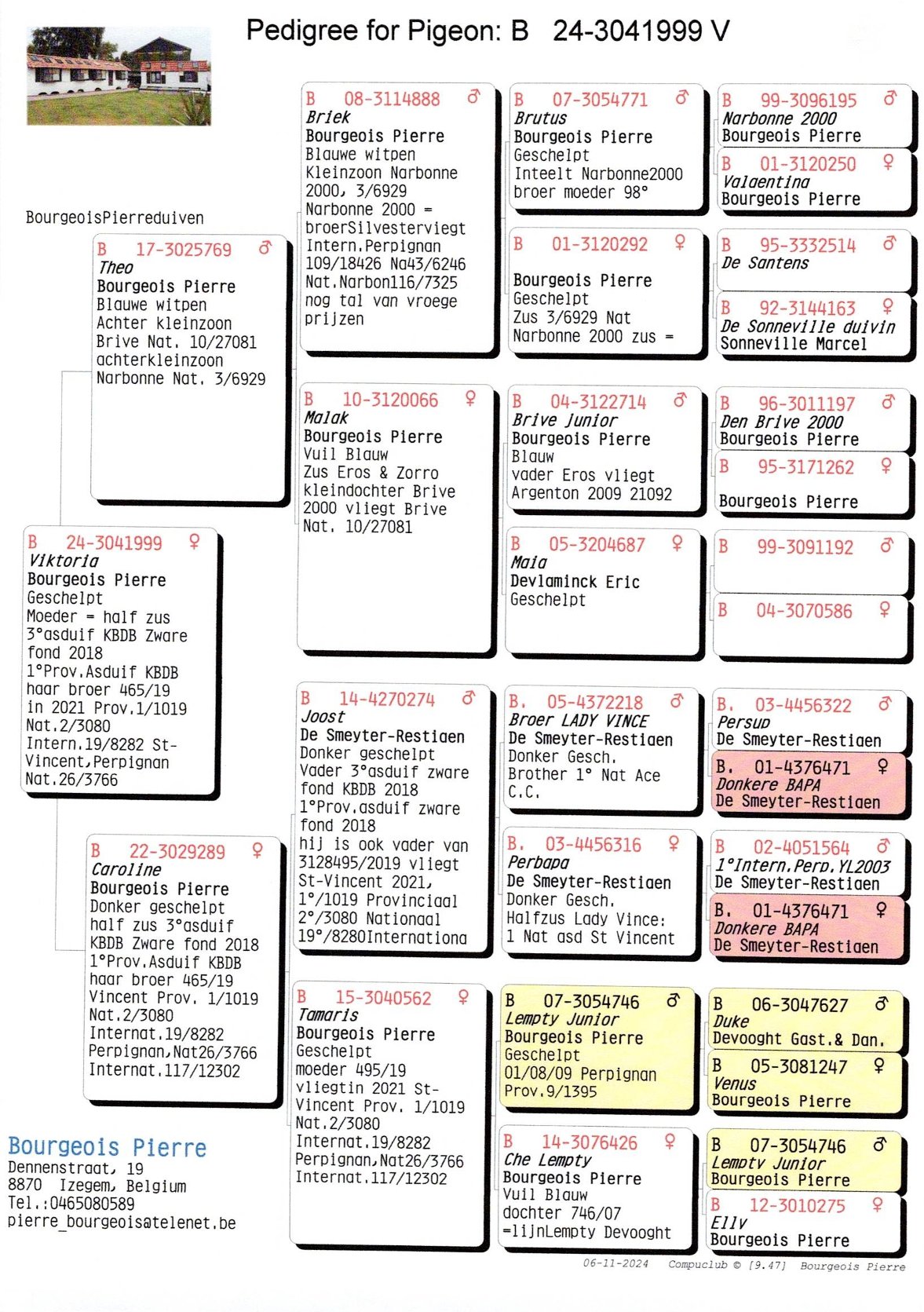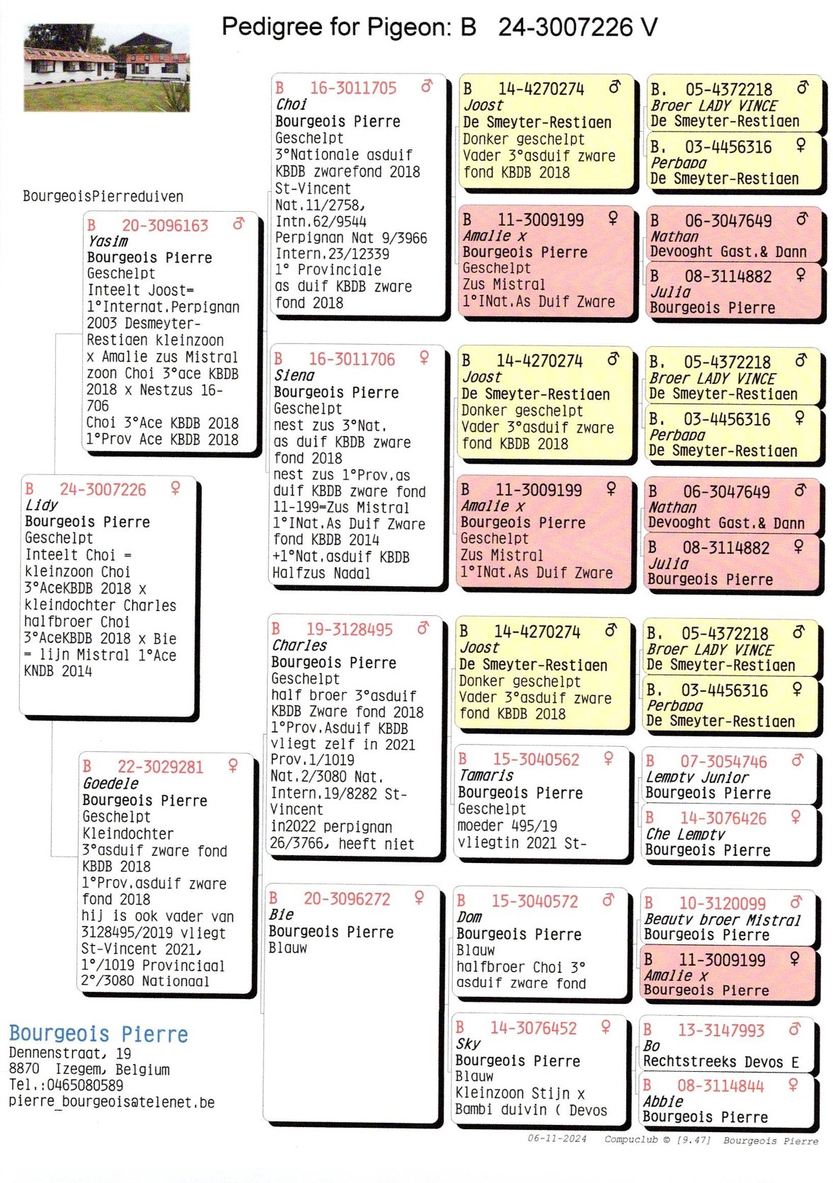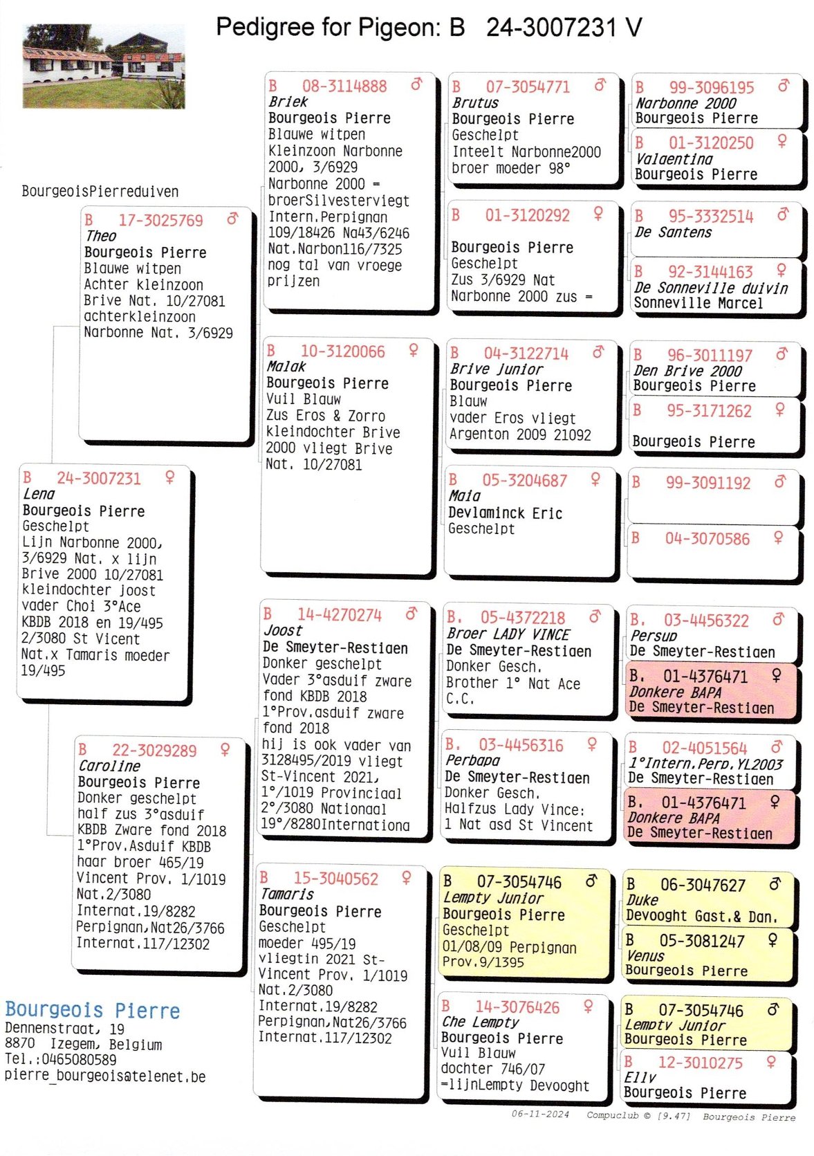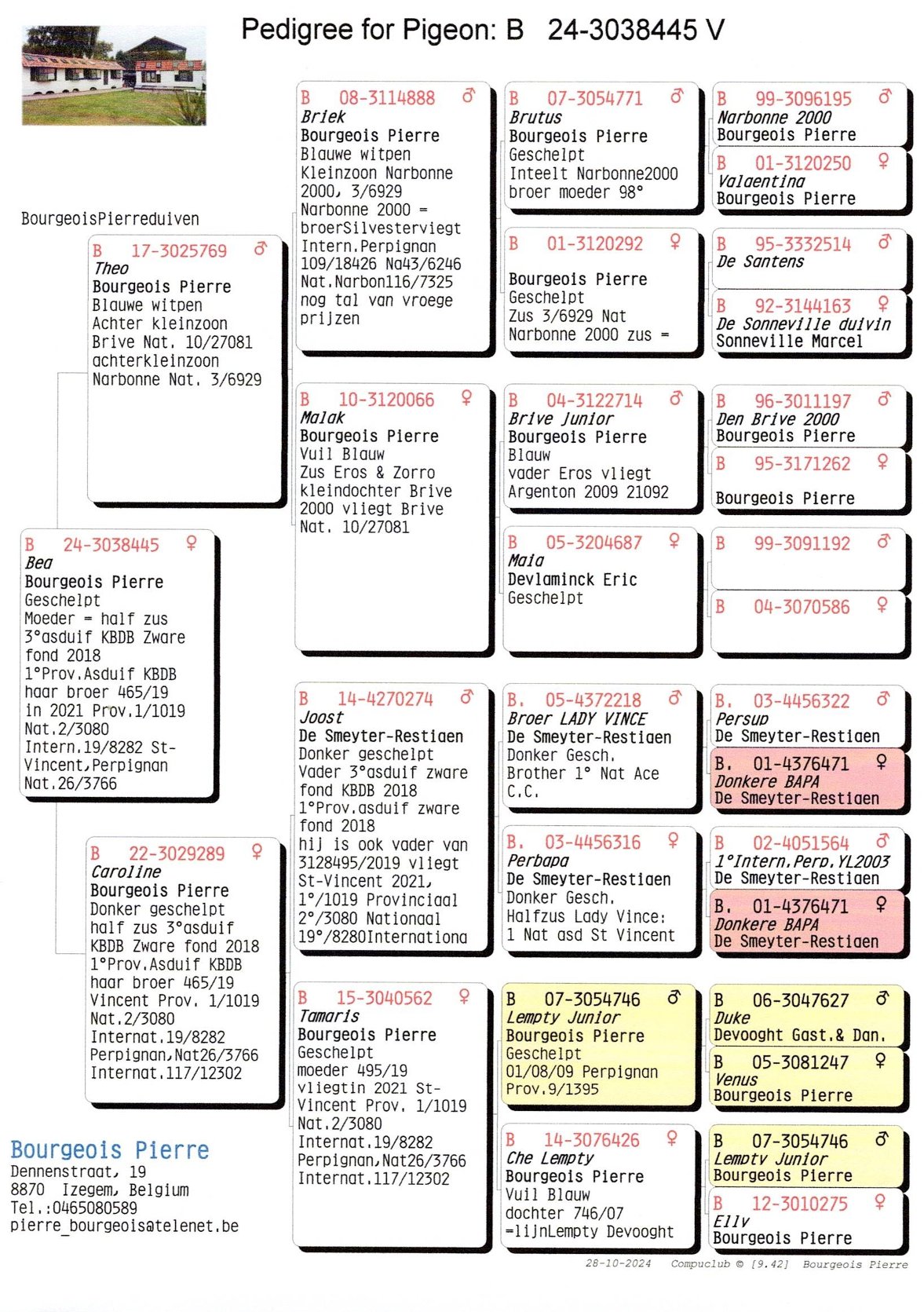 Dochter “Joost” (De Smeyter-Restiaen) Lijn 1. Internationaal Perpignan ’03, Vader van Choi” 3. Nationale Asduif , 1. Provinciale Asduif KBDB Zware Fond 2018 x “Tamaris” (moeder van “Charles” 1.Provinciaal, 2. Nationaal St-Vincent 2021) Dochter “Lempty Junior” Vloog oa 56./18390 Internationaal Perpignan x “Che Lempty”(Lempty Lijn Devooght Gast. & Danny).