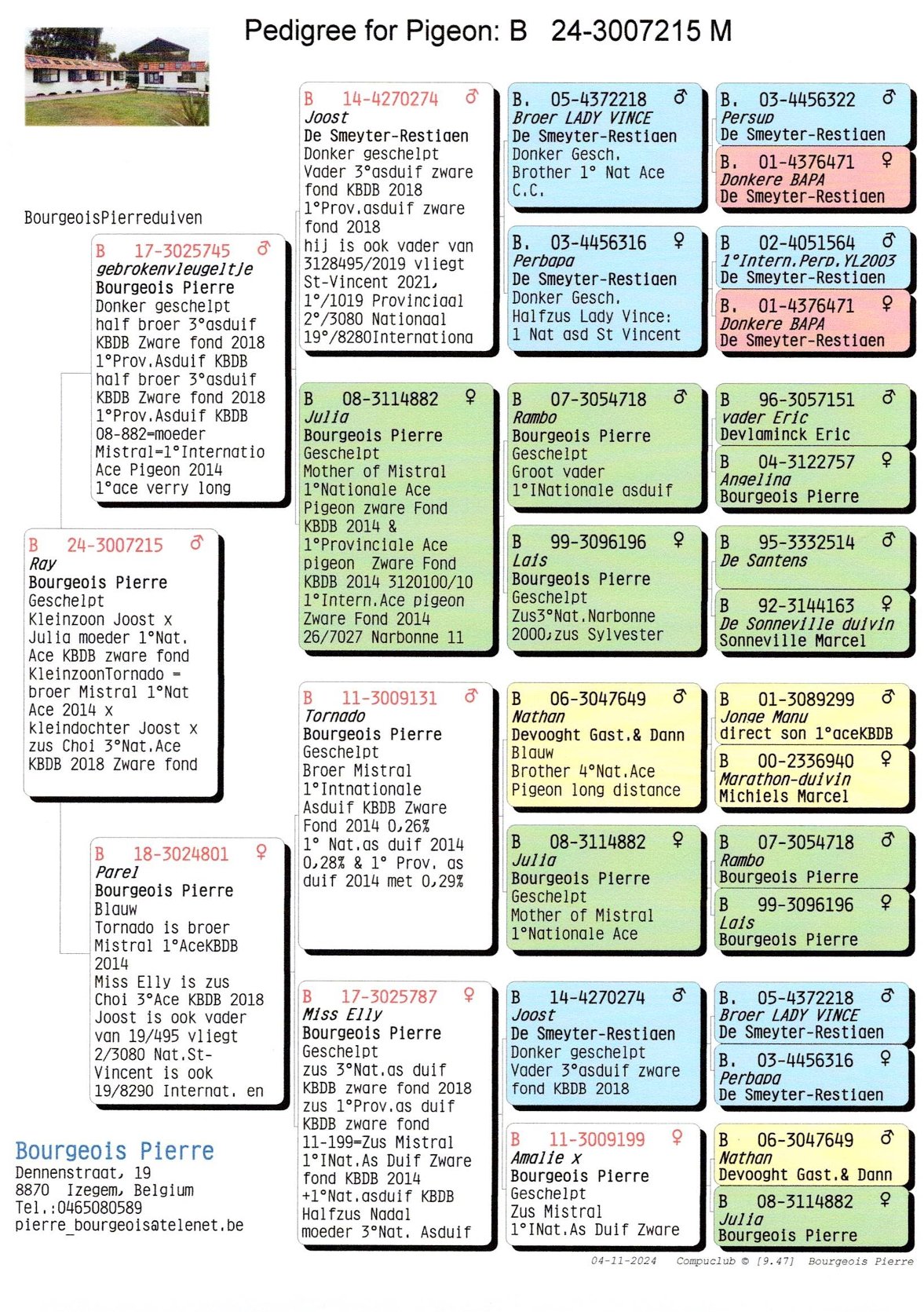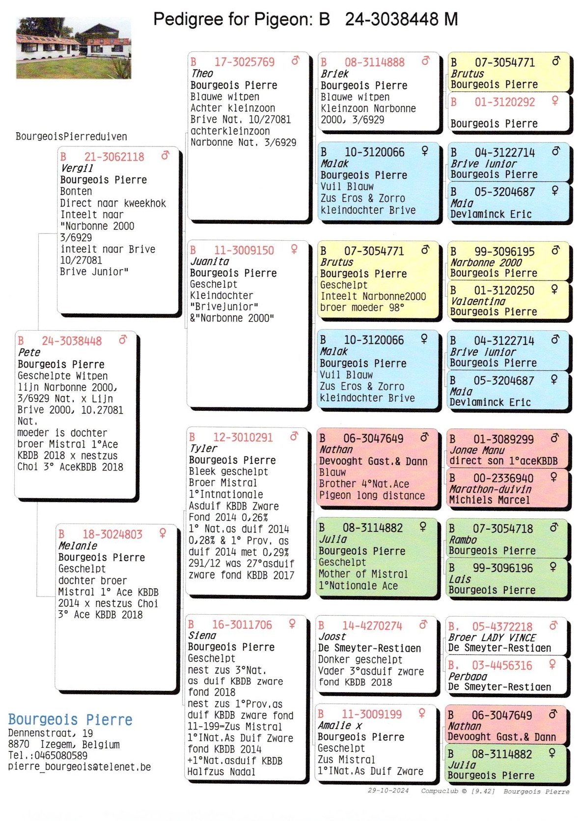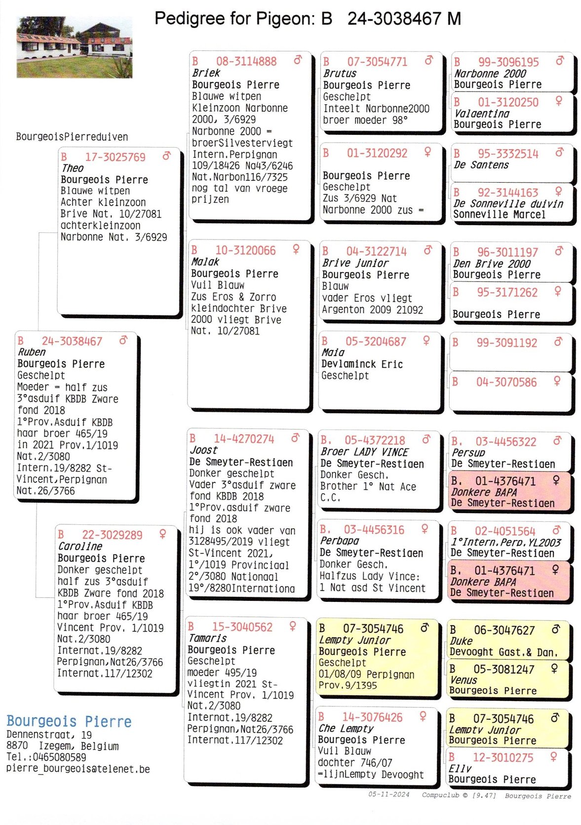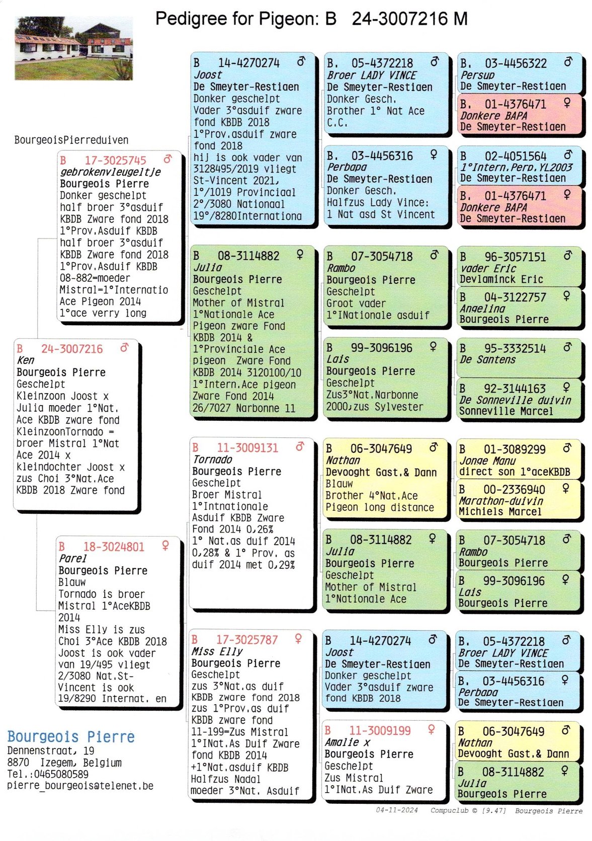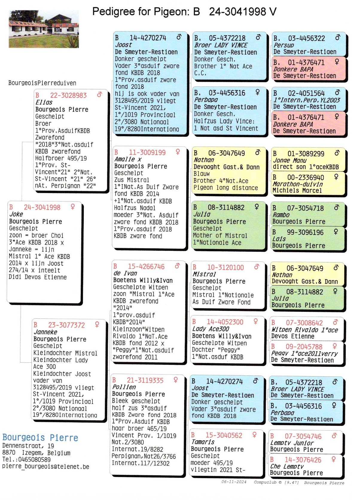 Zoon van “Joost” (De Smeyter-Restiaen) Lijn 1. Internationaal Perpignan ‘03 x “Juanita” Dochter “Brutus” ” Inteelt “Narbonne 2000” 3./6929 Nationaal Narbonne (Santens x Sonneville) x “Malak” Dochter van “Brive Junior” Vader van oa 94./8651 Nationaal Cahors (Deseyn-Vandemeulebroeke x Sonneville) x “Maia” (Devlaminck Erik)