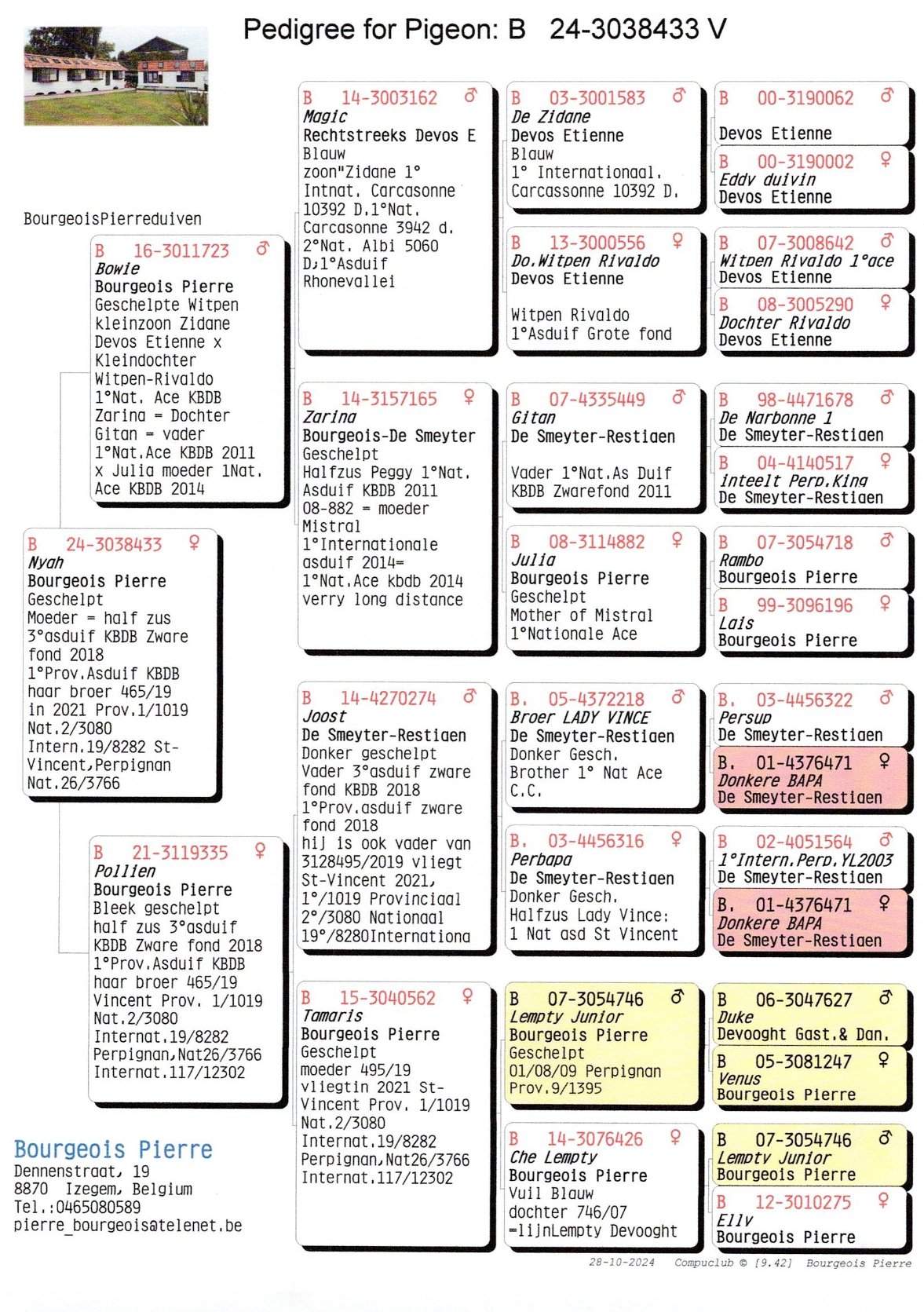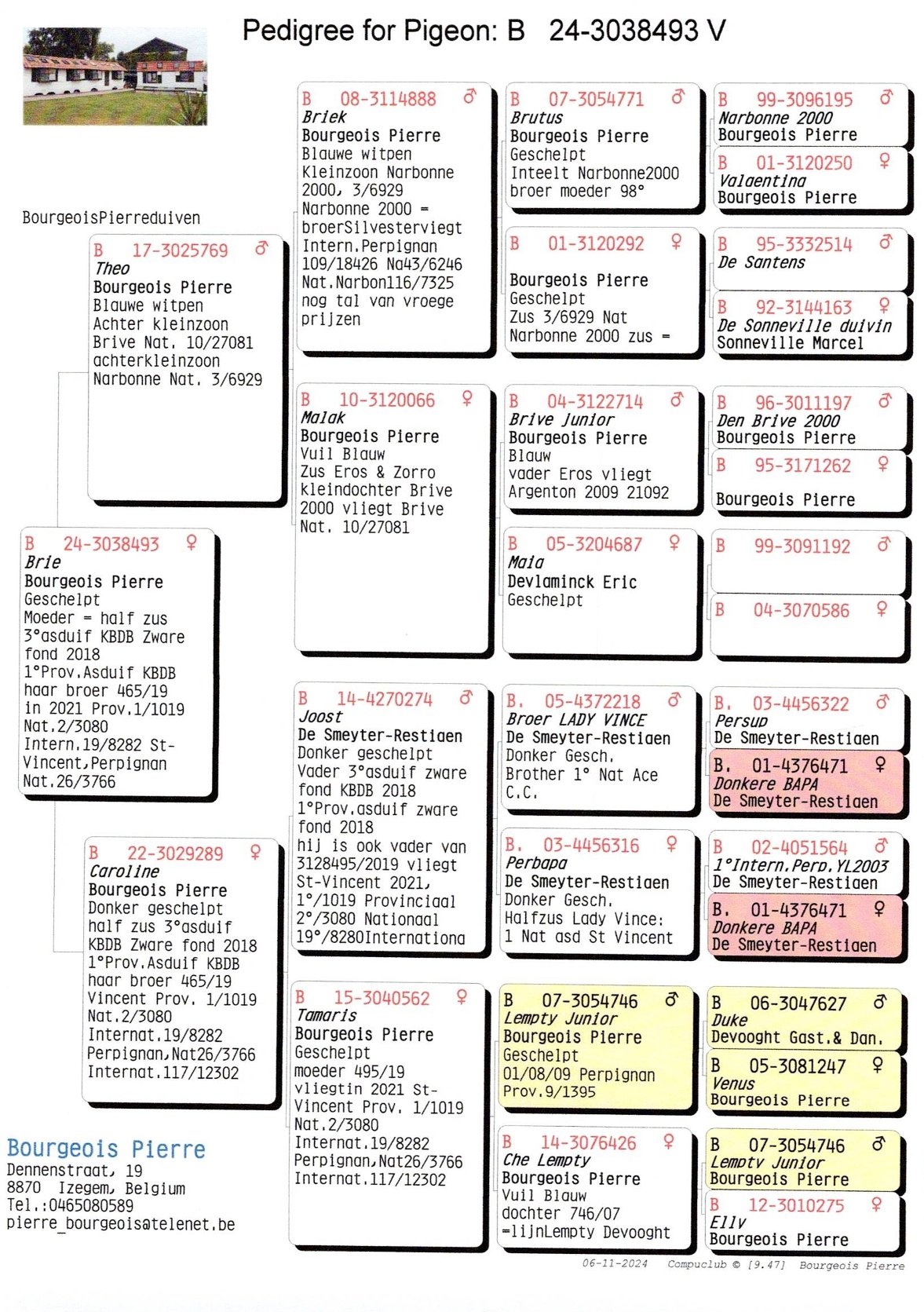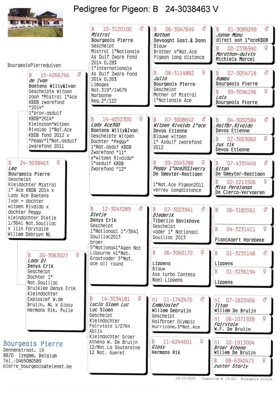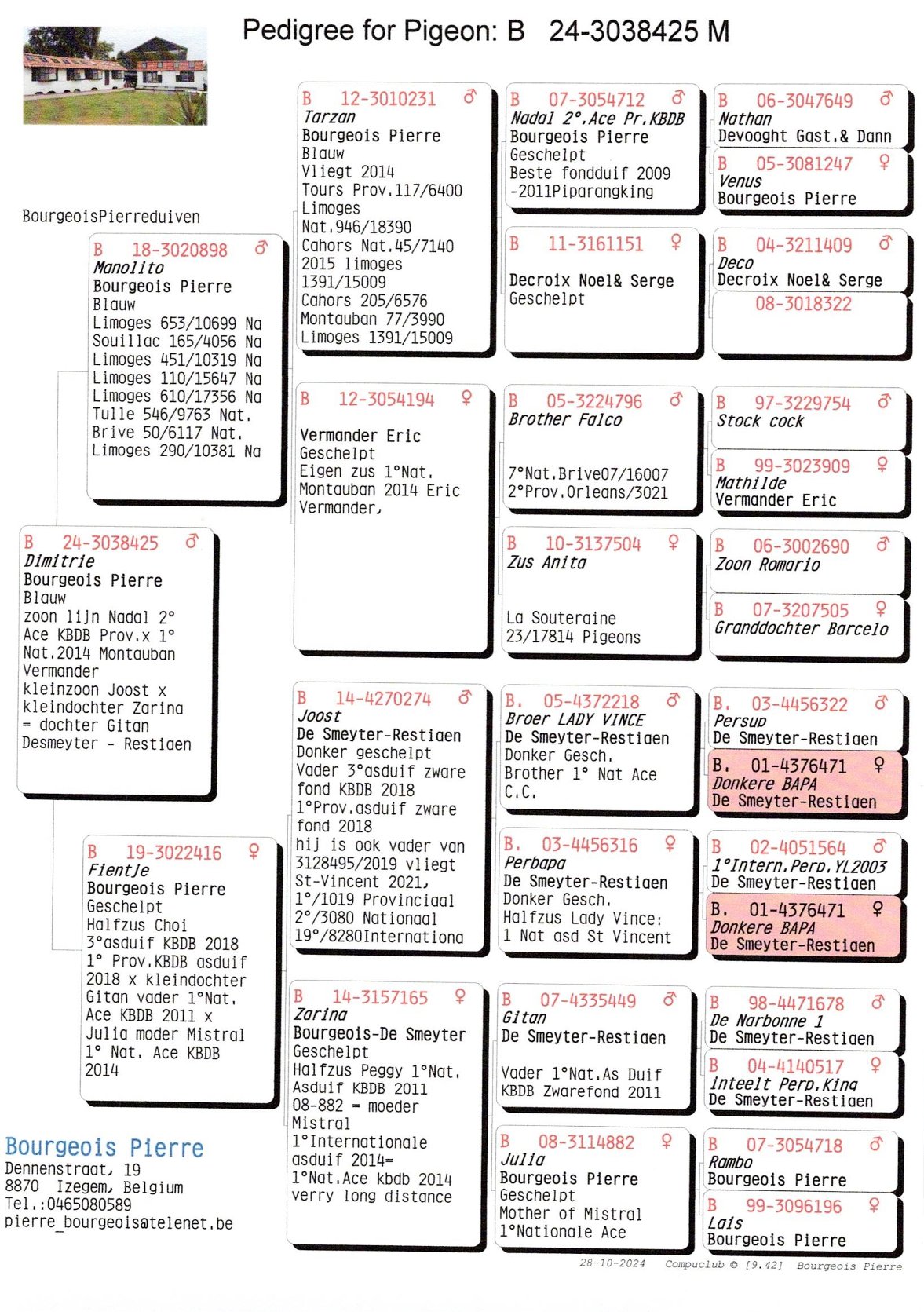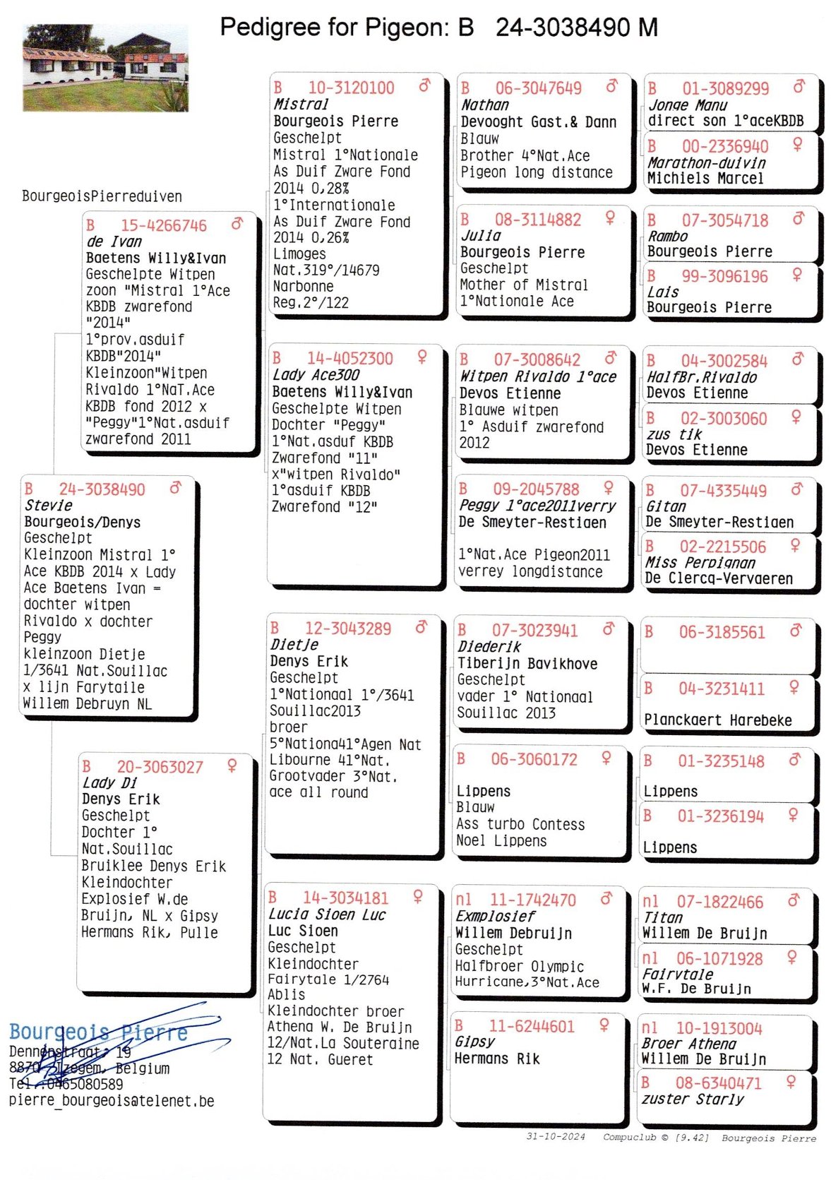 Dochter“Manolito” 50./6117 Nationaal Brive, Zoon van “Tarzan” Vloog 45./7140 Nationaal Cahors, 77./3990 Montauban x “Ronia” Kleindochter “Mistral” ” 1. Internationale Asduif, 1. Nationale Asduif KBDB Zware Fond