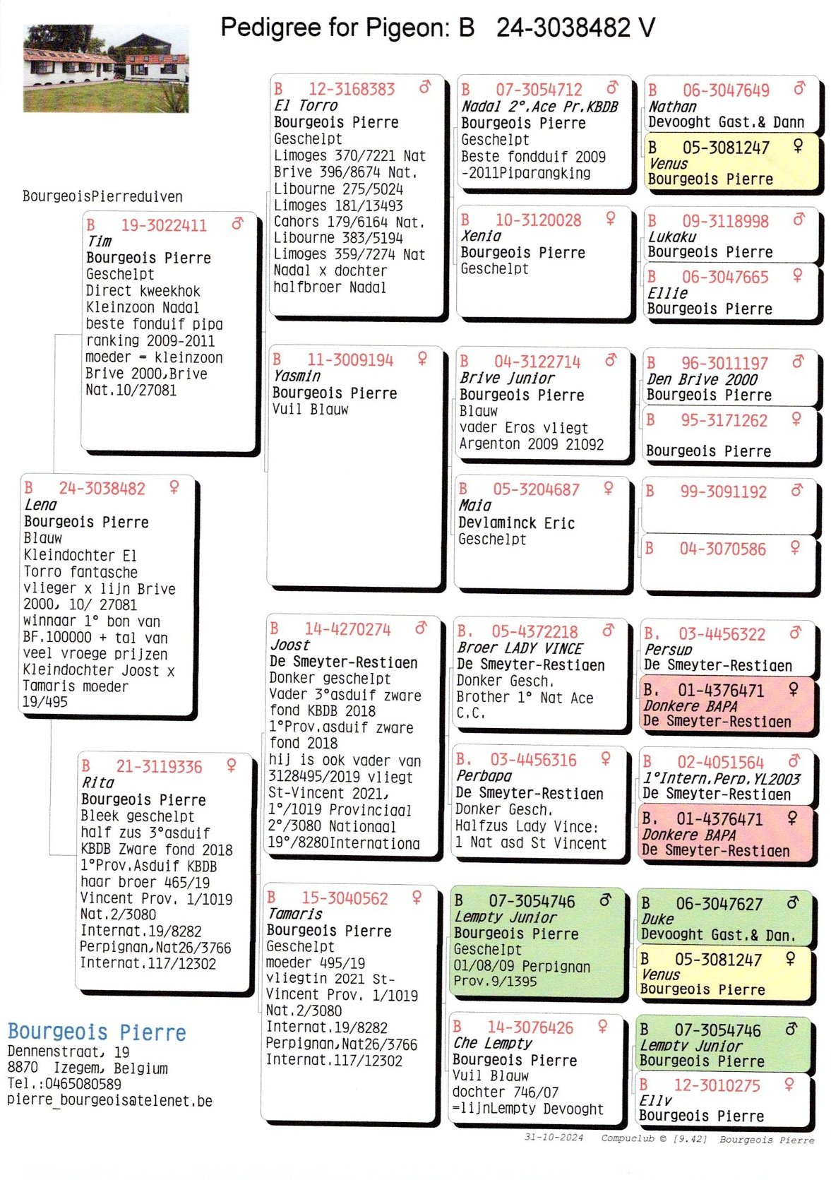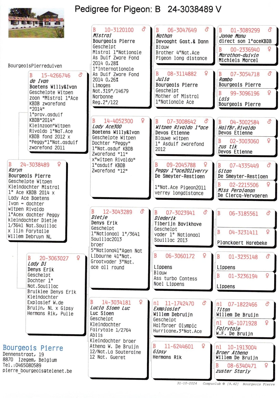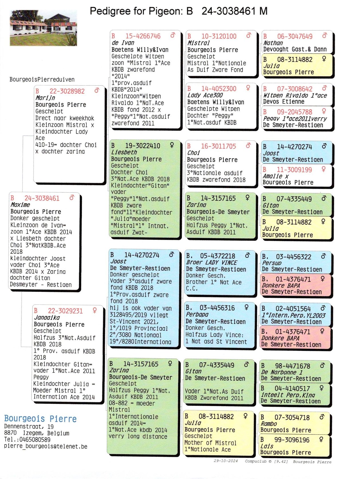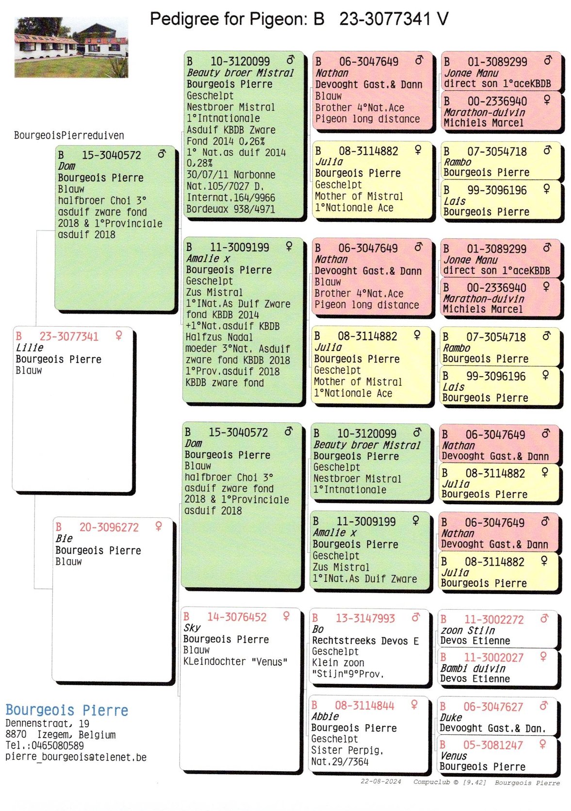 Dochter“Manolito” 50./6117 Nationaal Brive, Zoon van “Tarzan” Vloog 45./7140 Nationaal Cahors, 77./3990 Montauban x “Ronia” Kleindochter “Mistral” ” 1. Internationale Asduif, 1. Nationale Asduif KBDB Zware Fond