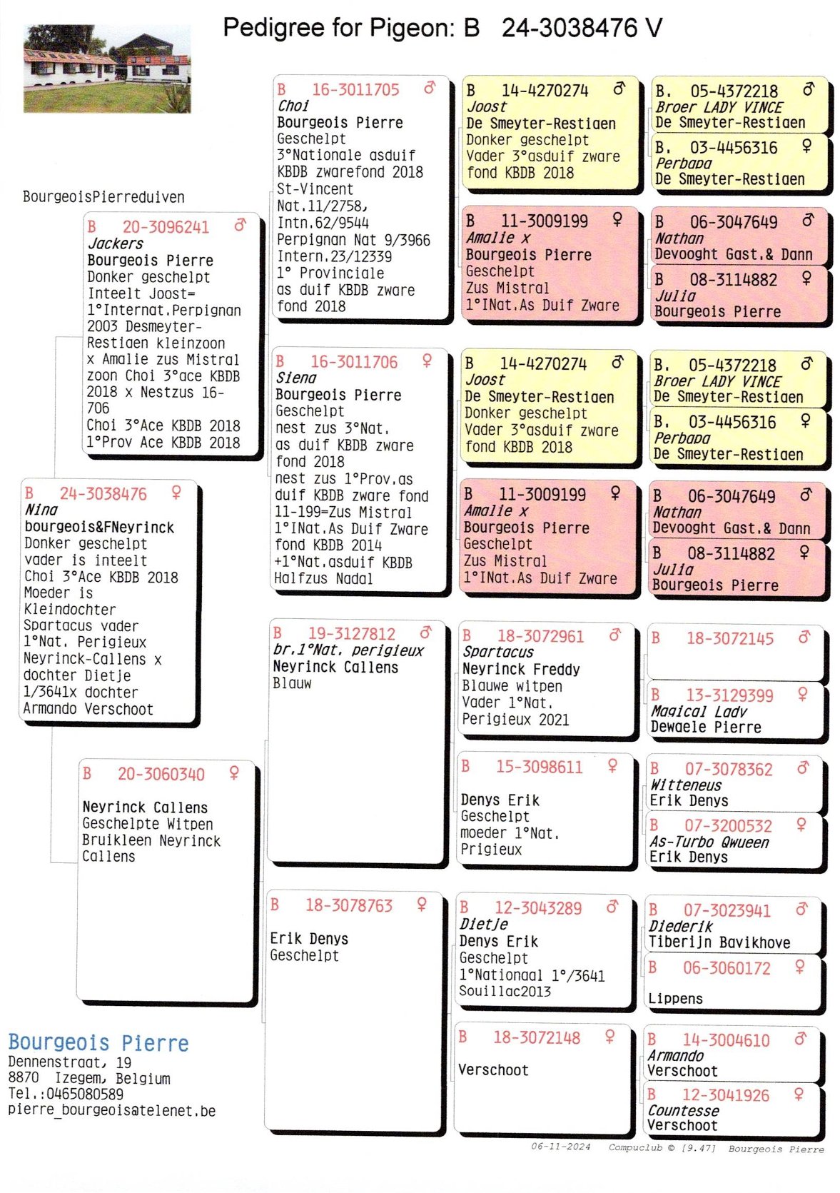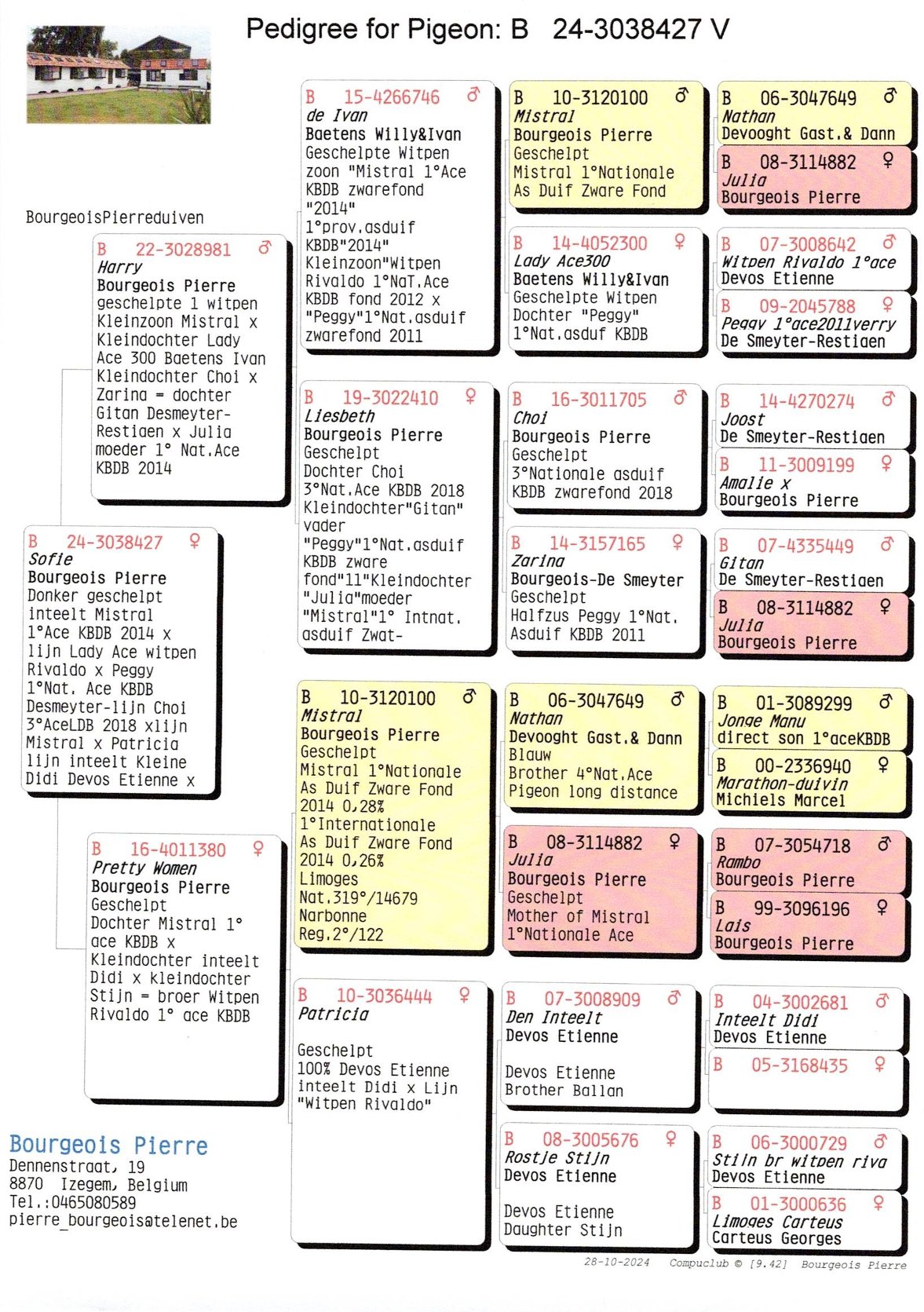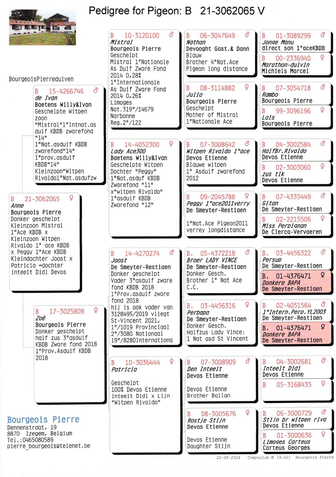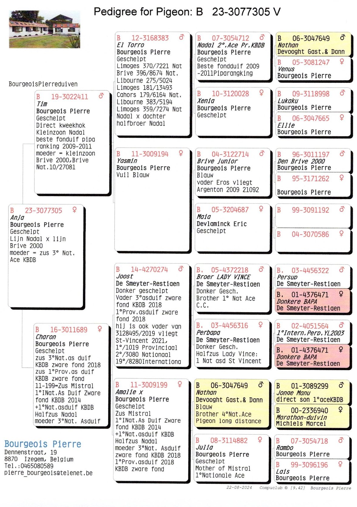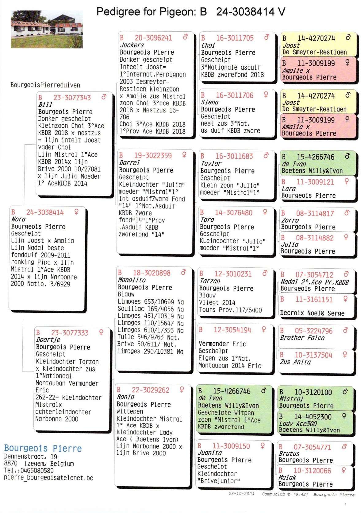 Dochter“Manolito” 50./6117 Nationaal Brive, Zoon van “Tarzan” Vloog 45./7140 Nationaal Cahors, 77./3990 Montauban x “Ronia” Kleindochter “Mistral” ” 1. Internationale Asduif, 1. Nationale Asduif KBDB Zware Fond