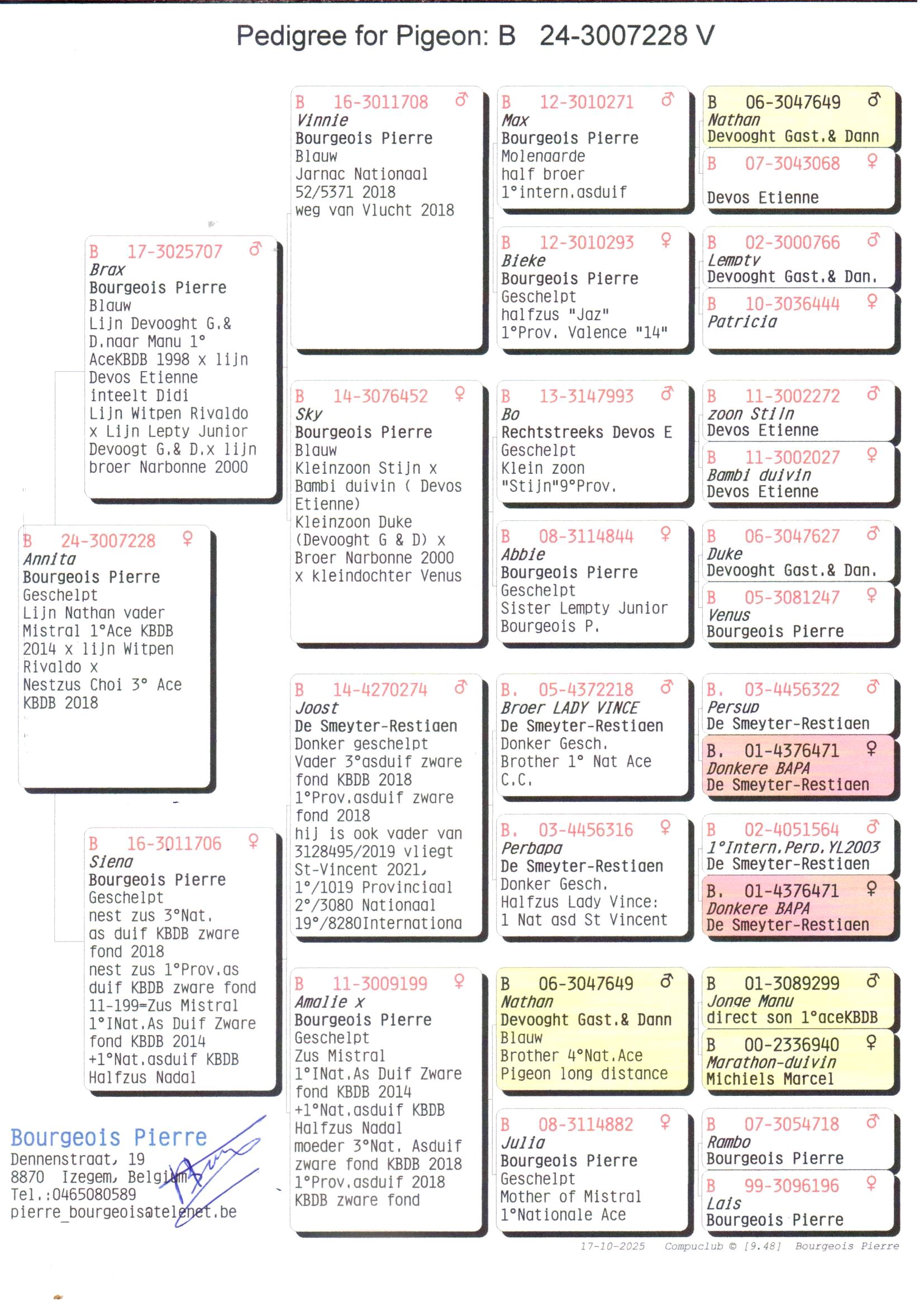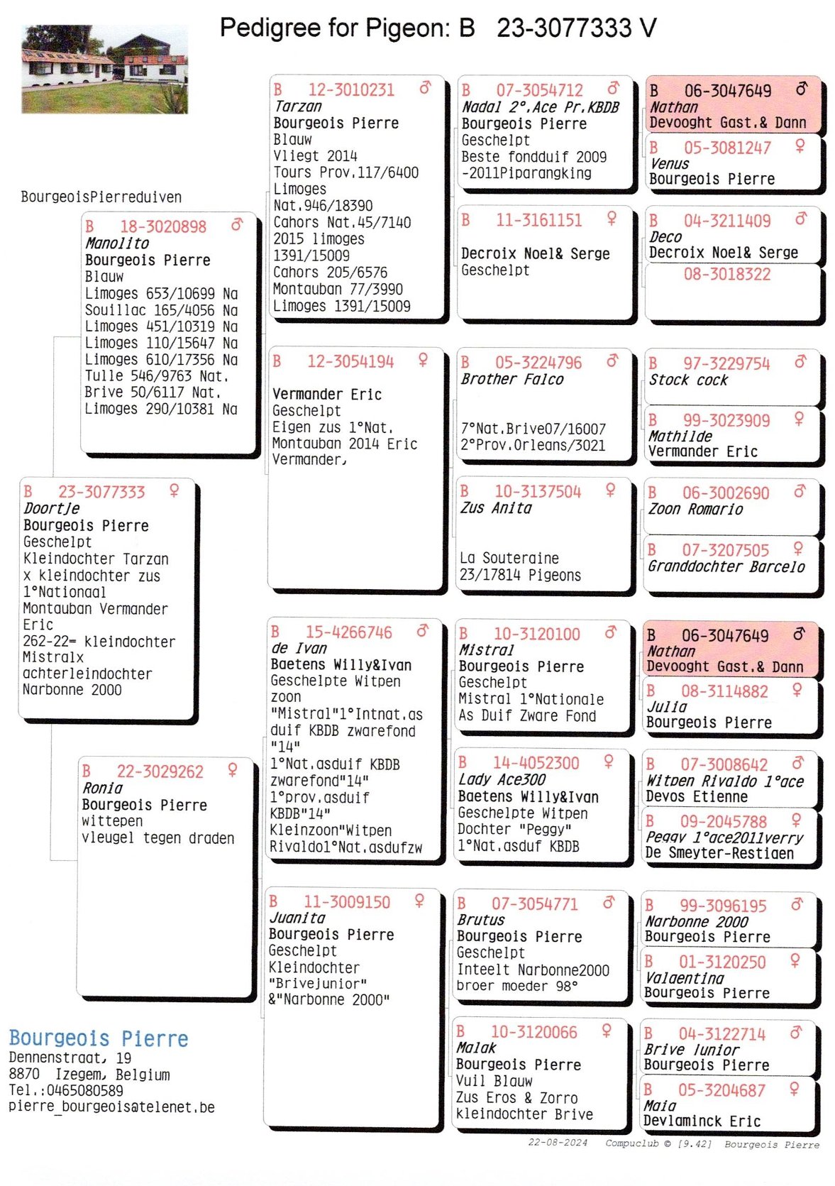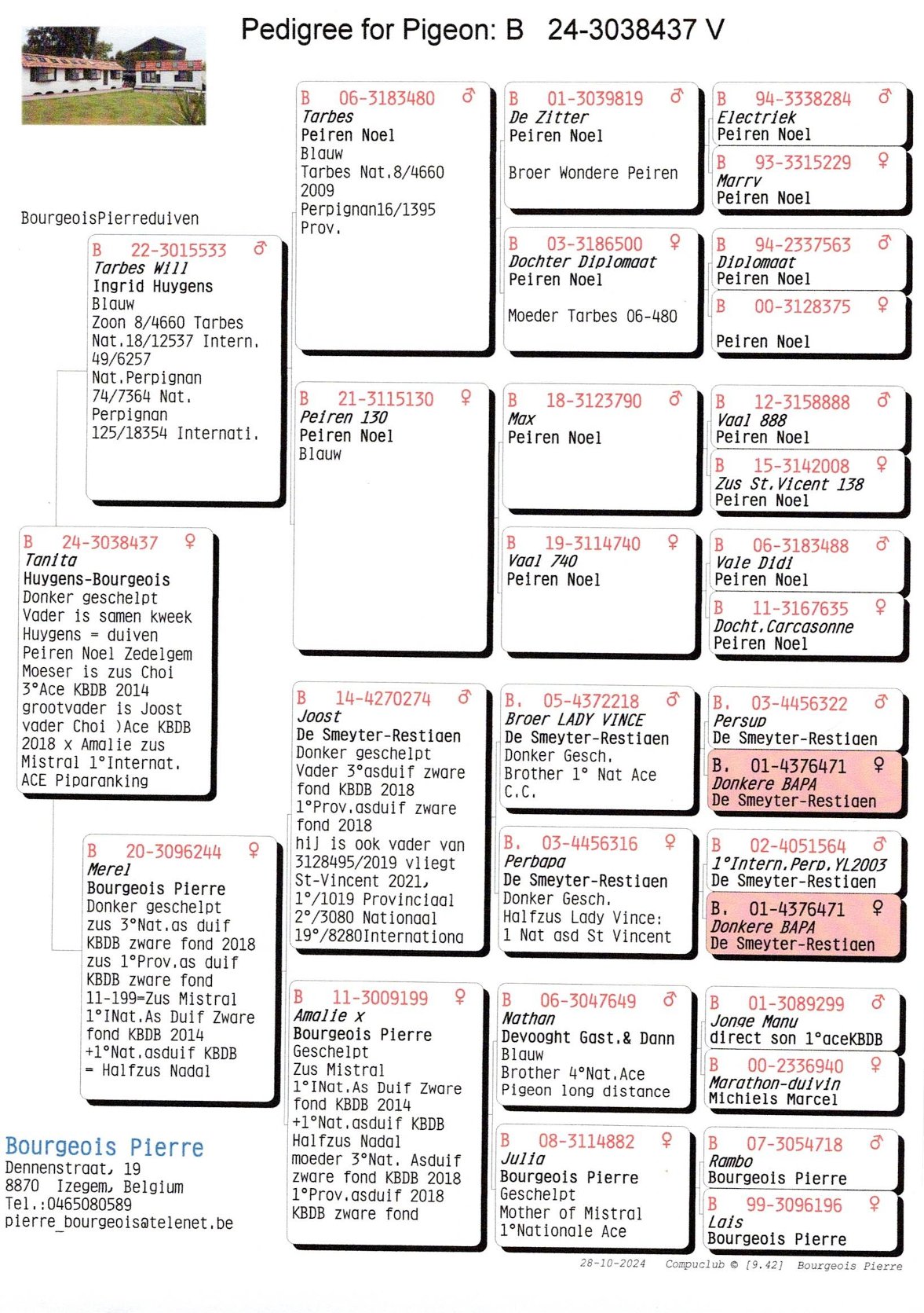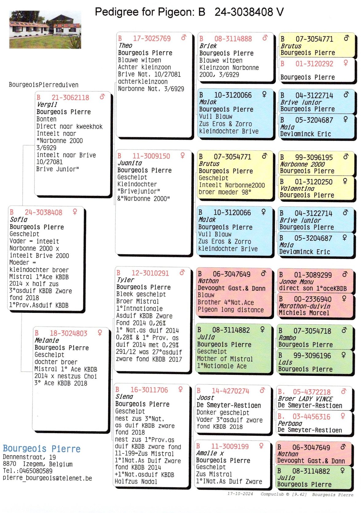 Dochter“Manolito” 50./6117 Nationaal Brive, Zoon van “Tarzan” Vloog 45./7140 Nationaal Cahors, 77./3990 Montauban x “Ronia” Kleindochter “Mistral” ” 1. Internationale Asduif, 1. Nationale Asduif KBDB Zware Fond
