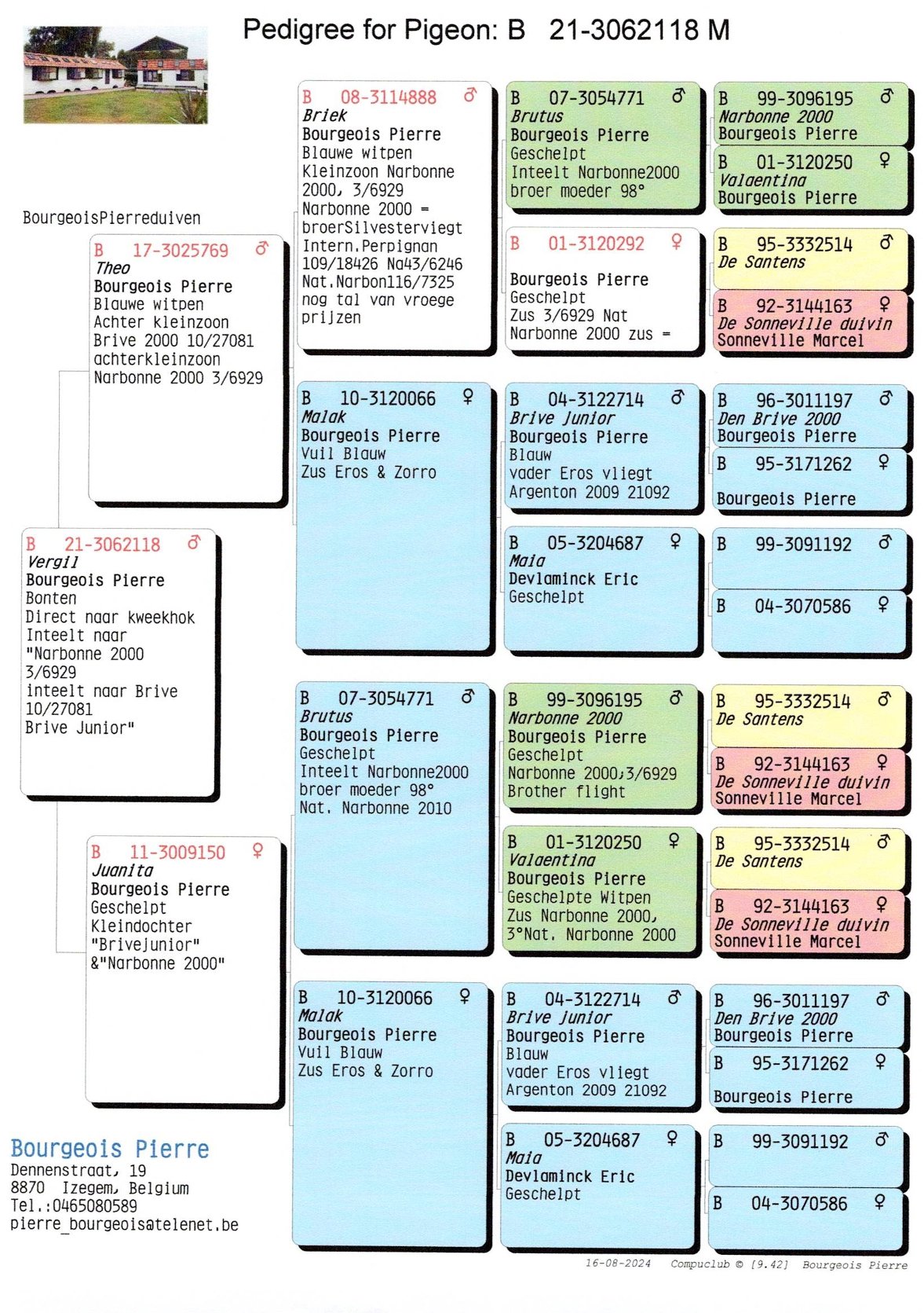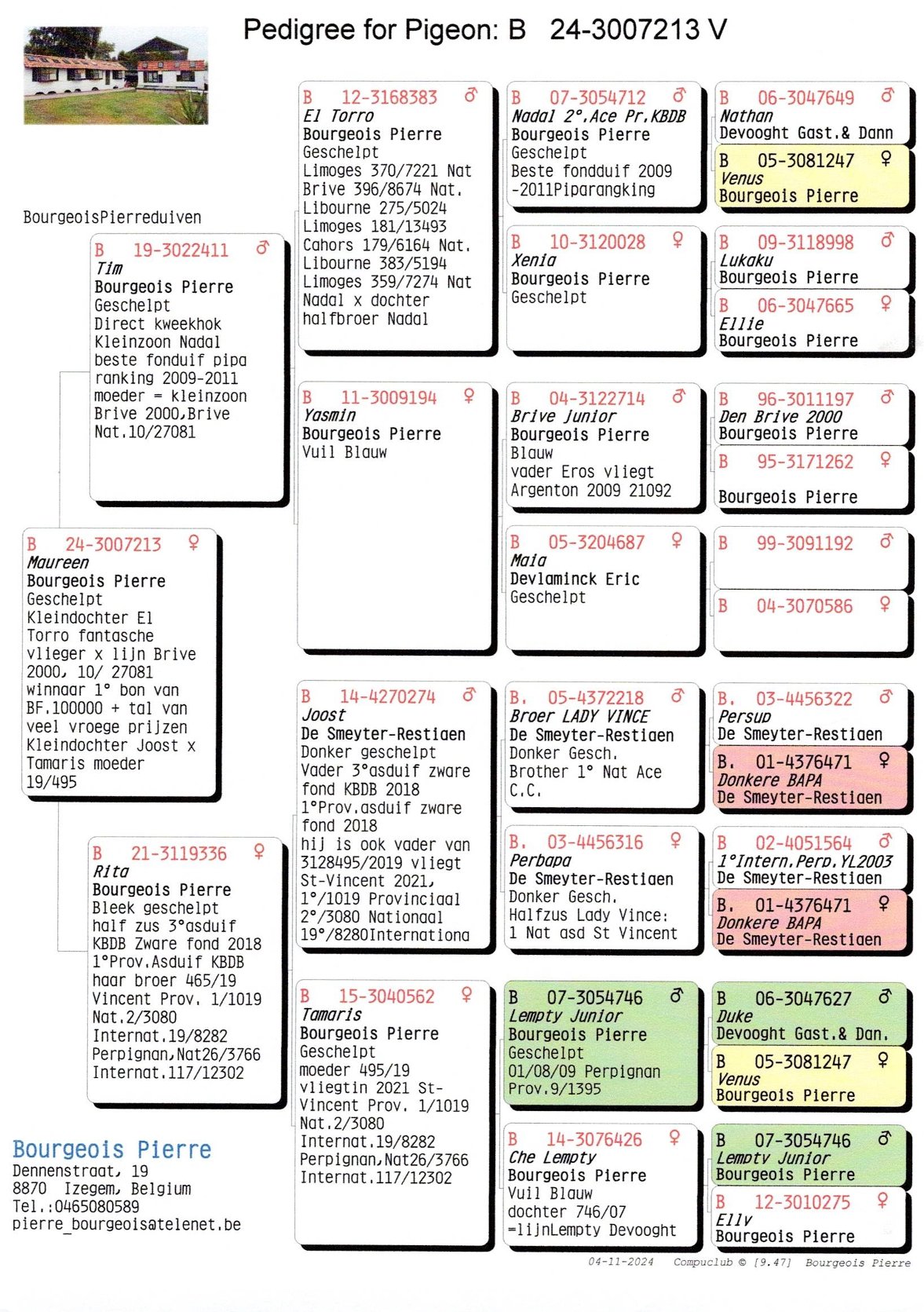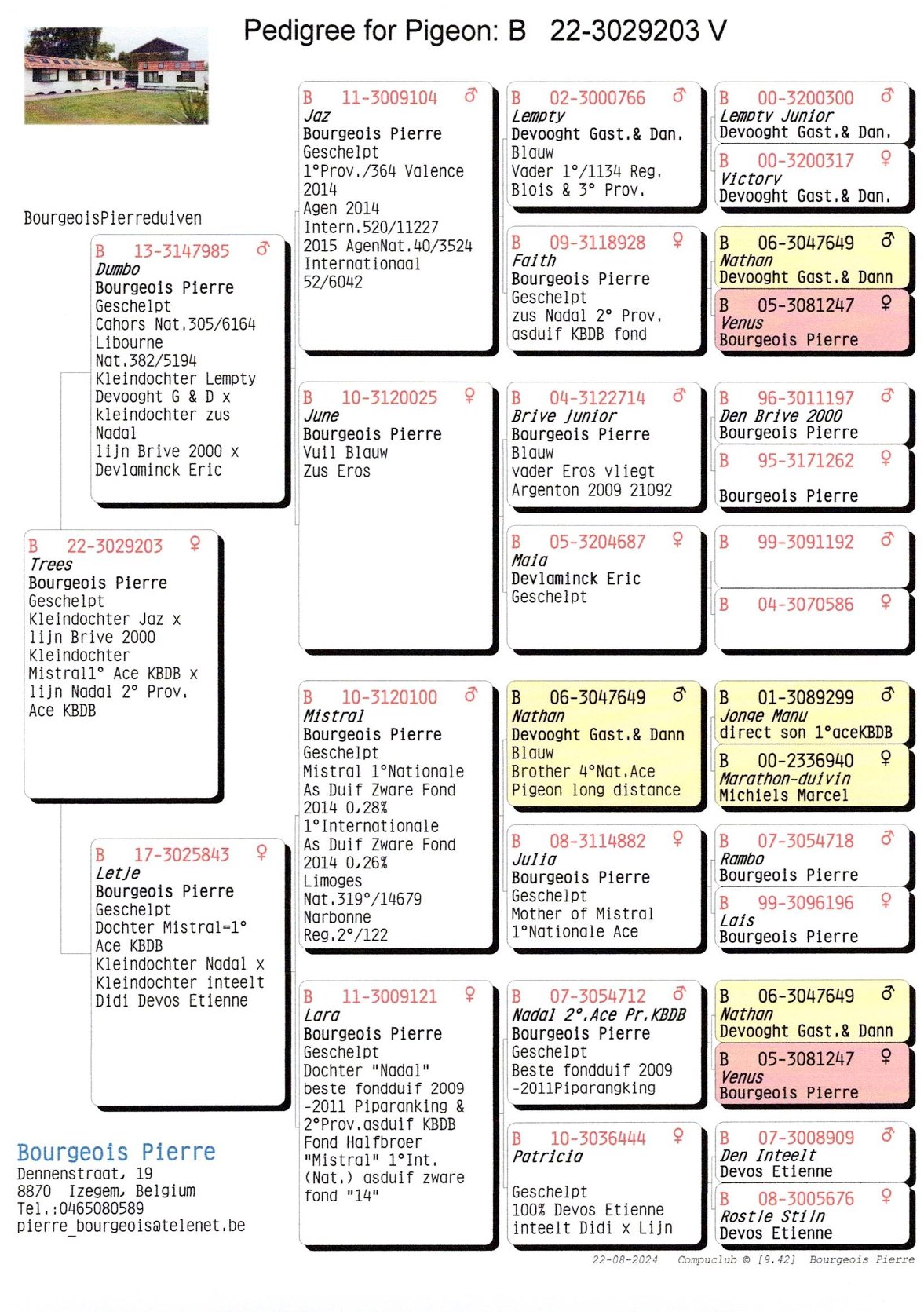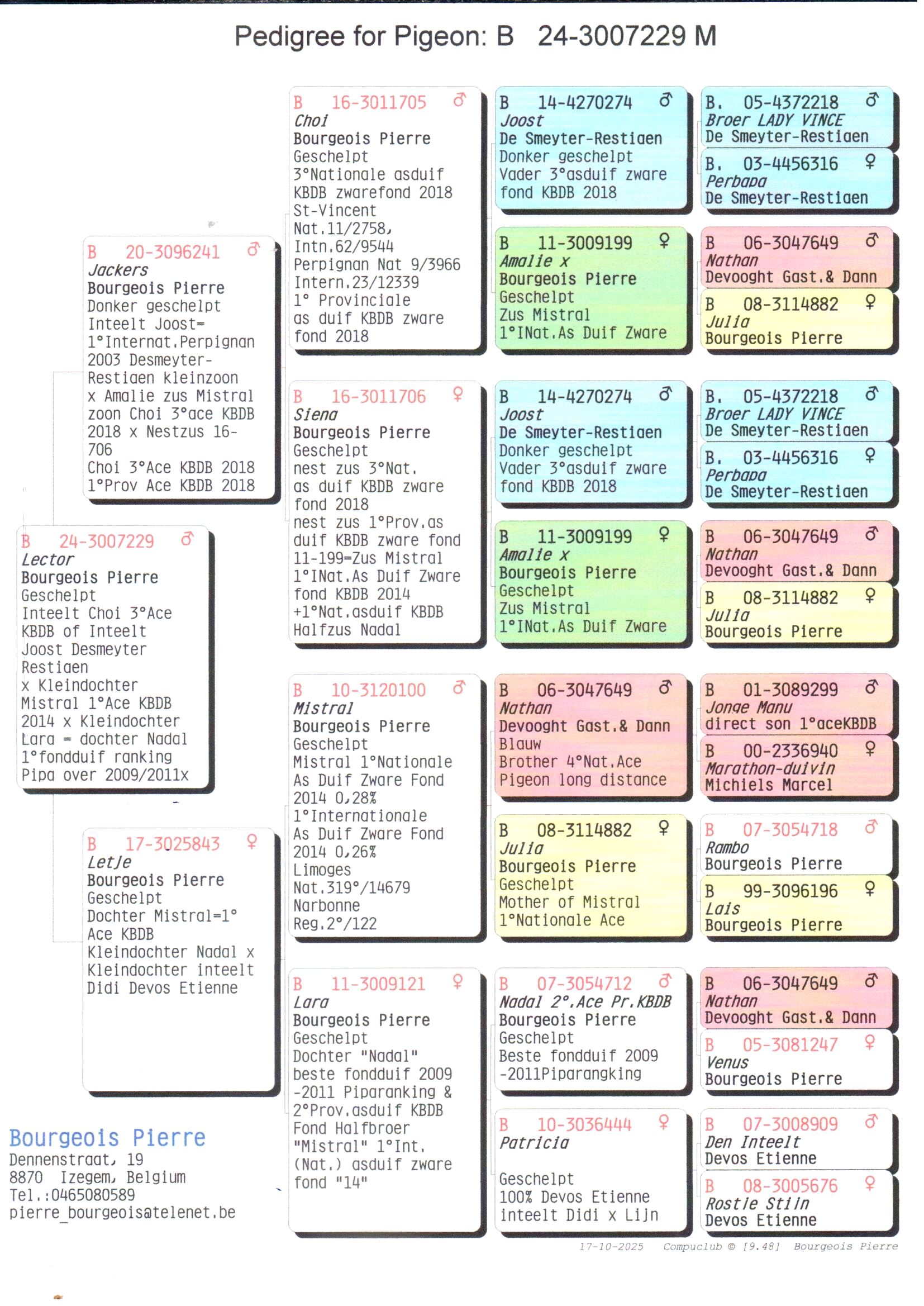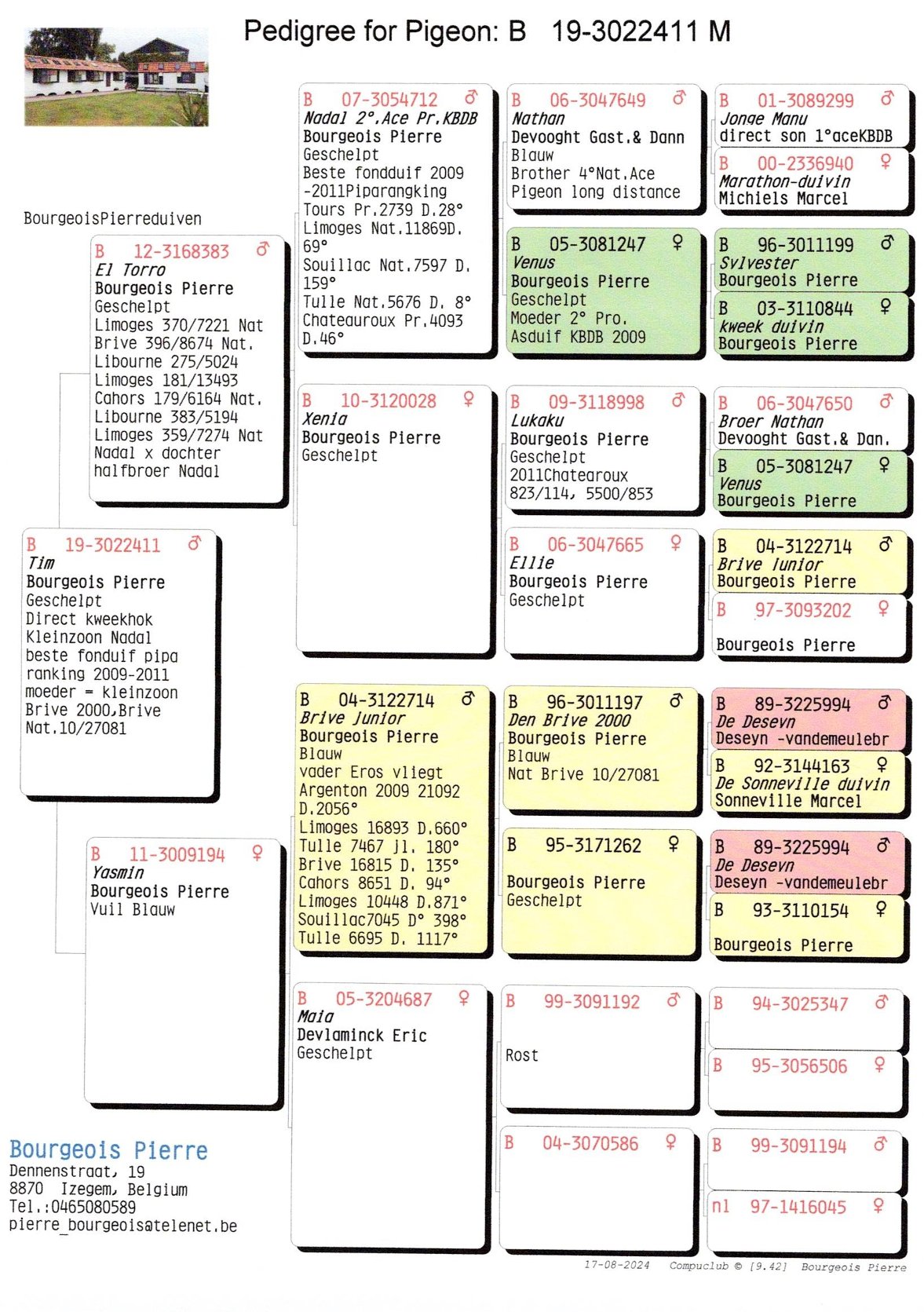 Dochter“Manolito” 50./6117 Nationaal Brive, Zoon van “Tarzan” Vloog 45./7140 Nationaal Cahors, 77./3990 Montauban x “Ronia” Kleindochter “Mistral” ” 1. Internationale Asduif, 1. Nationale Asduif KBDB Zware Fond