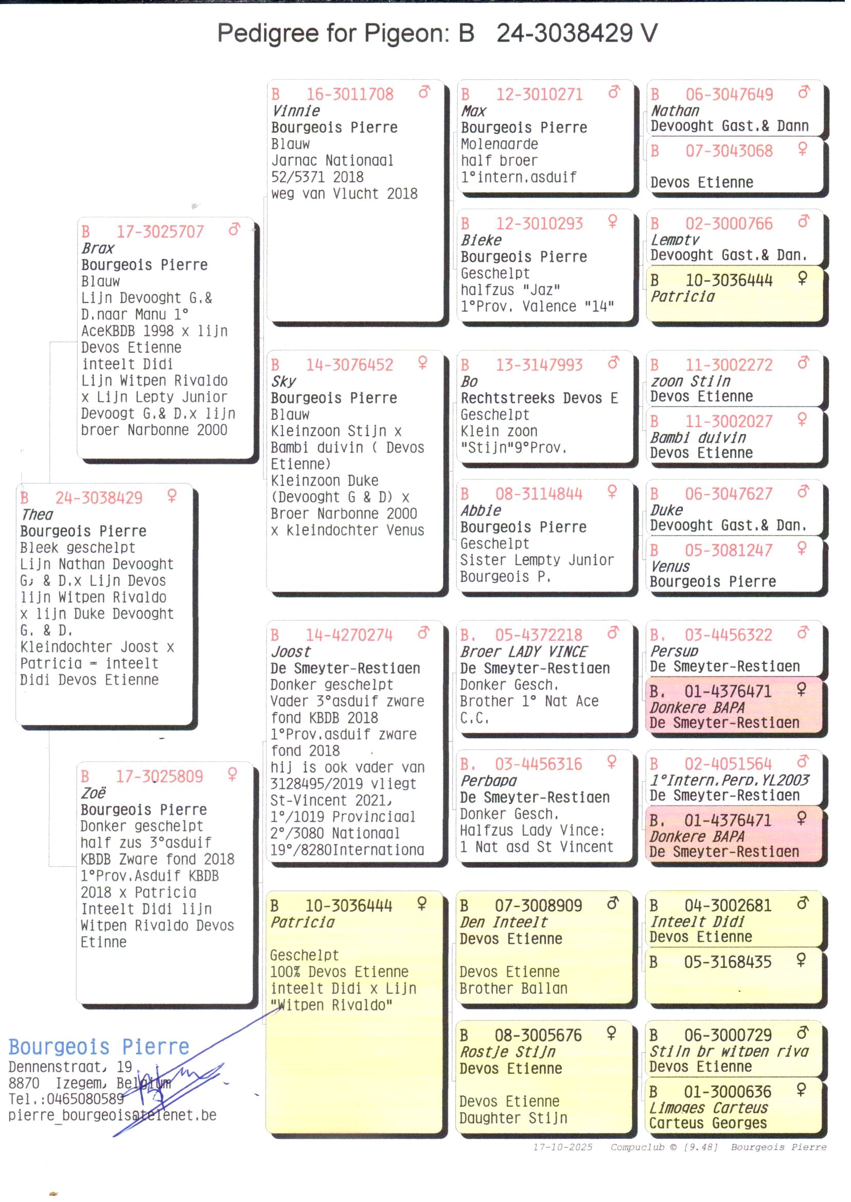 Dochter “Charles” 1./1019 Provinciaal, 2./3080 Nationaal St-Vincent, Halfbroer “Choi” 3. Nationale Asduif KBDB Zware Fond 2018 x “Bie” Dochter “Dom” Halfbroer Choi” 3. Nationale Asduif KBDB Zware Fond 2018 x “Sky” Lijn Bambi Duivin, Stijn (Devos Etienne)