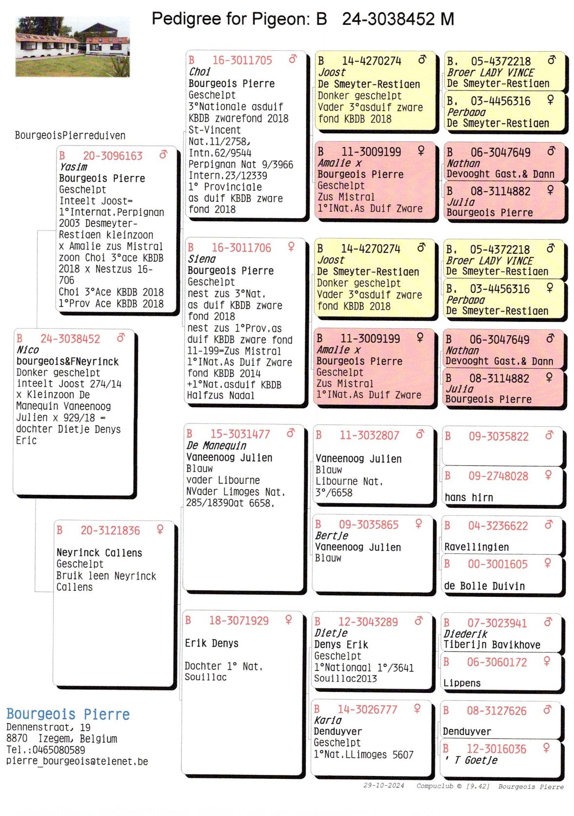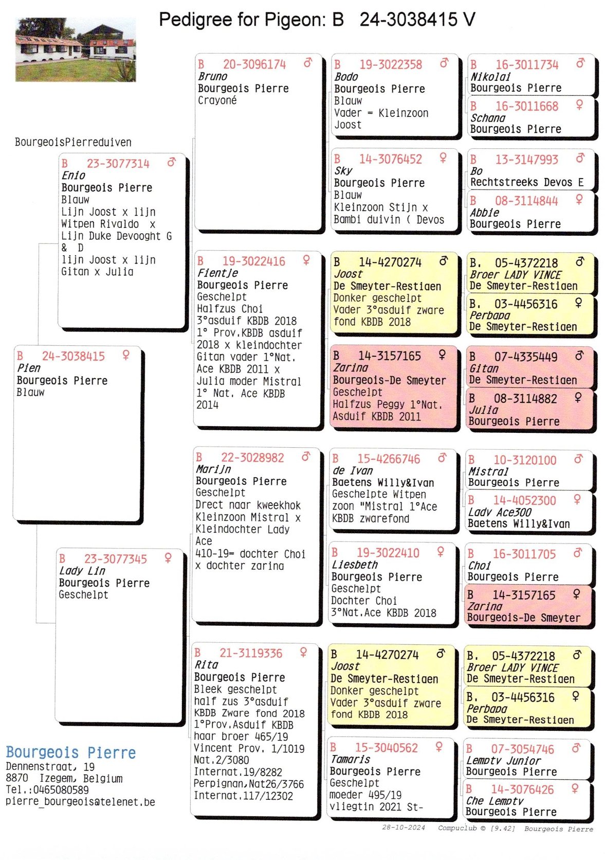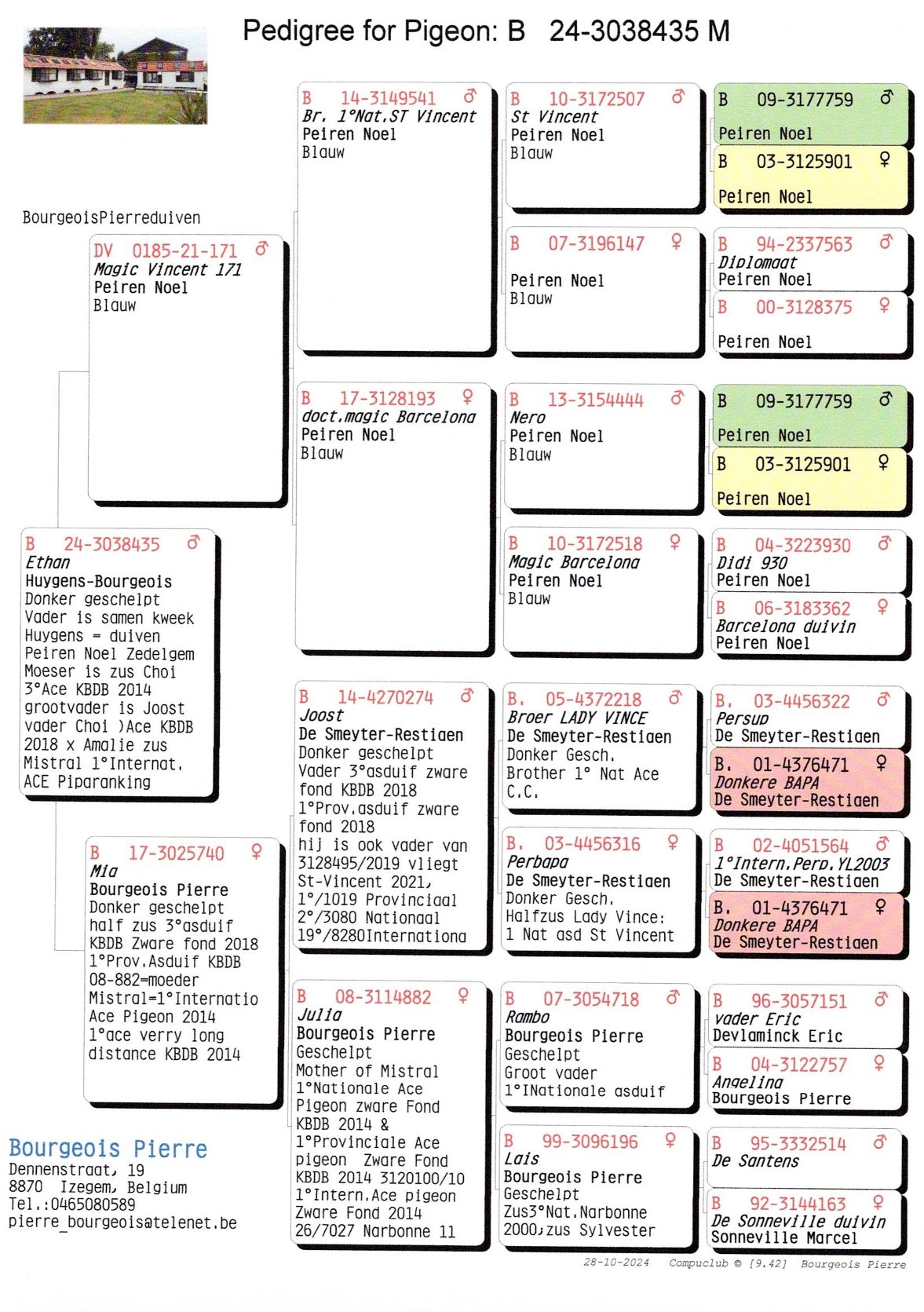 Zoon van “541/14” (Peiren Noel) Broer 1. Nationaal St-Vincent x “193/17” (Peiren Noel) Dochter “Magic Barcelona”