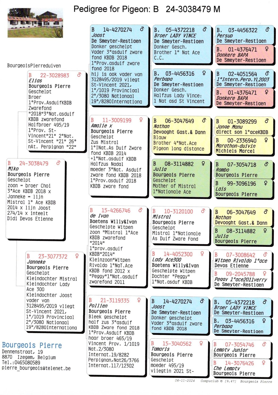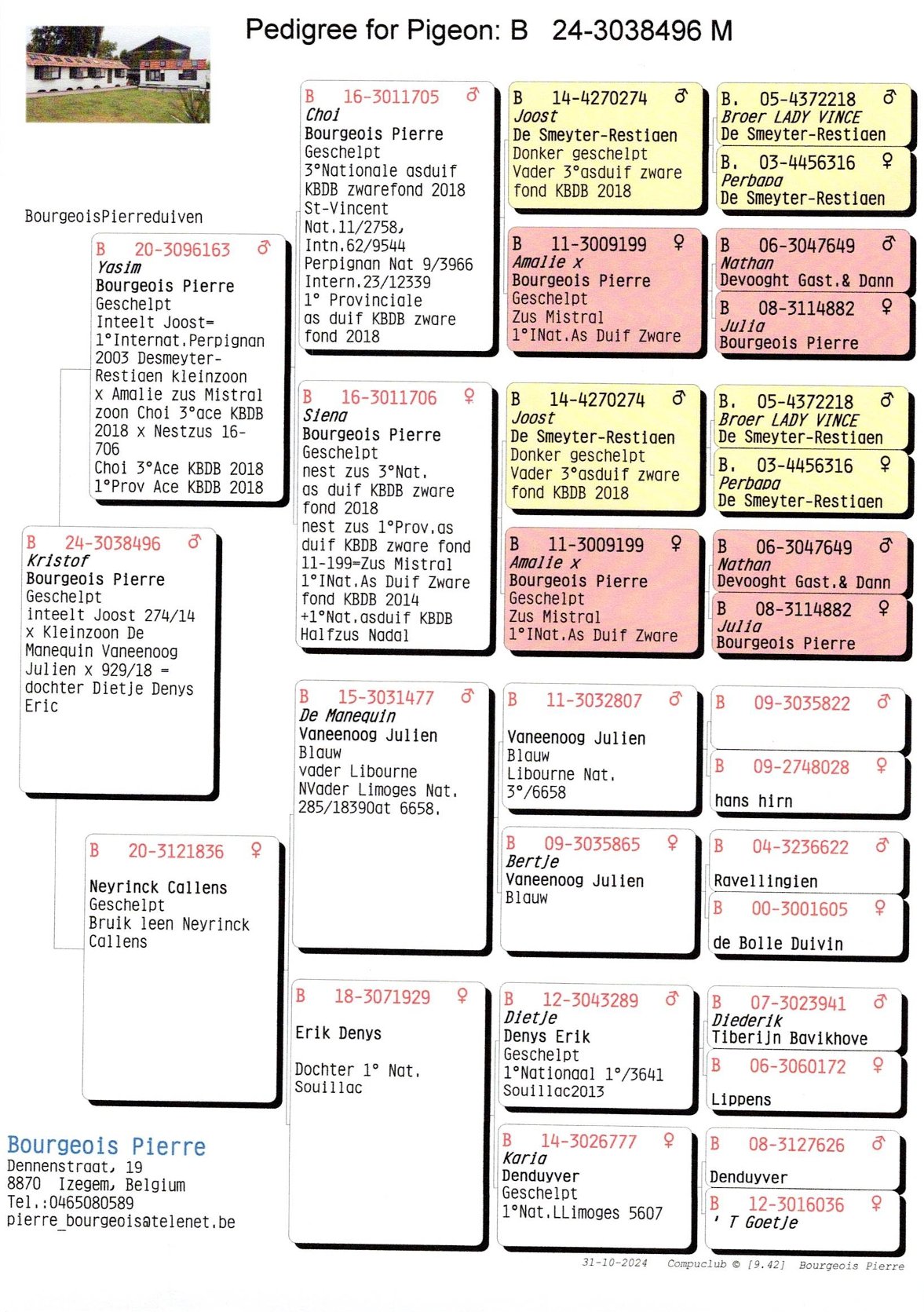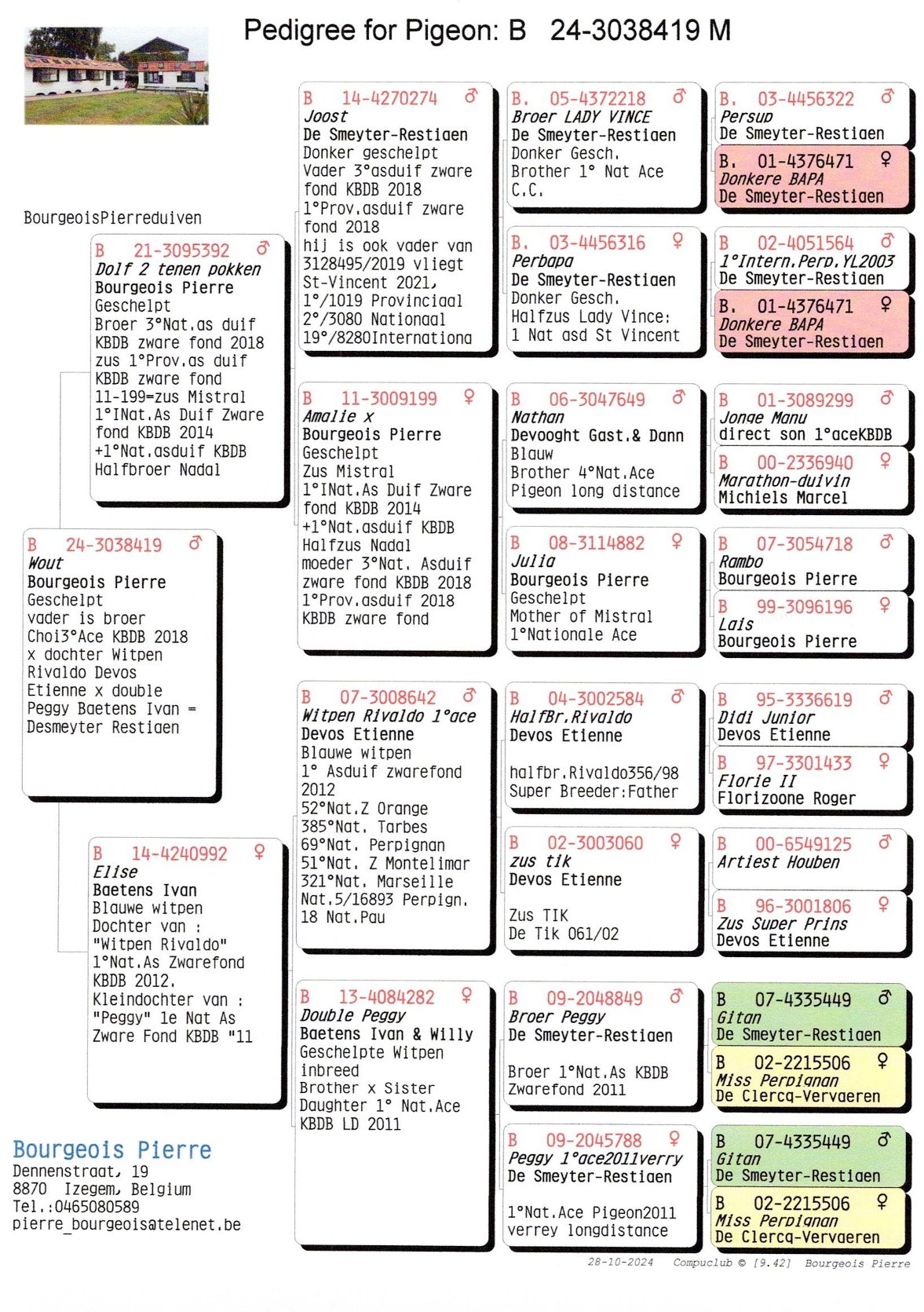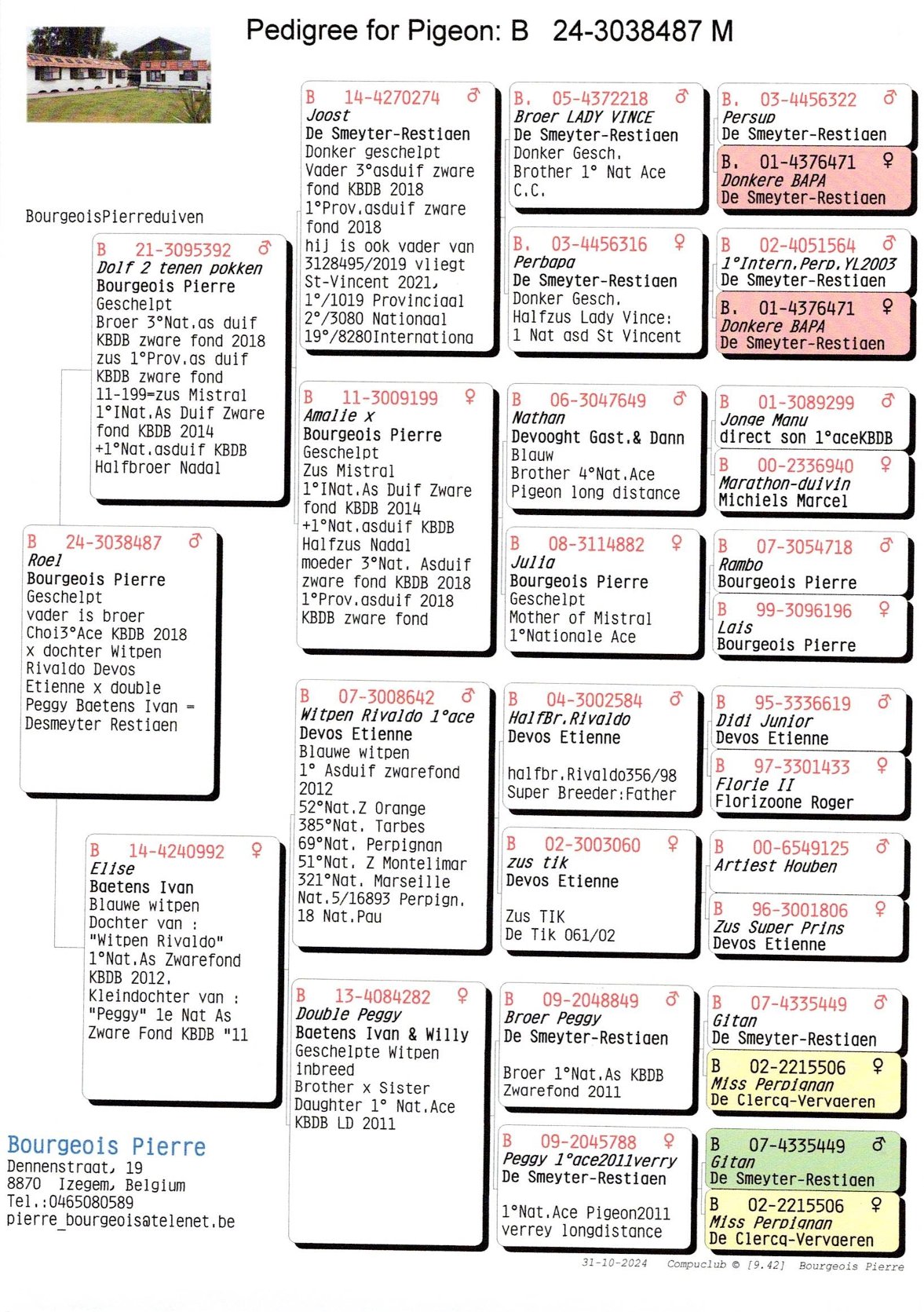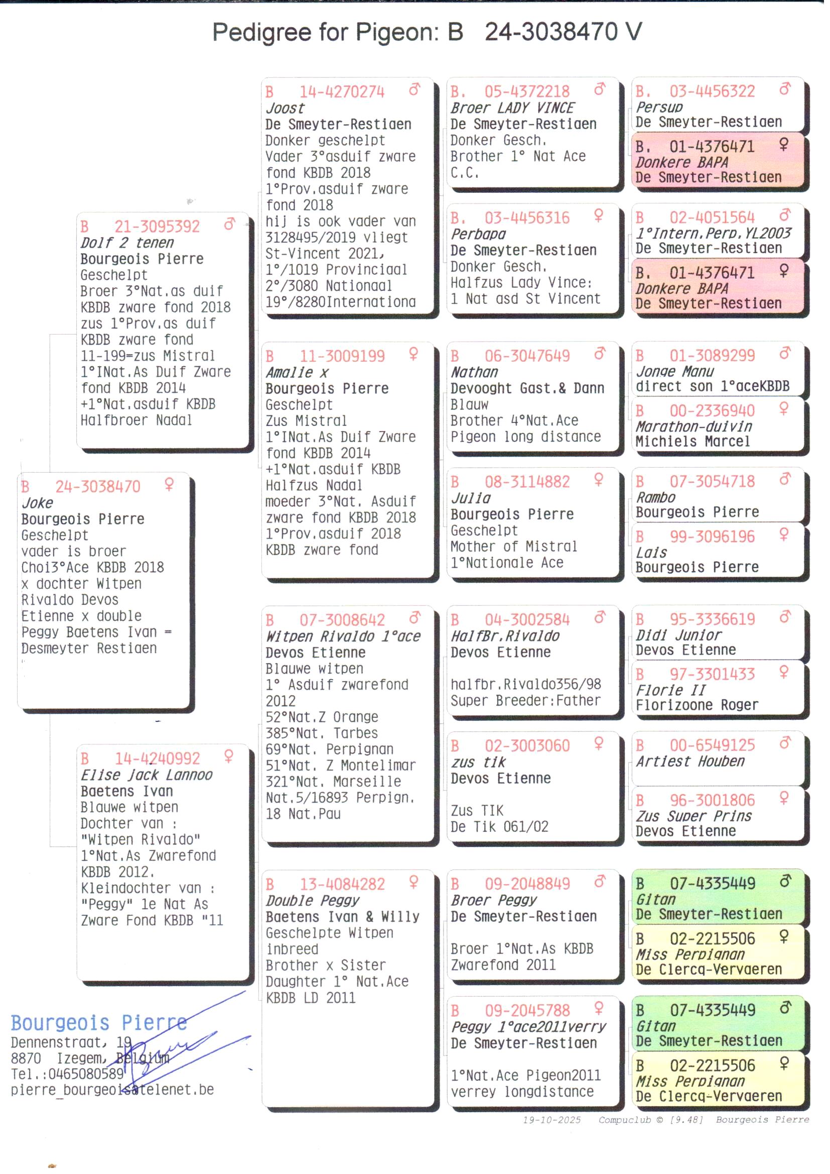Zoon van “Joost” (De Smeyter-Restiaen) Lijn 1. Internationaal Perpignan ‘03 x “Amalie” Zus “Mistal” 1. Internationale Asduif, 1. Nationale Asduif KBDB Zware Fond. Ouders van” Choi” 3. Nationale Asduif , 1. Provinciale Asduif KBDB Zware Fond 2018.