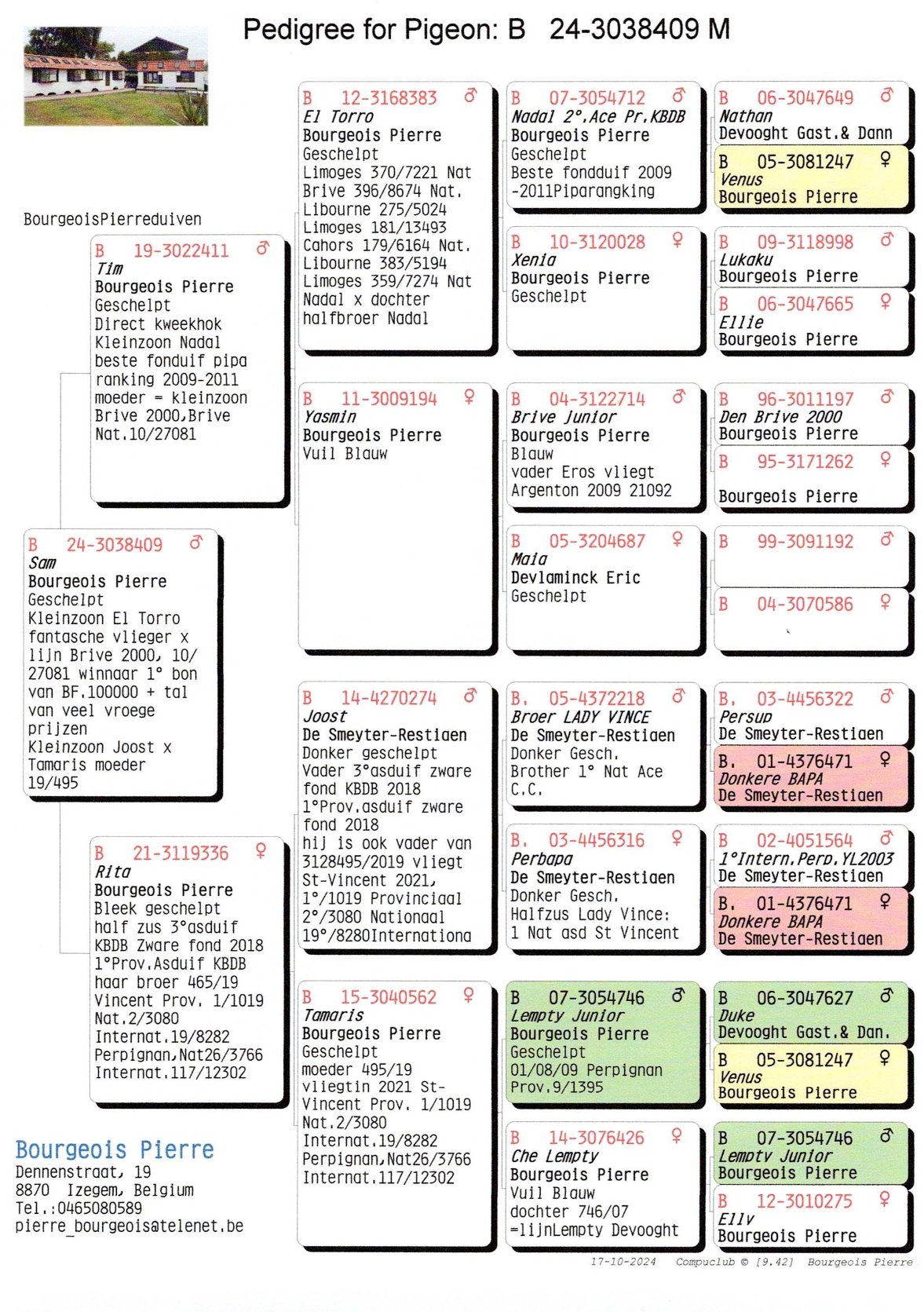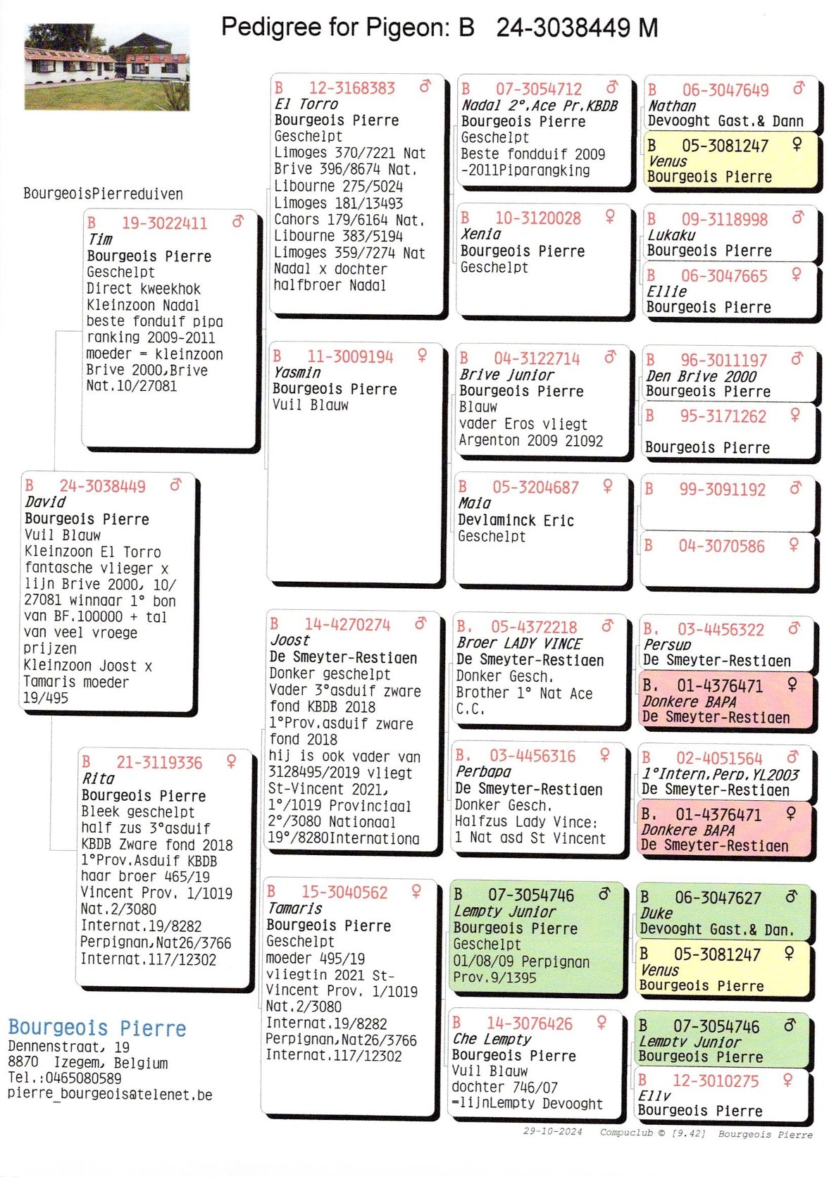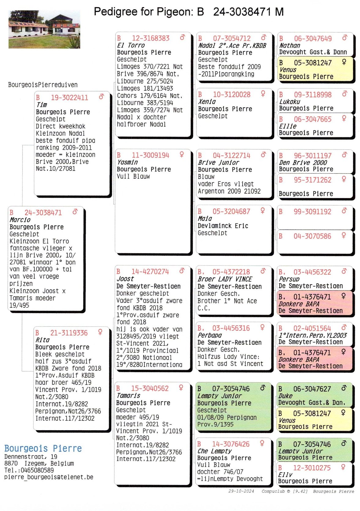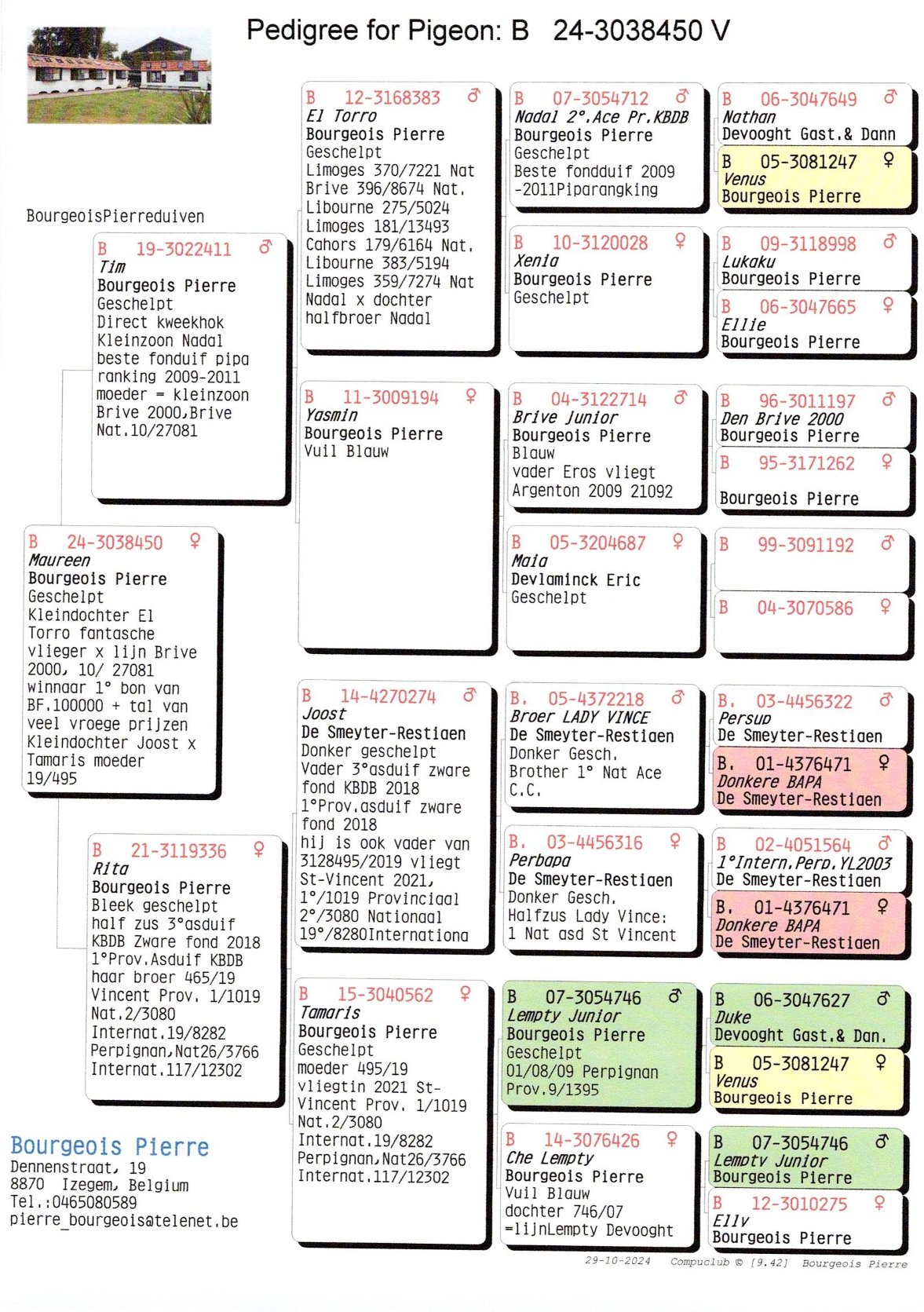 Zoon “El Torro”: Inteelt “Nadal” 1. Beste Fond duif Pipa Ranking 2009-2011, 2. Provinciale Asduif KBDB Fond 2009. Met oa 8./5676 Nationaal Tulle, 69./11869 Nationaal Limoges … x “Yasmin”: Dochter van “Brive Junior” Vader van oa 94./8651 Nationaal Cahors (Deseyn-Vandemeulebroeke x Sonneville) x “Maia” (Devlaminck Erik)